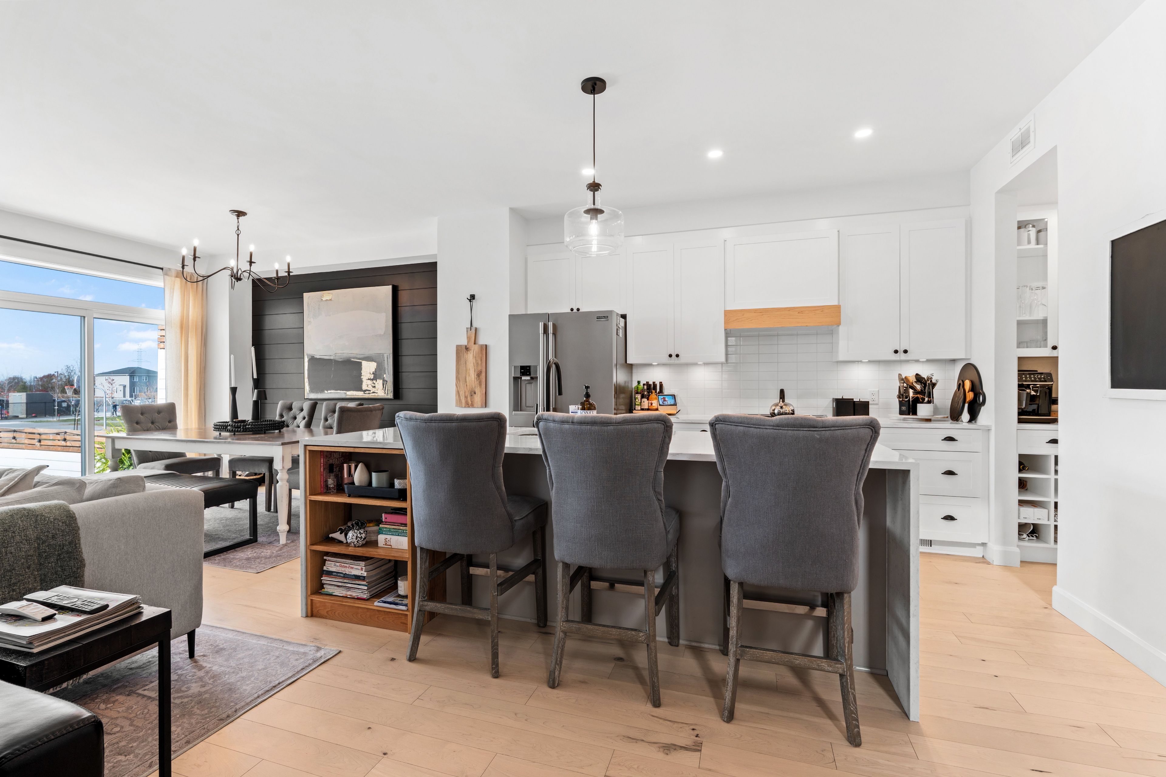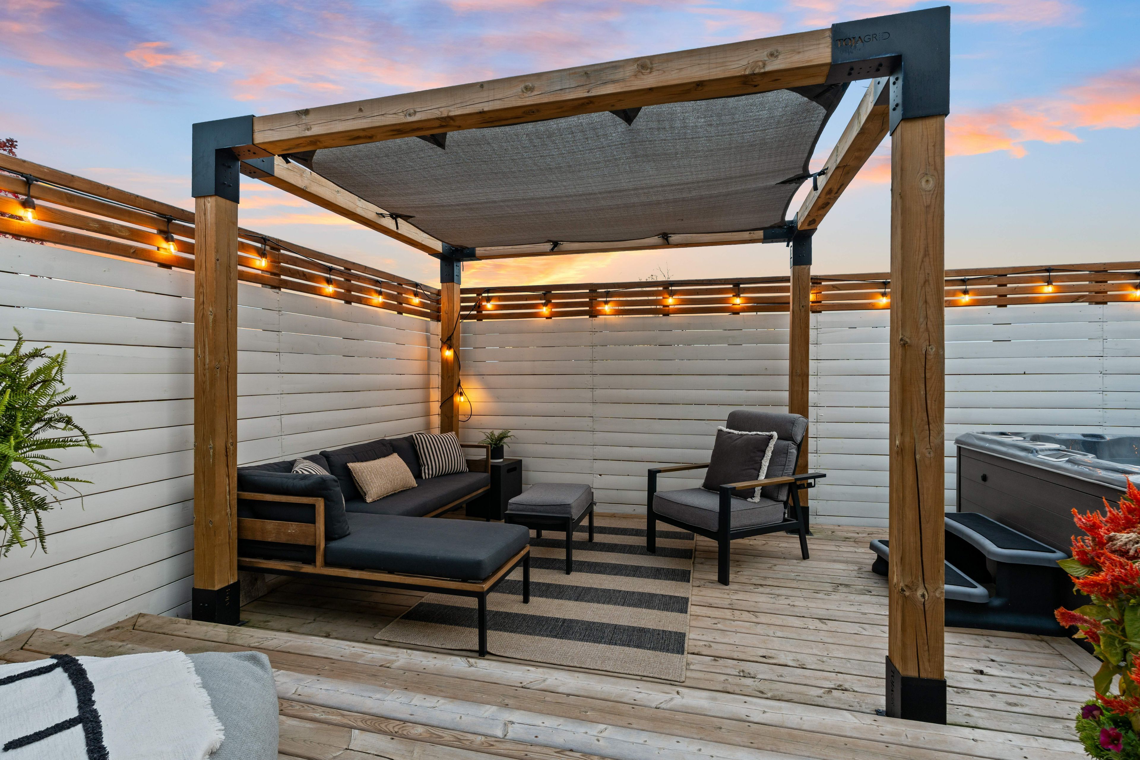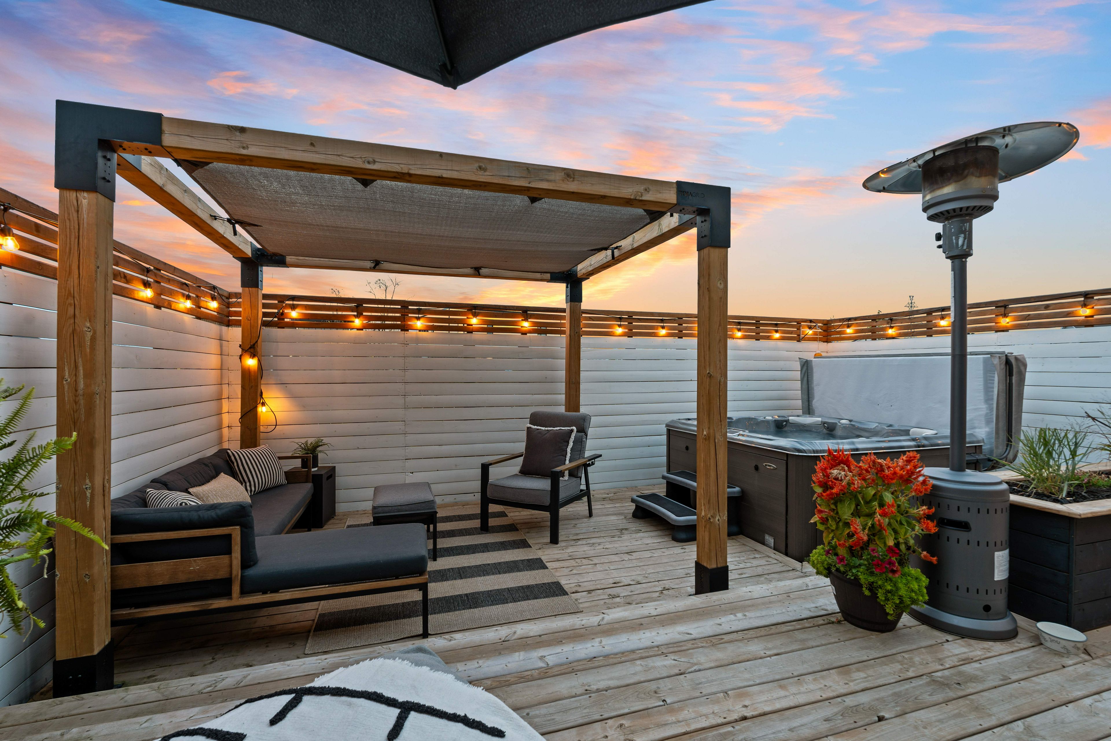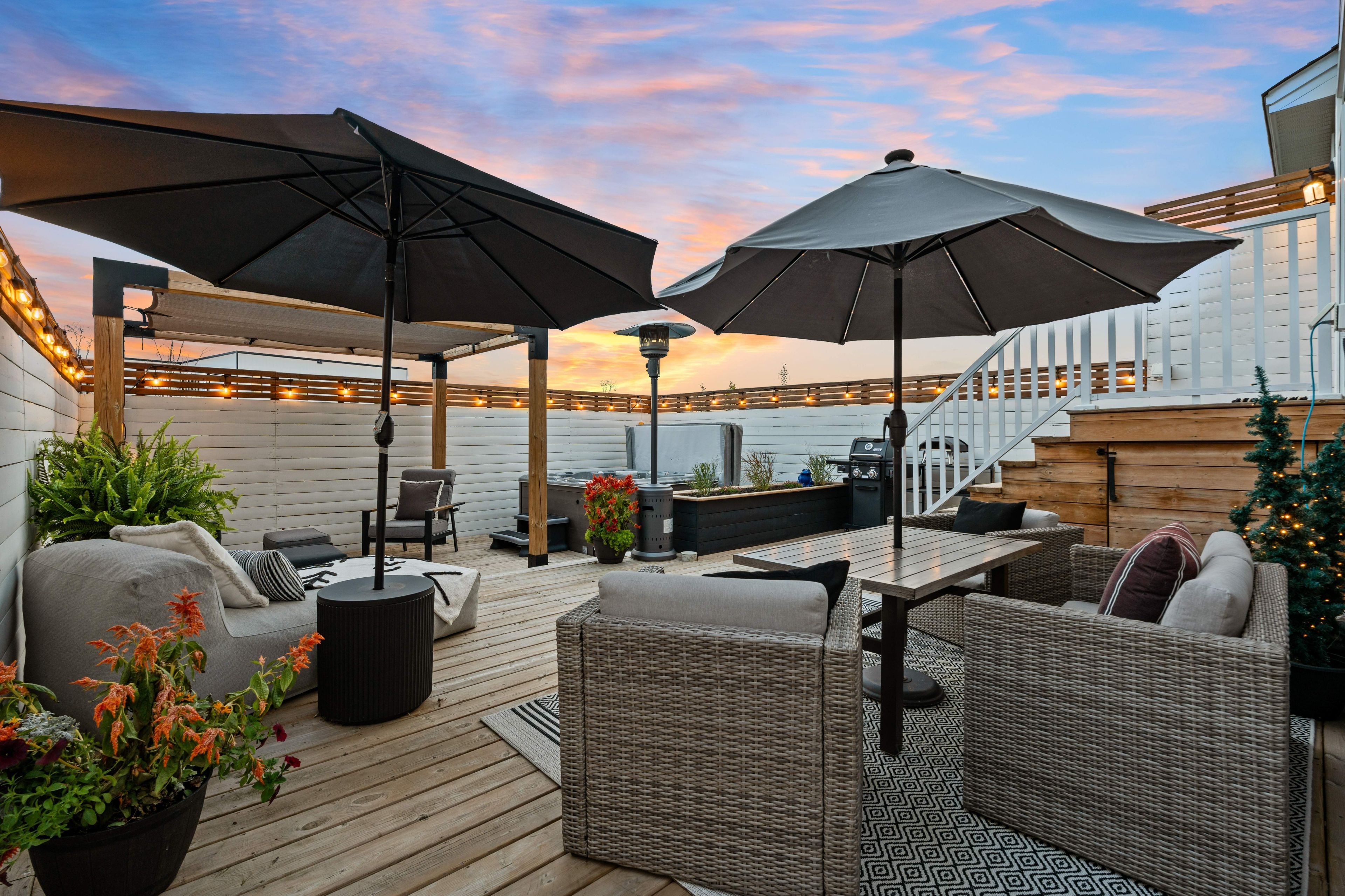 This premium tamarack residence sits on a standout, fully landscaped lot with patio stone, a custom walkway, and manicured gardens that create an inviting entrance. The backyard is a private retreat with a relaxation hot tub, professional turf for low maintenance, illuminated steps, a raised flower garden, a full fence, and an expansive deck with zones for lounging, dining, entertaining, and storage. With the property backing onto st. Genevieve catholic school and a new park and walking paths coming soon, this west-end location delivers long-term convenience and family-friendly appeal. Inside, the home showcases quality craftsmanship and a bright, open main level with maple cabinetry, a custom coffee bar and pantry, quartz countertops, a waterfall island, professional stainless steel appliances, california shutters, and a warm gas fireplace. A beautifully crafted staircase, custom cabinetry, refined finishes, and a stylish powder room elevate the space. The lower level offers a cozy, flexible area for a movie lounge, music space, or children's playroom, plus a rough-in for a future fourth bathroom. Upstairs, the large primary suite features a king-sized layout, walk-in closet, and spa-style ensuite with a soaker tub. A well-designed upper-level laundry room includes quartz counters, a wash sink, cabinets, a folding station, and electrolux appliances. Two additional bedrooms and a four-piece bath complete this level. With 2,200 sq. Ft. Of finished living space, upgraded lighting, an extended driveway, full eavestrough system, celebright exterior lighting, and ev-ready wiring in the garage, this executive townhome blends upscale finishes with modern functionality. A must-see opportunity.