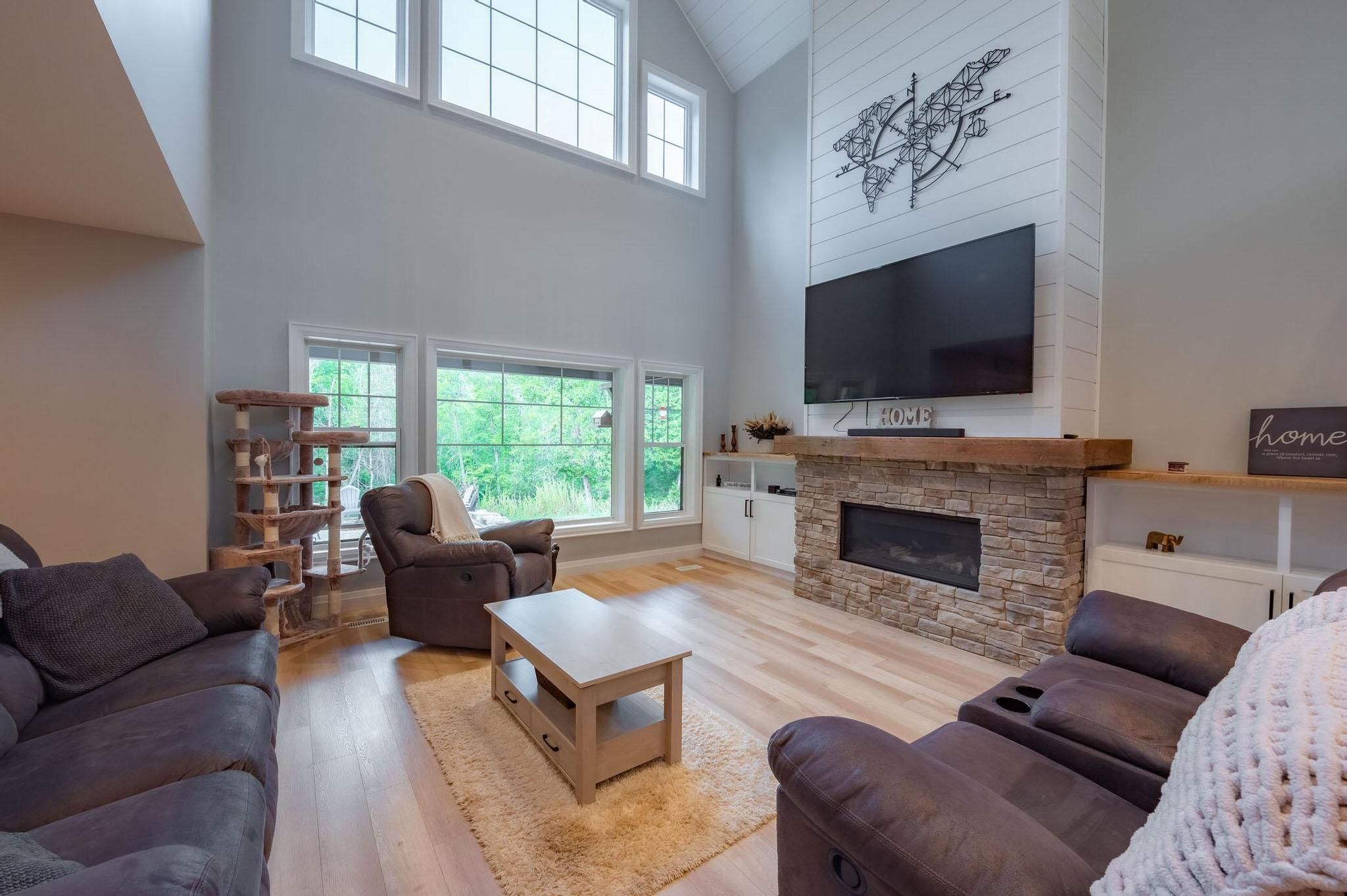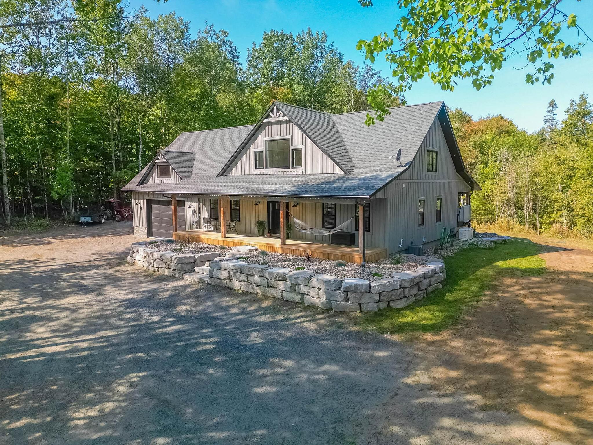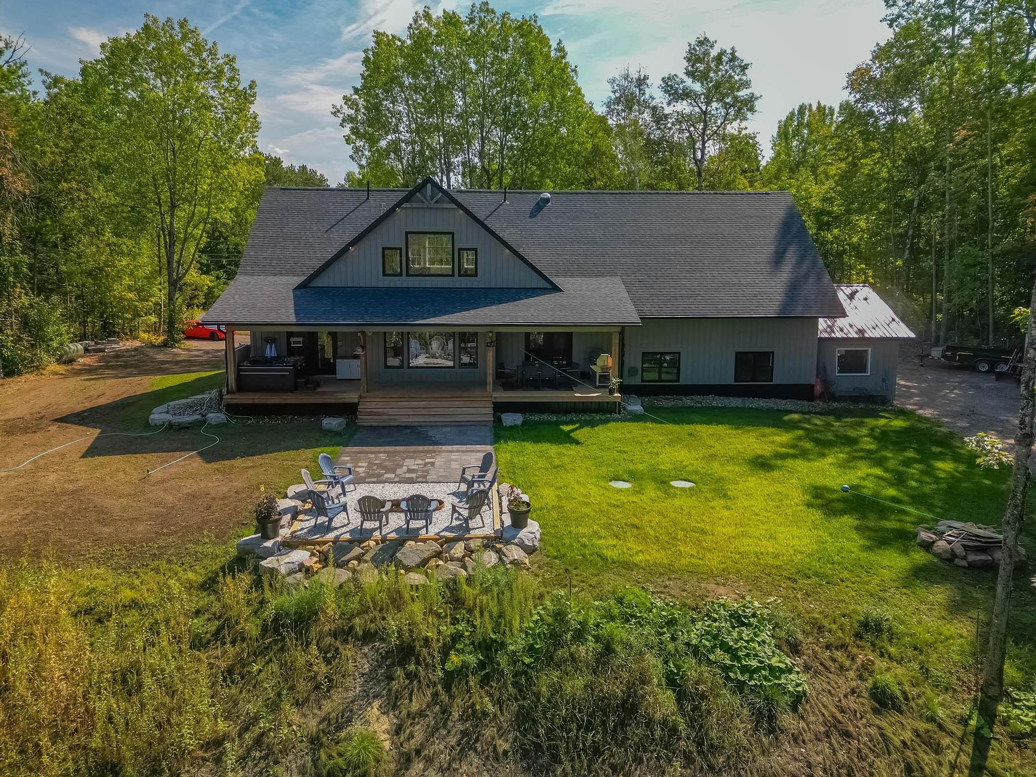 Stunning home or retreat for sale in minden hills! Discover this exceptional opportunity to own a beautiful property just outside of minden. Perfectly blending comfort, style and convenience. Custom built in 2022 this home offers all the new design features along with some unique features! Spacious bright living areas with large windows, propane fireplace with built in cabinets and soaring vaulted ceiling in the great room. Modern kitchen with high-end appliances, leather dolomite counter, gas stove, feature cabinets and two double wide pantries for convenient storage. Three generous bedrooms, including a luxurious primary suite. Main floor primary suite offers a walk out to hot tub on covered deck, 5 x 10 walk in closet, spa style ensuite with soaker claw foot tub, walk in glass shower and double vanity. Open flow concept with dining area opening to covered back porch for outdoor dining. Main floor is completed with a two-piece bathroom and laundry room leading to attached garage. Upstairs find the open loft. Two spacious bedrooms both with walk in closets. Four-piece bathroom. Second bedroom has a unique skylight and opens to family room. Family room is spacious enough for a gym, gathering space and has a second access to garage. Privacy is prime here! Enjoy the backyard, ideal for entertaining or relaxing either on covered porch, open patio, around the firepit or in the two acres. Attached garage is a true man cave with in floor heating, work benches, pool table and walk out to attached shed. Circular driveway and additional parking around the house. Energy-efficient throughout the home. Conveniently located in a friendly neighbourhood. This home offers easy access to local lakes, schools, parks a shopping. Whether you are commuting, moving here full time or exploring all that haliburton highlands has to offer, everything is just moments away. Schedule your private viewing and take the first step towards making this wonderful property your new home or retreat!