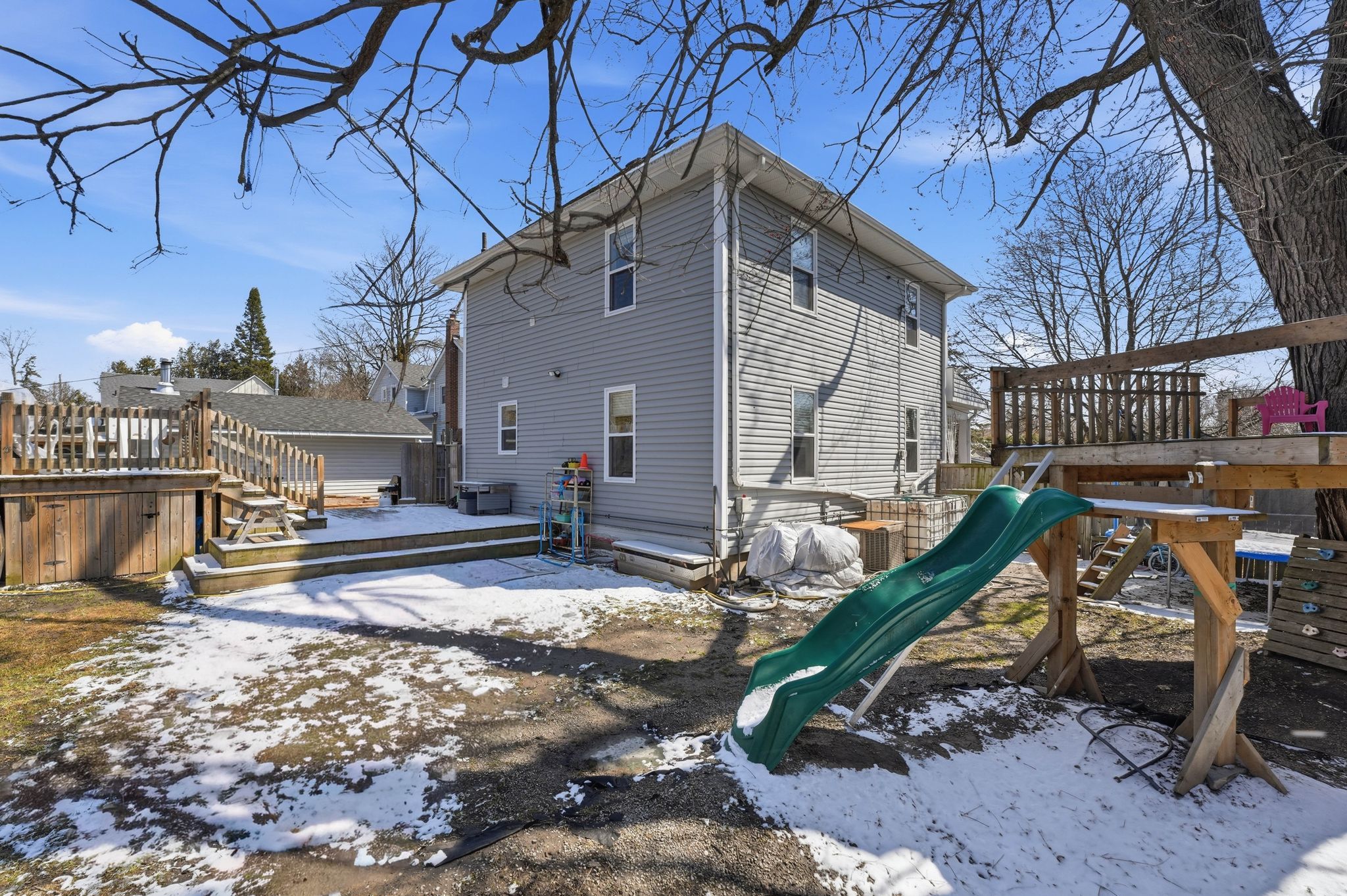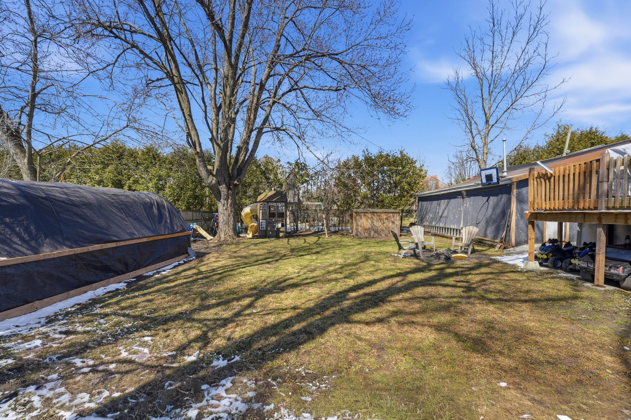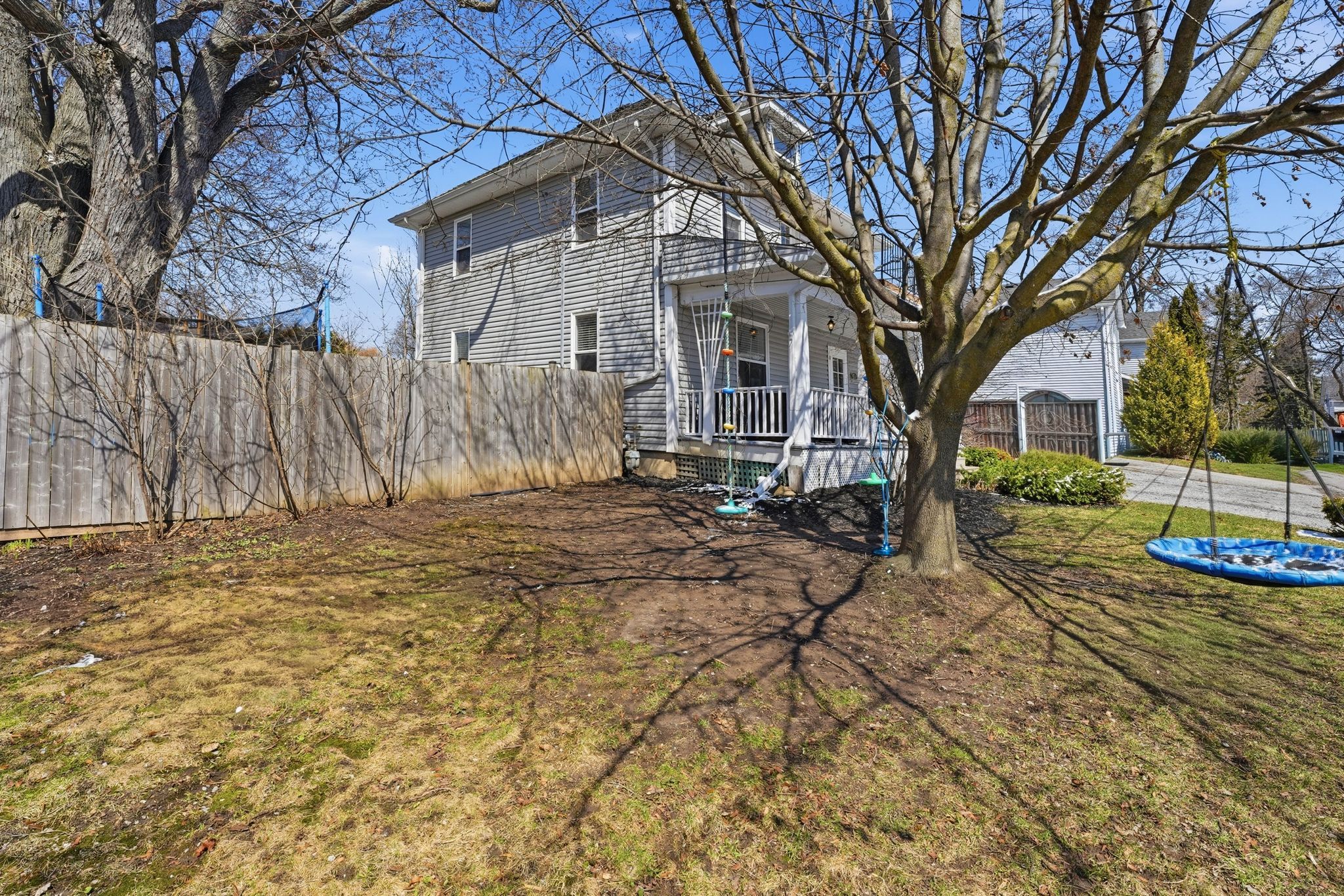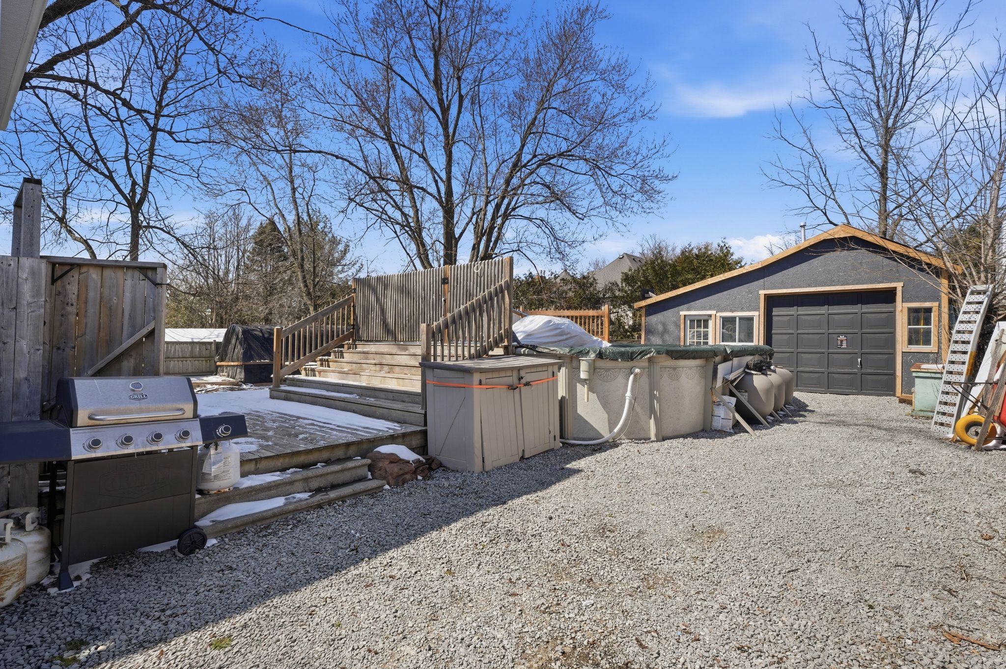 • Large yard with mature trees and a saltwater above-ground pool.