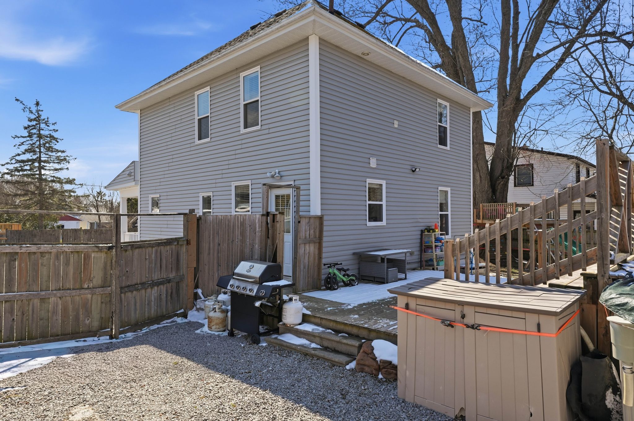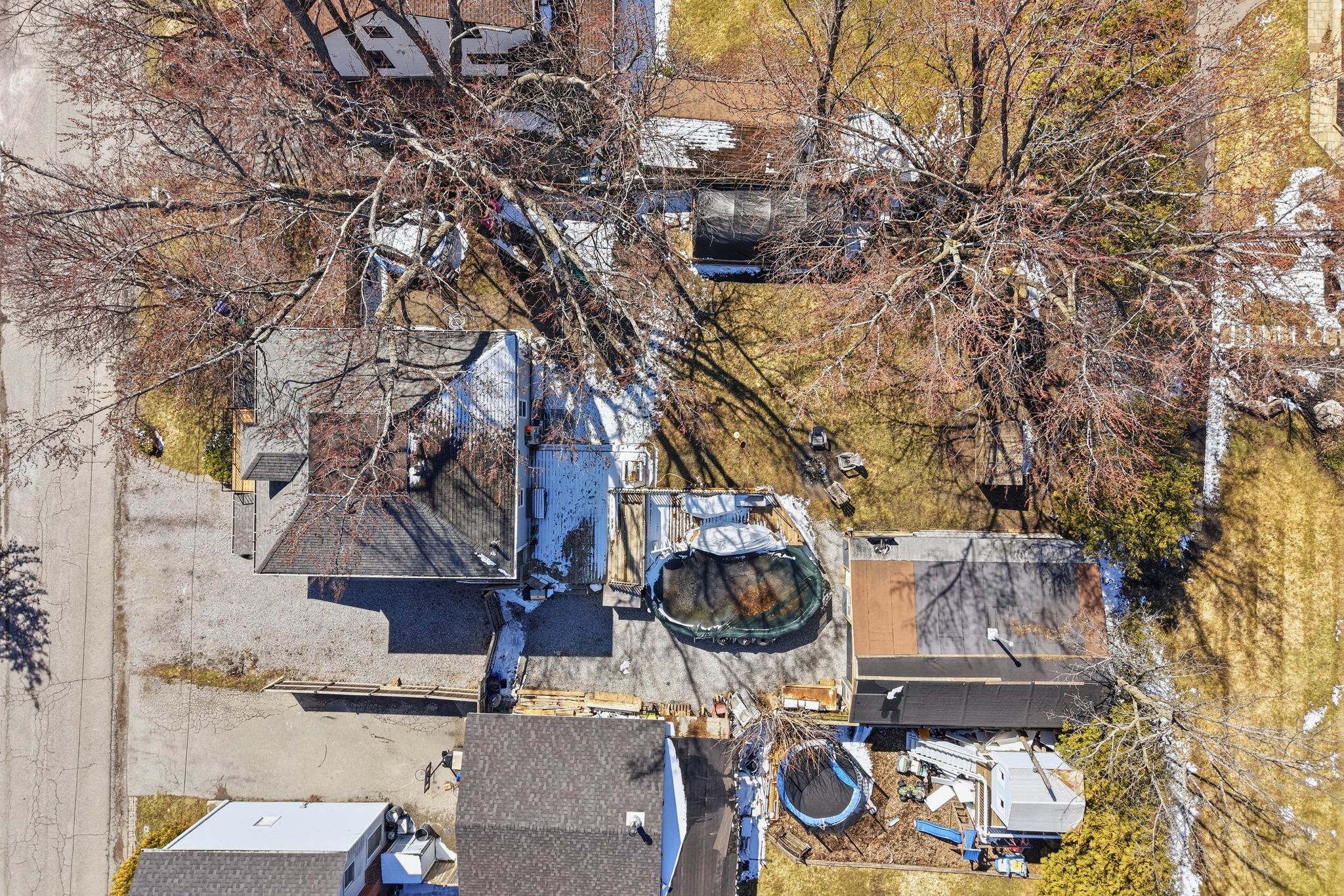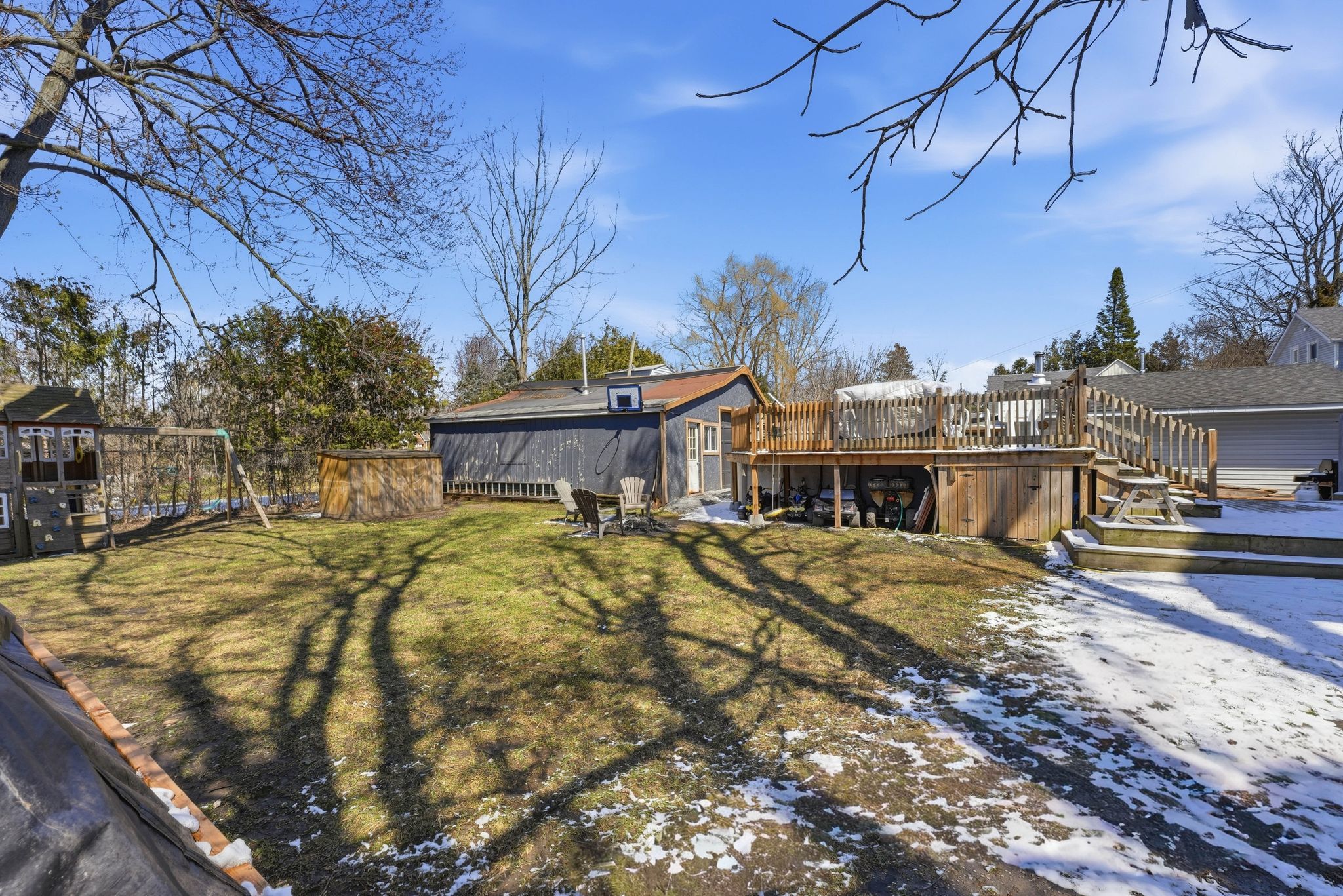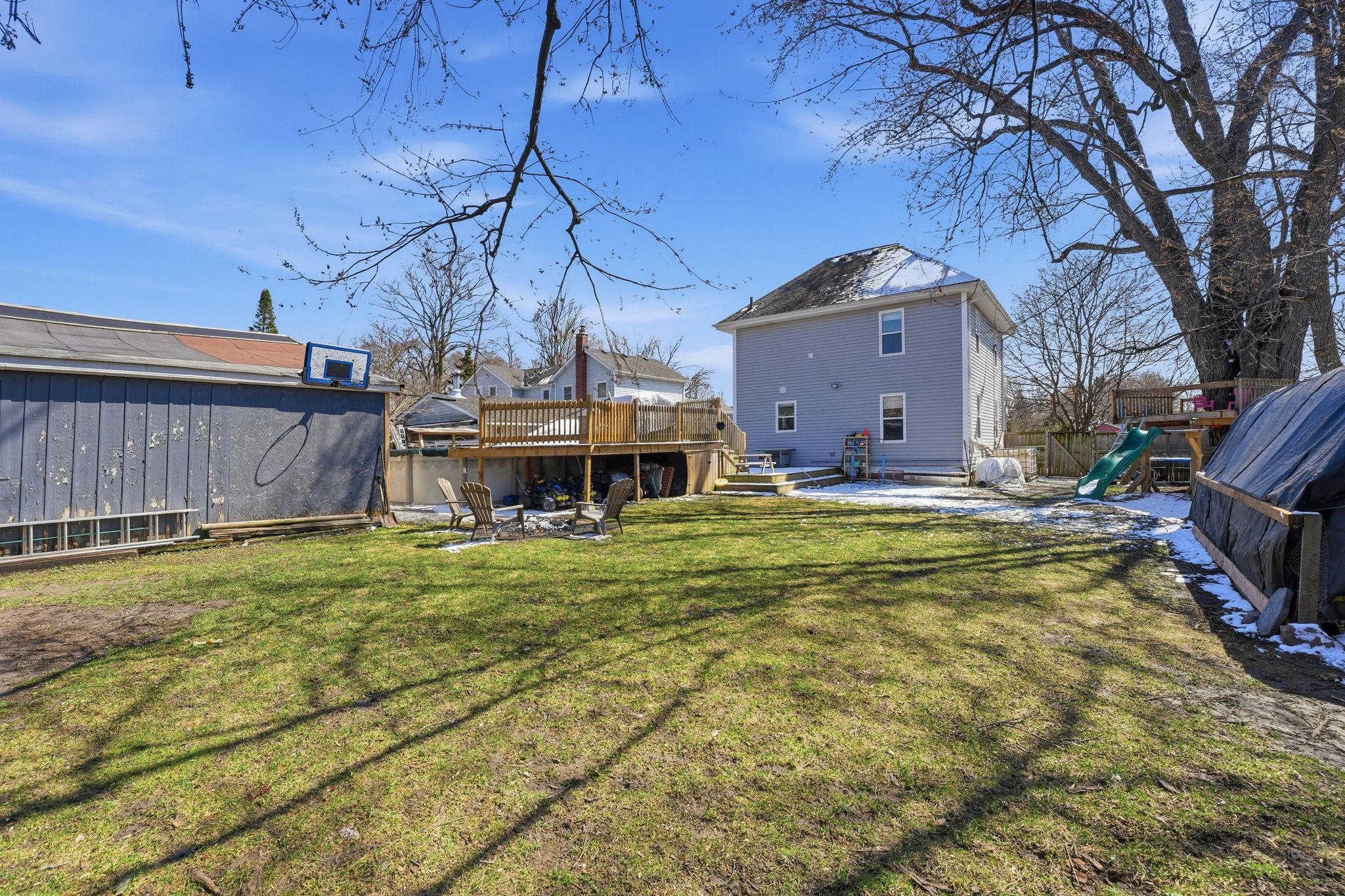 • Large yard with mature trees and a saltwater above-ground pool.