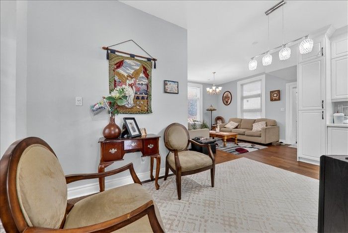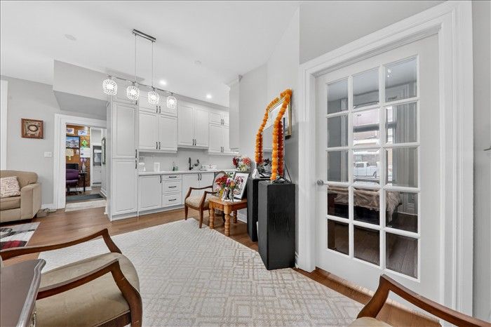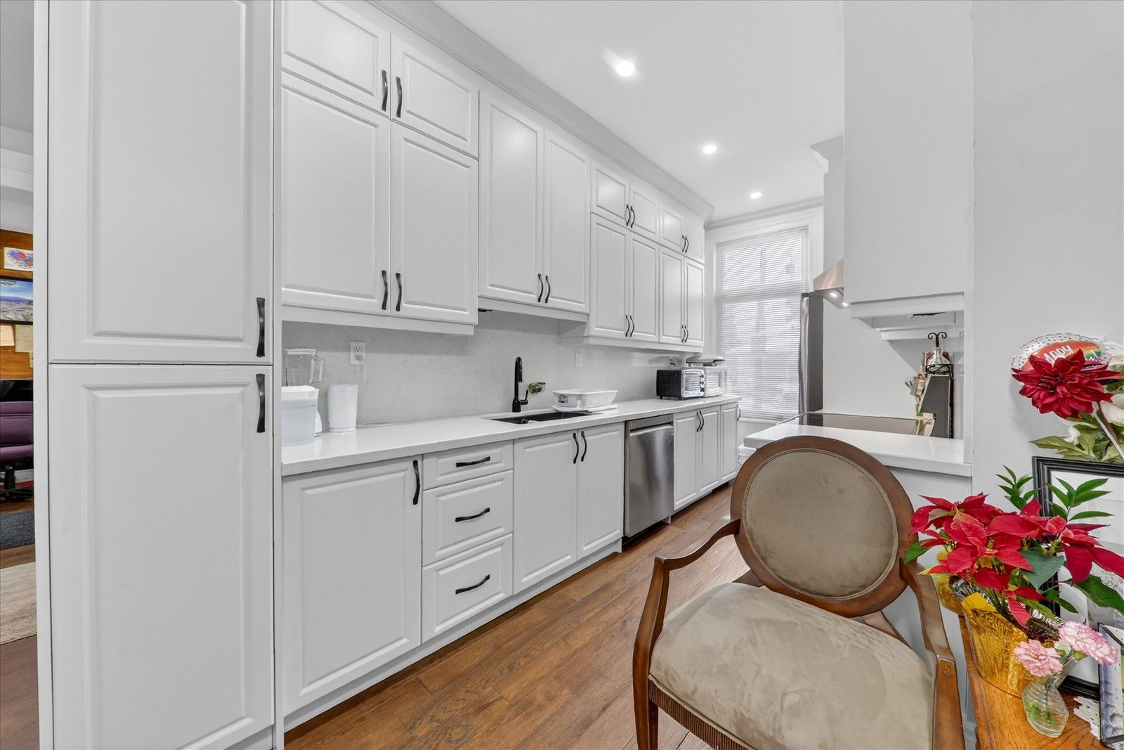 • Fresh kitchen with quartz countertops and hardwood flooring.