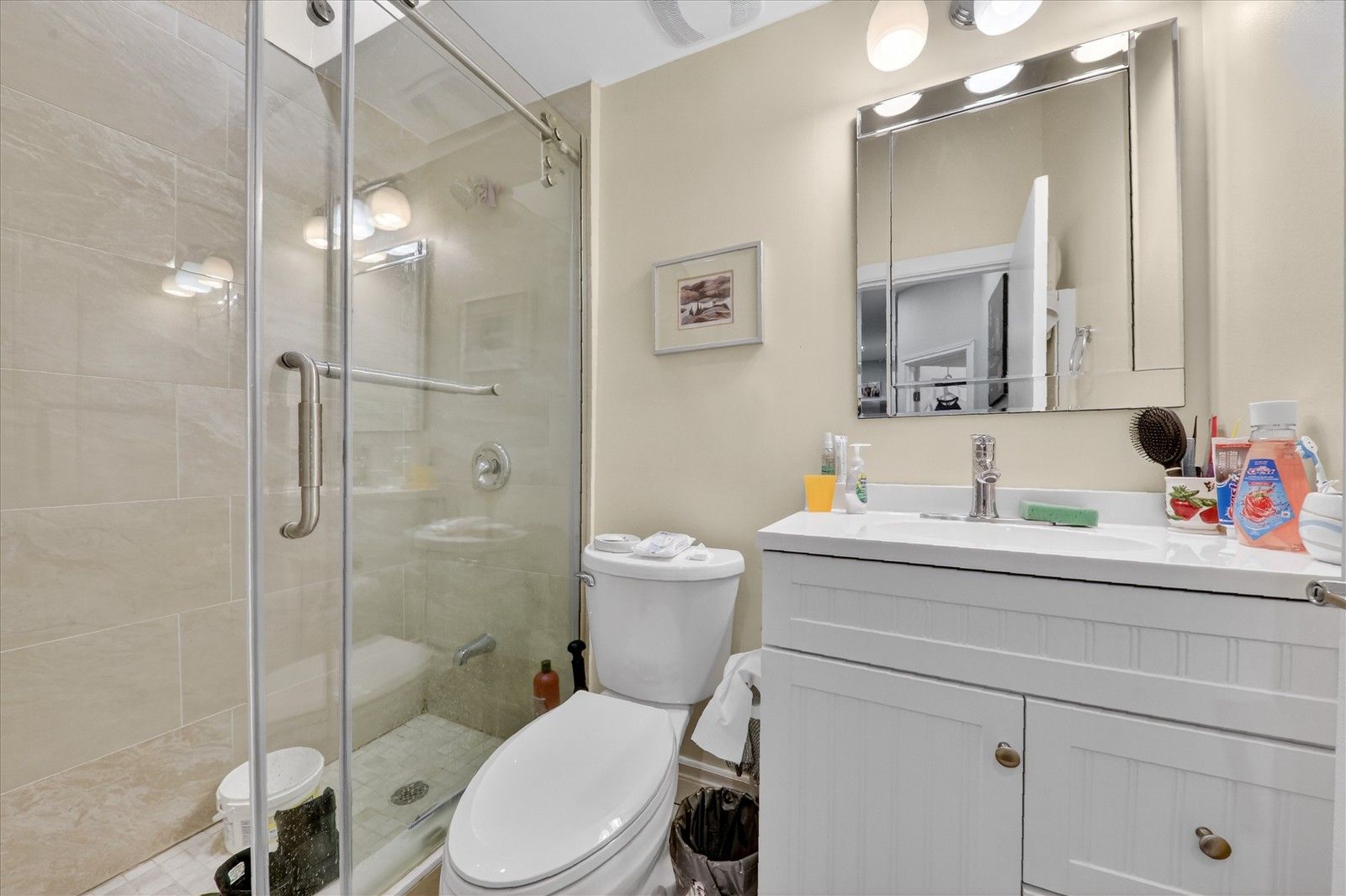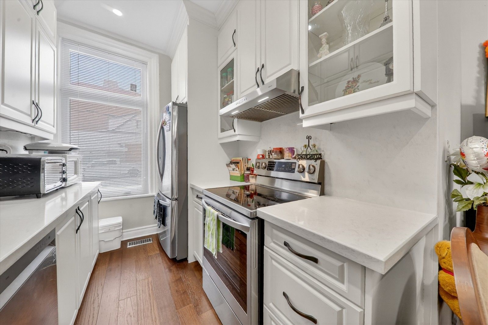 • Fresh kitchen with quartz countertops and well-maintained hardwood flooring.