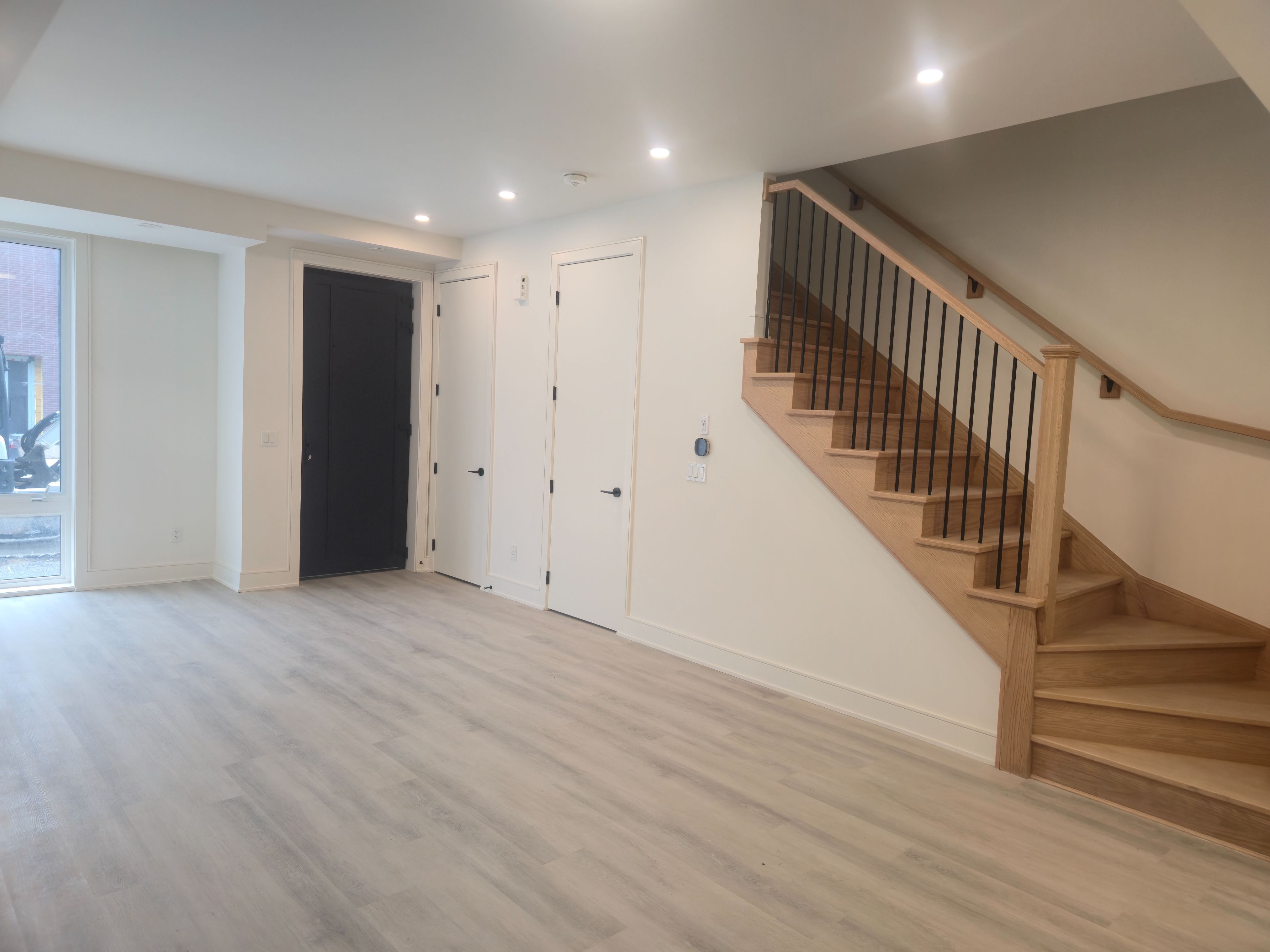 • Open-concept layout with high ceilings and luxury vinyl plank flooring.