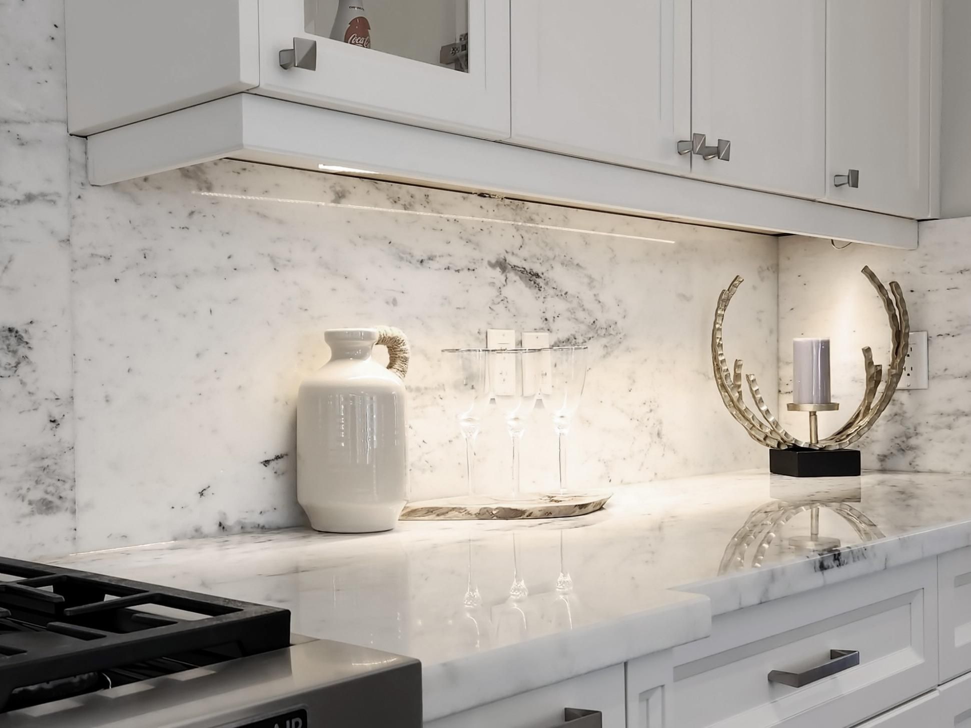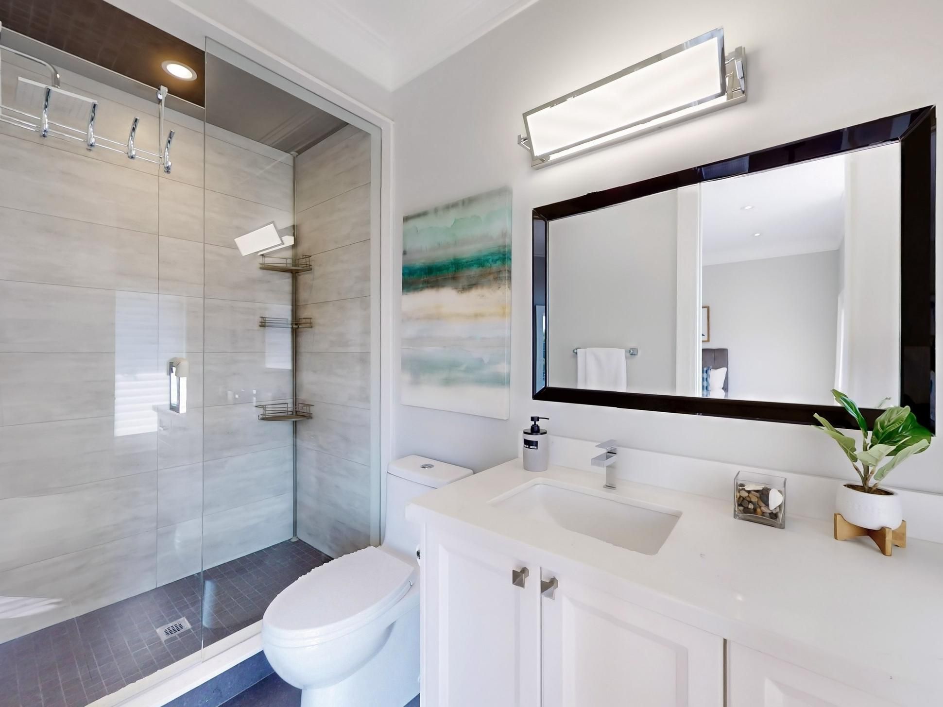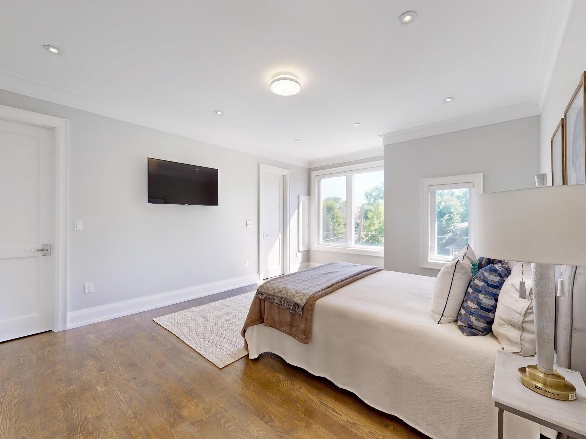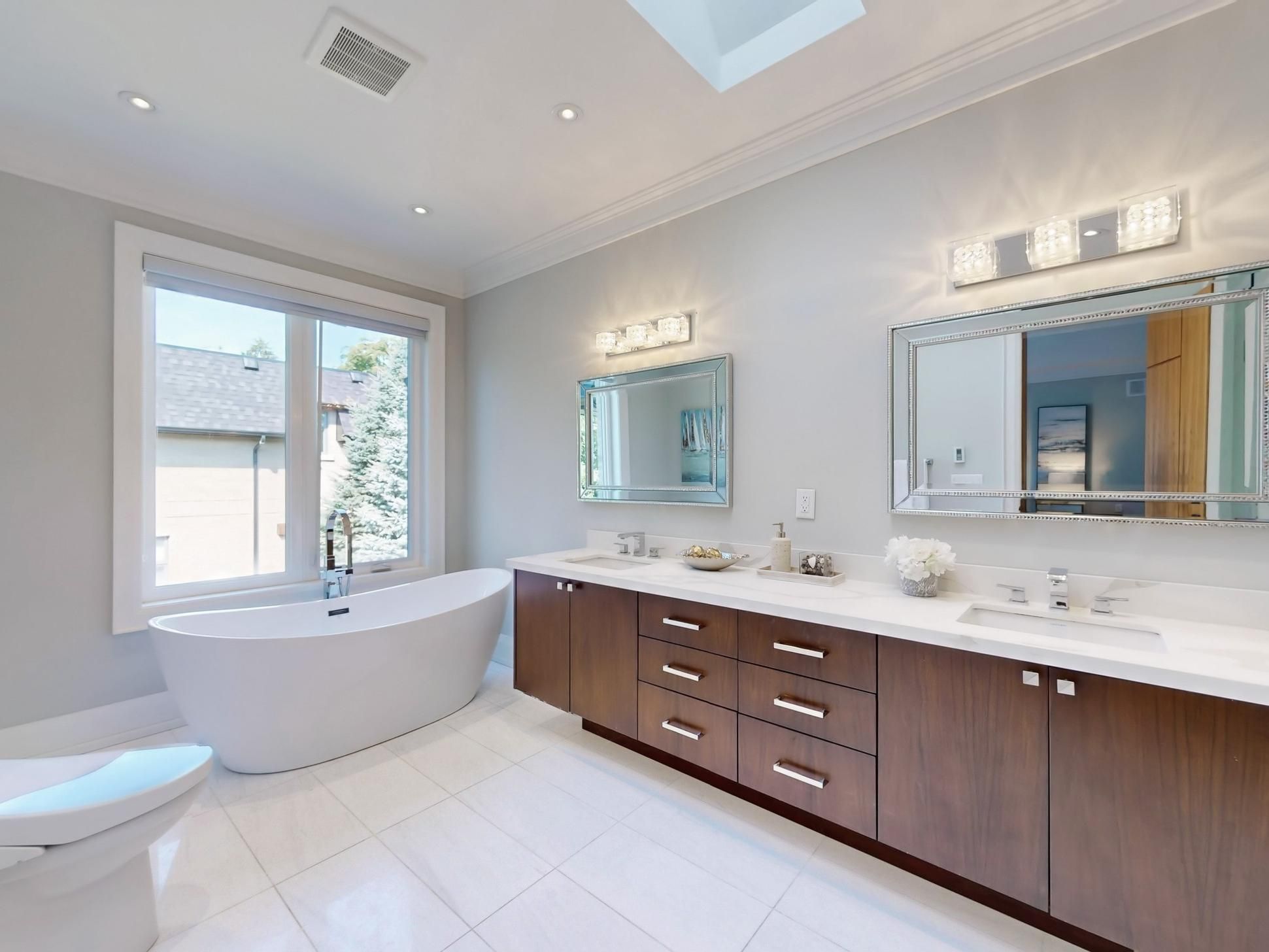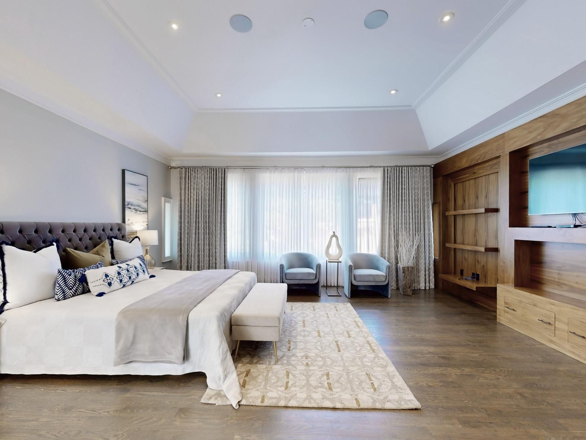 • Master suite features skylight, heated floors, and custom cabinetry.