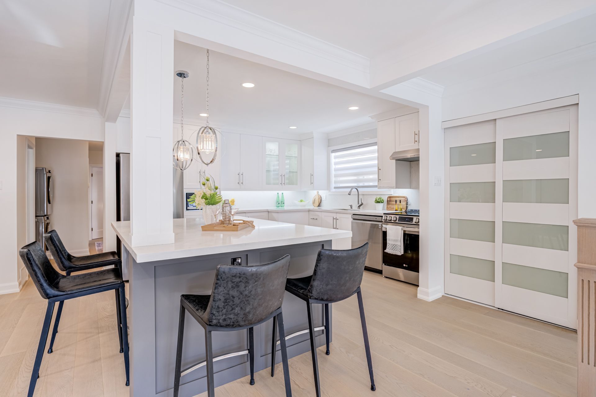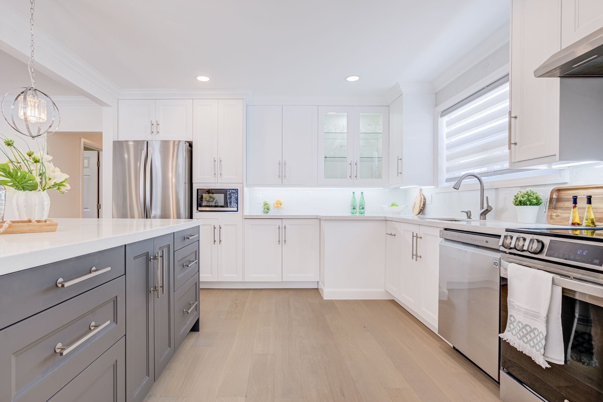 • Modern kitchen with quartz island and stainless steel appliances.