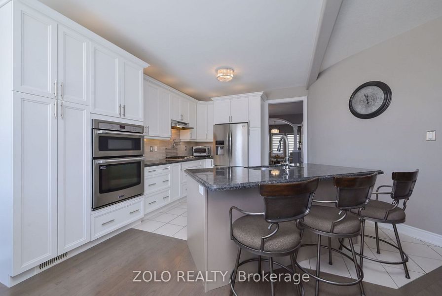 • Custom eat-in kitchen with direct access to a fenced backyard and stone patio.