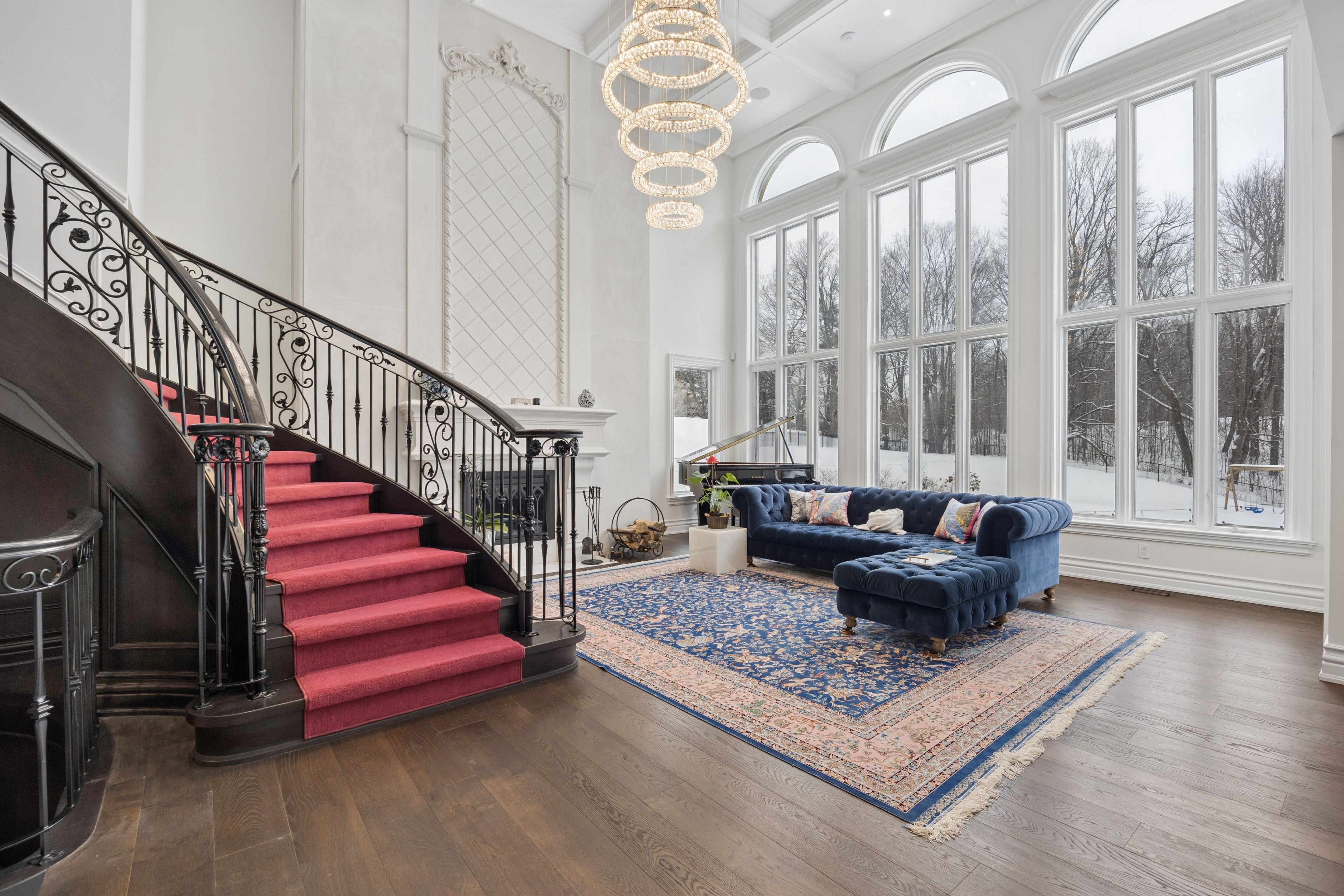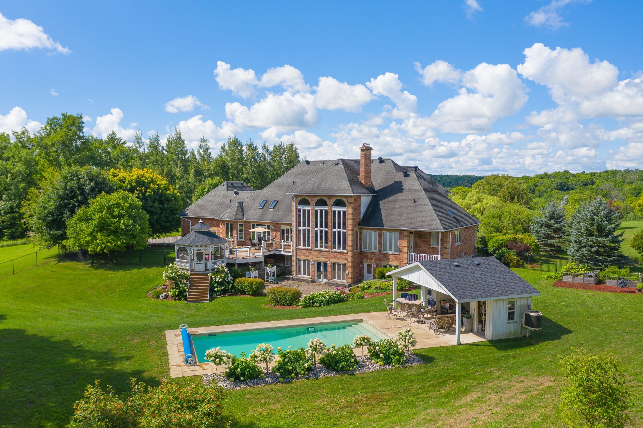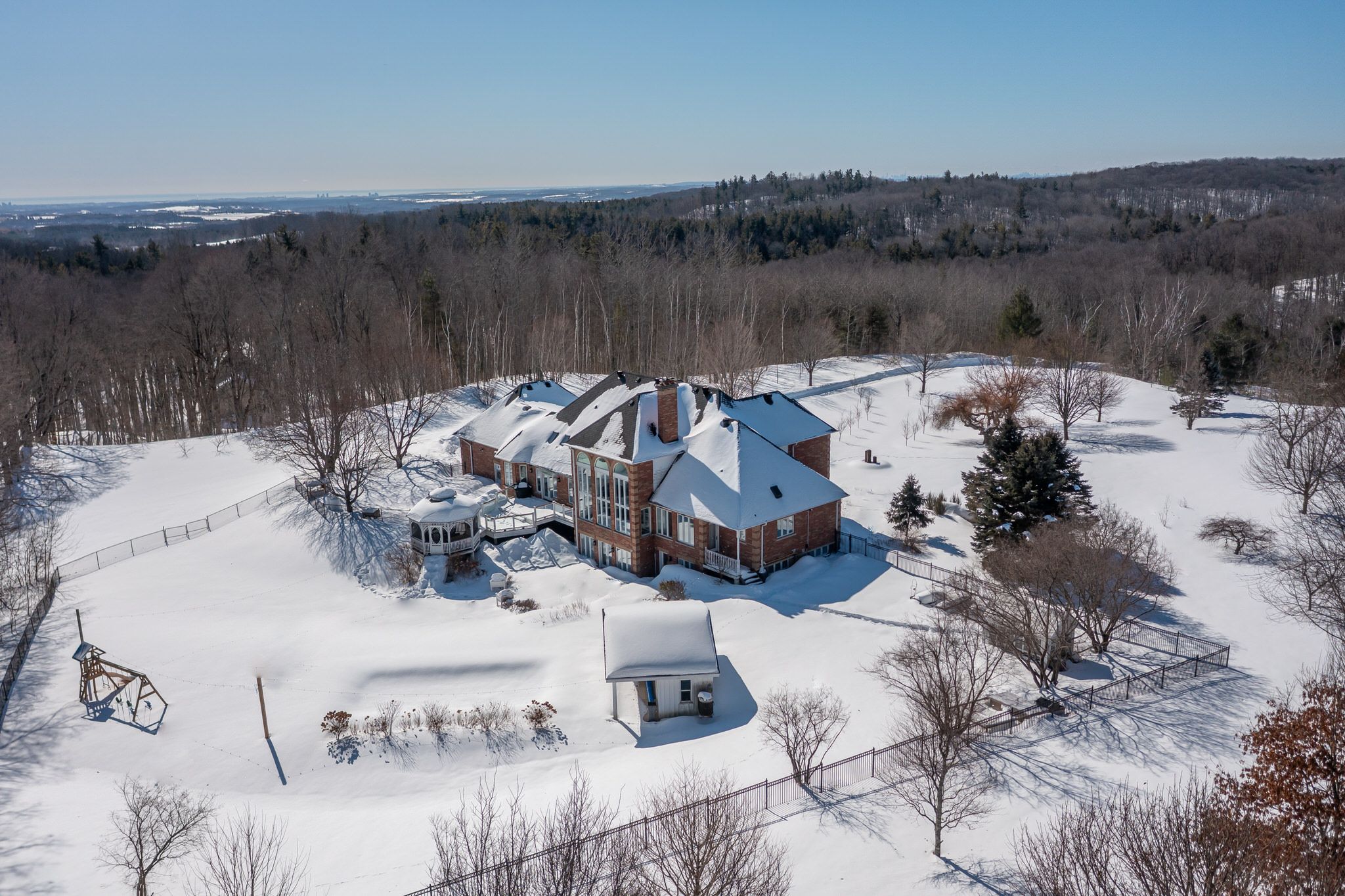 A rare offering in sought-after glen major, this nearly 22-acre private estate blends luxury w/ protected forest & rolling fields, just minutes to trails, golf, ski resorts & daily amenities. A winding tree-lined drive leads to the hilltop residence, extensively redesigned and renovated. Custom exterior detailing and arched mahogany double doors open to a dramatic great room with 18-ft coffered ceilings, statement lighting, floor-to-ceiling windows, and a soaring cast stone fireplace. Mahogany hdwd and rich millwork elevate the main level. The chef's kitchen features a stunning 60" wolf dual oven range and cabinet matched dacor fridge & freezer as well as premium miele dw, microwave-oven & cappuccino maker, custom cabinetry, an oversized island and walkout to a deck & gazebo. A hidden pantry connects to the formal dining room overlooking the fire & water feature and cherry blossoms. A private office offers wood paneling, coffered ceiling, and built-ins. The primary suite is a retreat with fireplace, w/o to the grounds, dressing room, and a 6-pc spa-inspired ensuite with dual steam shower and smart toilet. Upstairs offers spacious bedrooms with walk-ins, renovated baths, and a custom dressing room. The finished w/o lower level includes a self-contained one-bedroom suite with private entrance, kitchen, and 4-pc bath, ideal for in-laws or multi-generational living. A rec-room with fireplace and wall-to-wall windows, games room, glass-enclosed gym, and theatre complete the space. A separate two-car garage with office/bonus room, kitchenette and 3-pc bath adds flexibility. Resort-style grounds feature an inground pool with deck jets, cabana, orchards, landscape lighting, and 24kw generac generator. Smart home integration with control4 & upgraded hvac systems complete the home. Enjoy true privacy just minutes to uxbridge amenities and approximately 12 minutes to the 407. An exceptional opportunity to own a private retreat without compromising convenience. Welcome home!