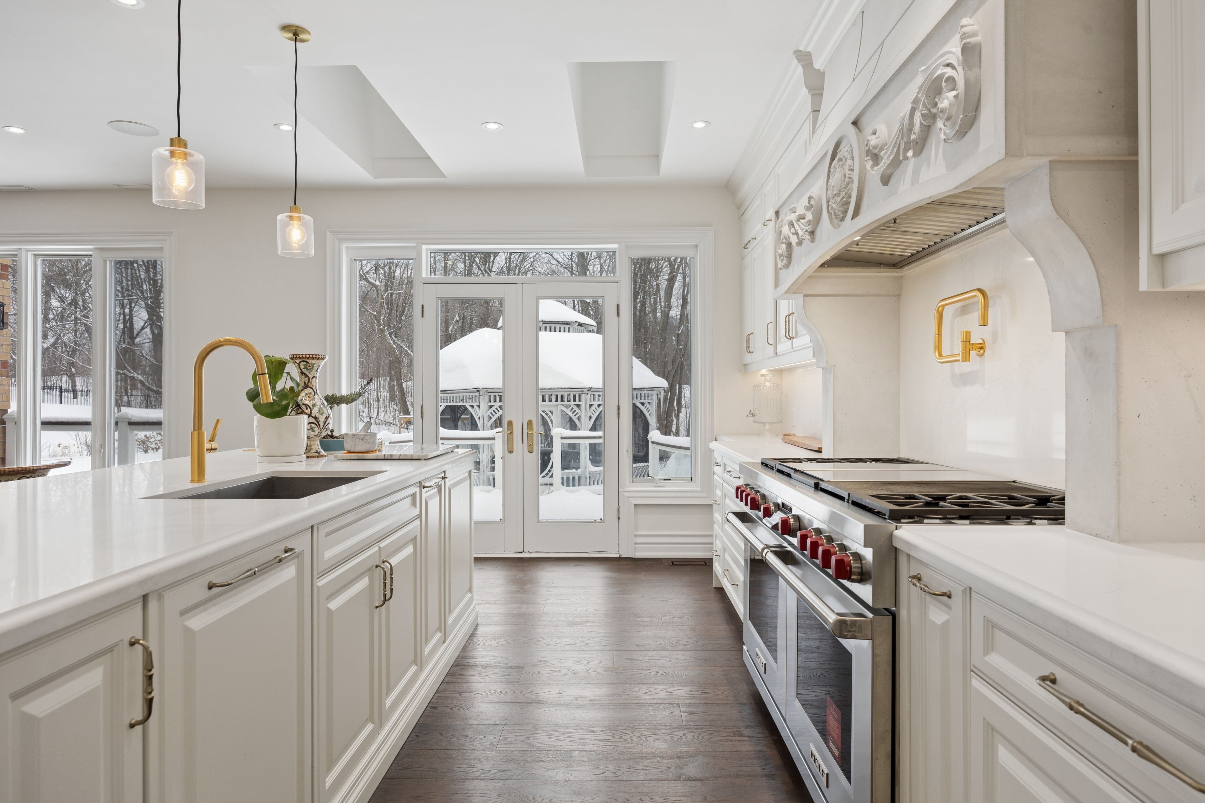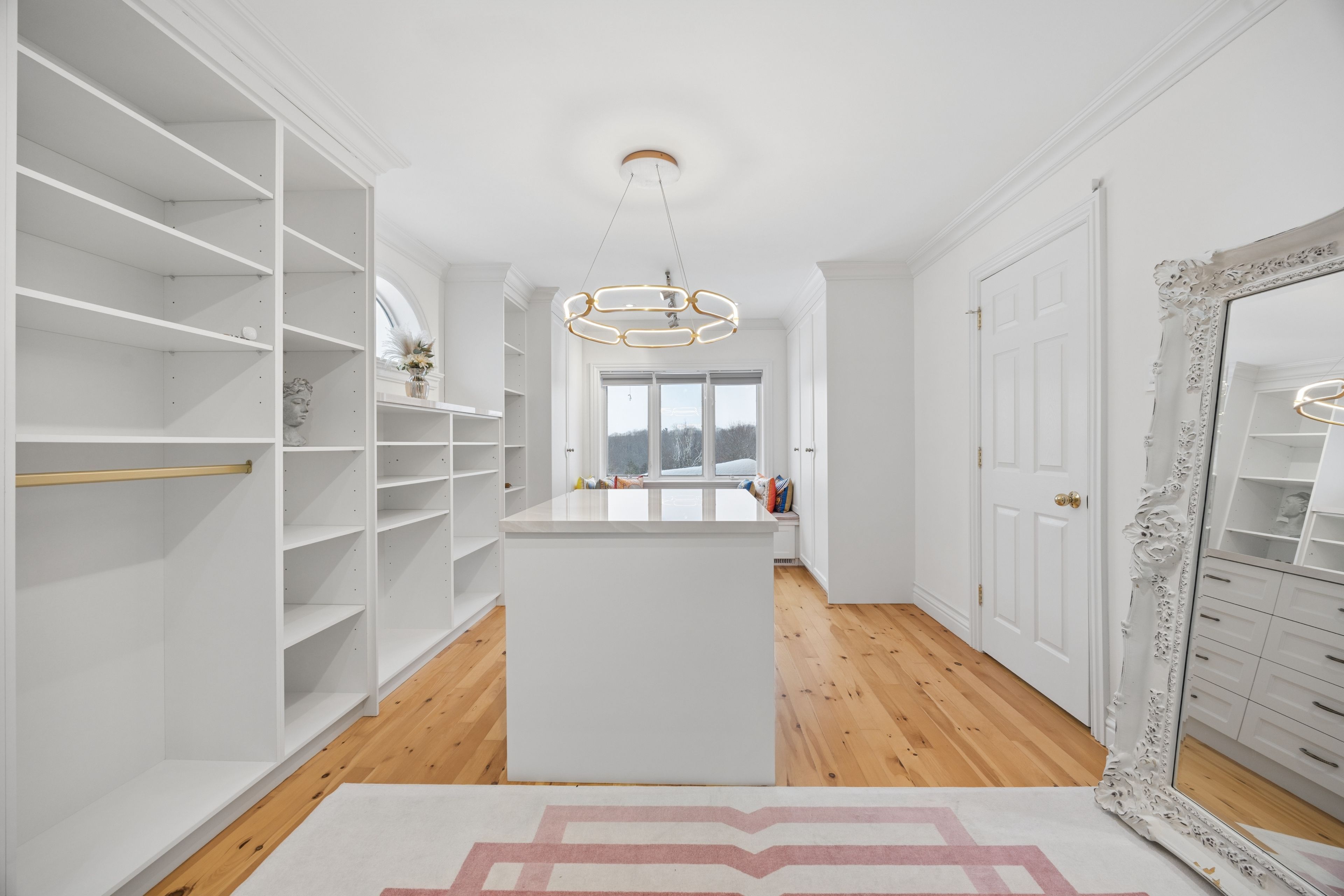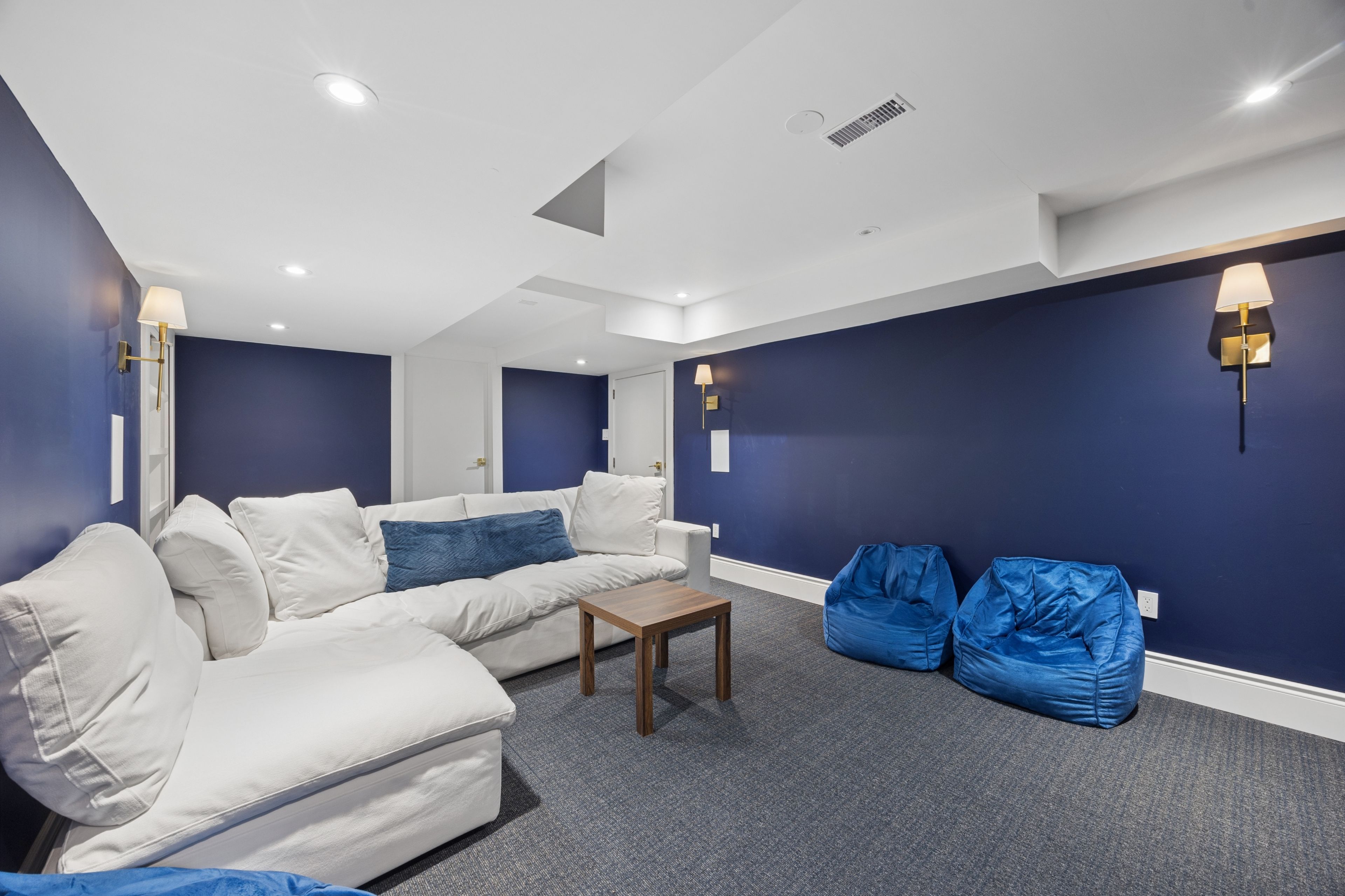 • Finished lower level includes suite for in-laws, gym, and home theater.