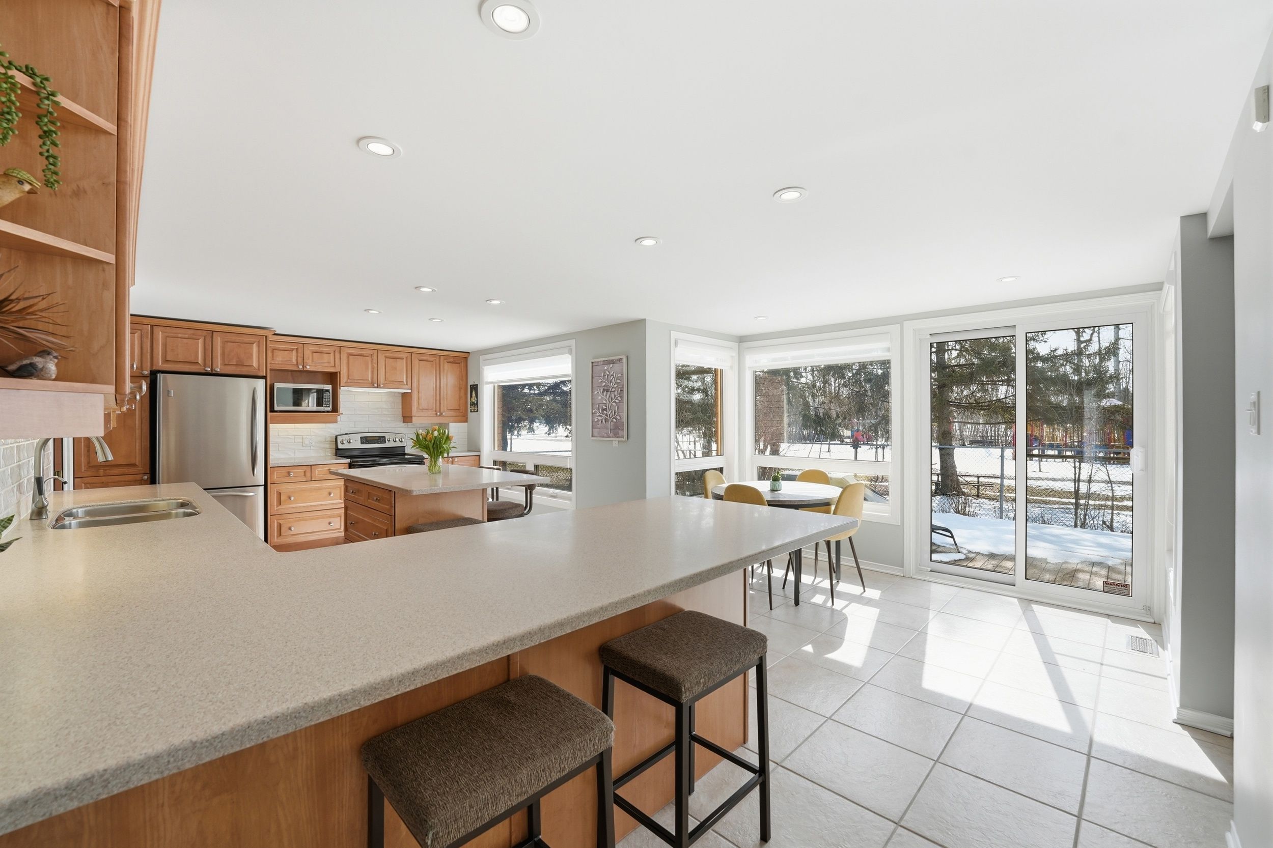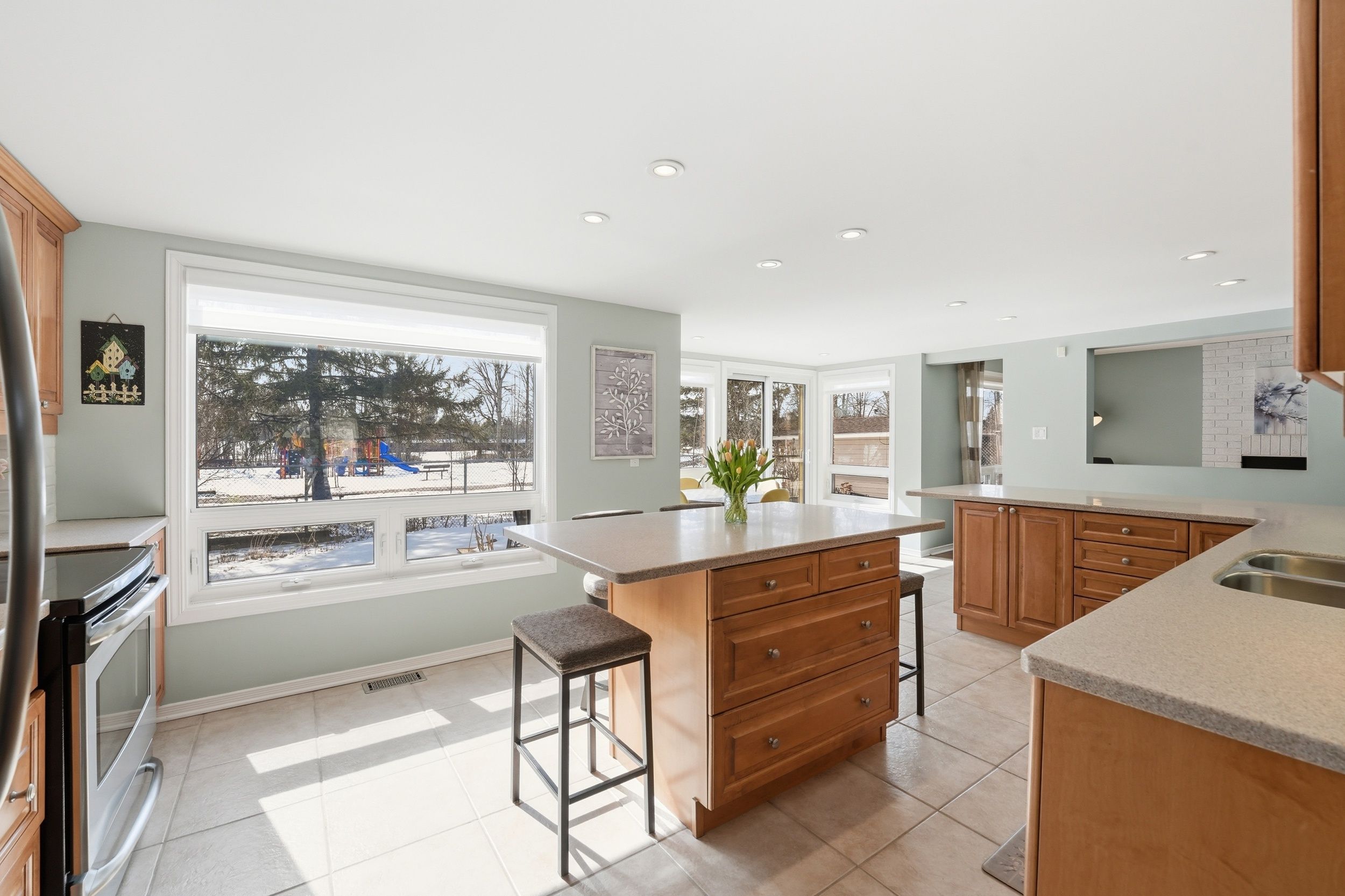 • Eat-in kitchen features rich wood cabinetry and oversized windows.