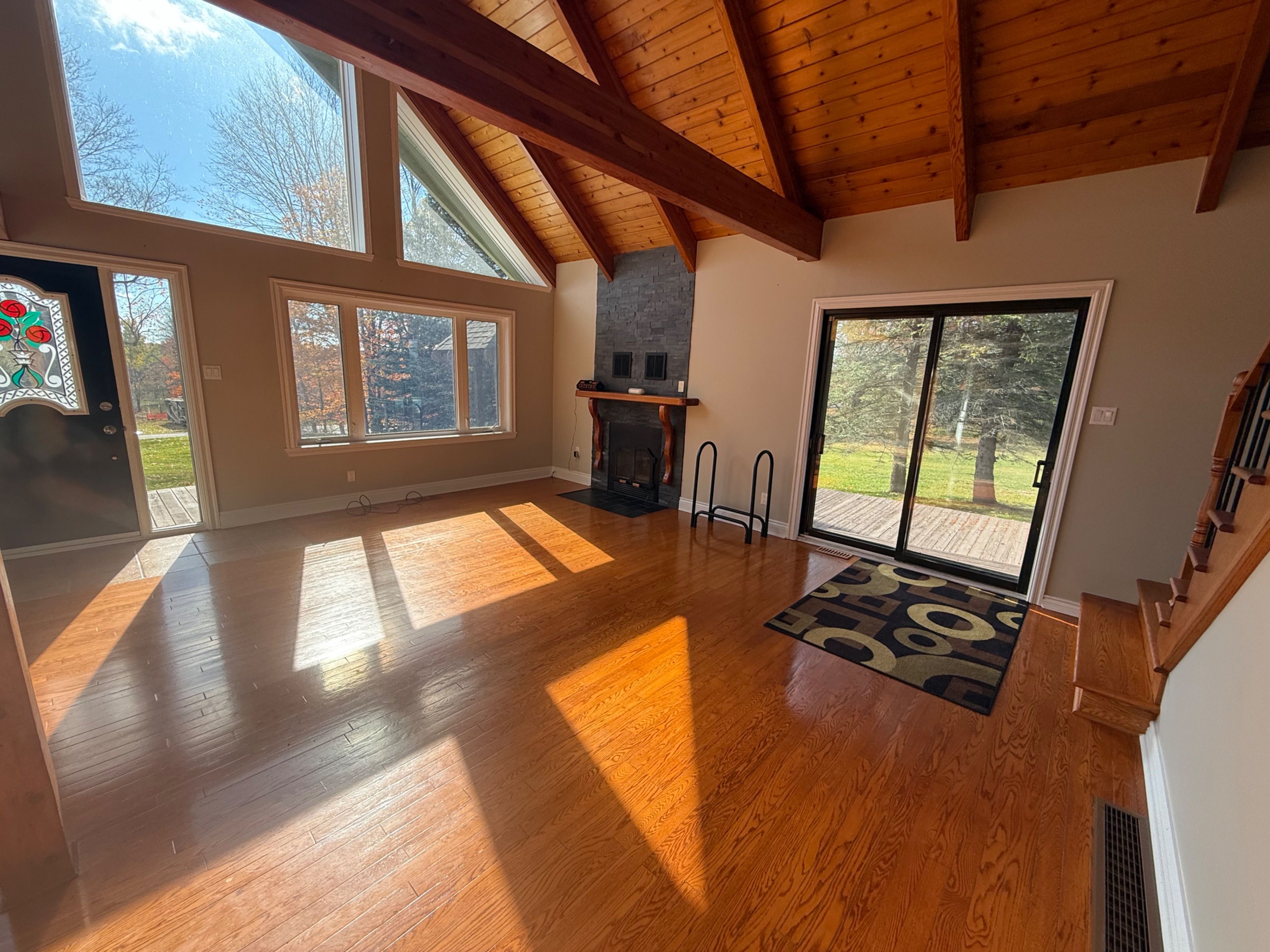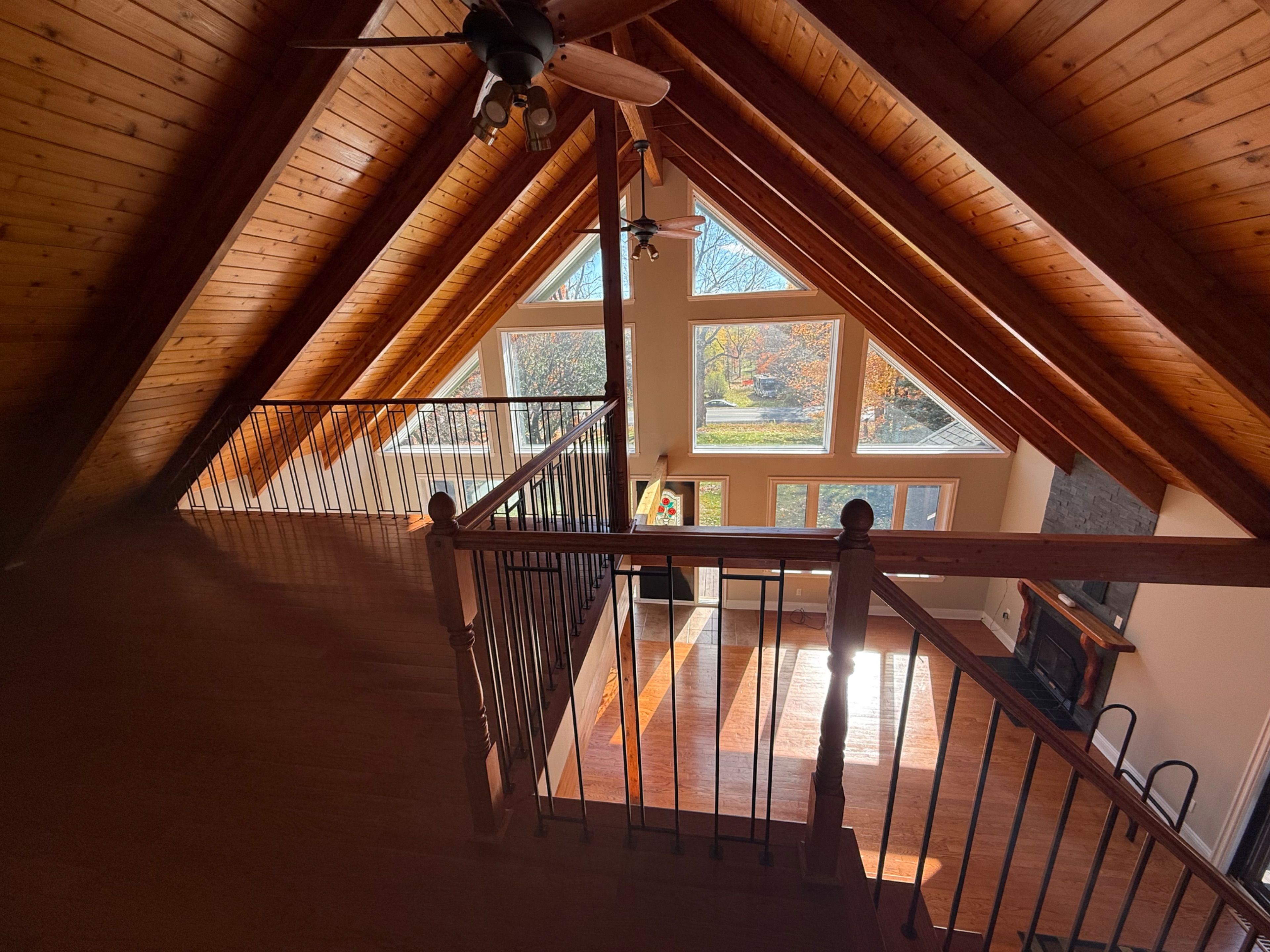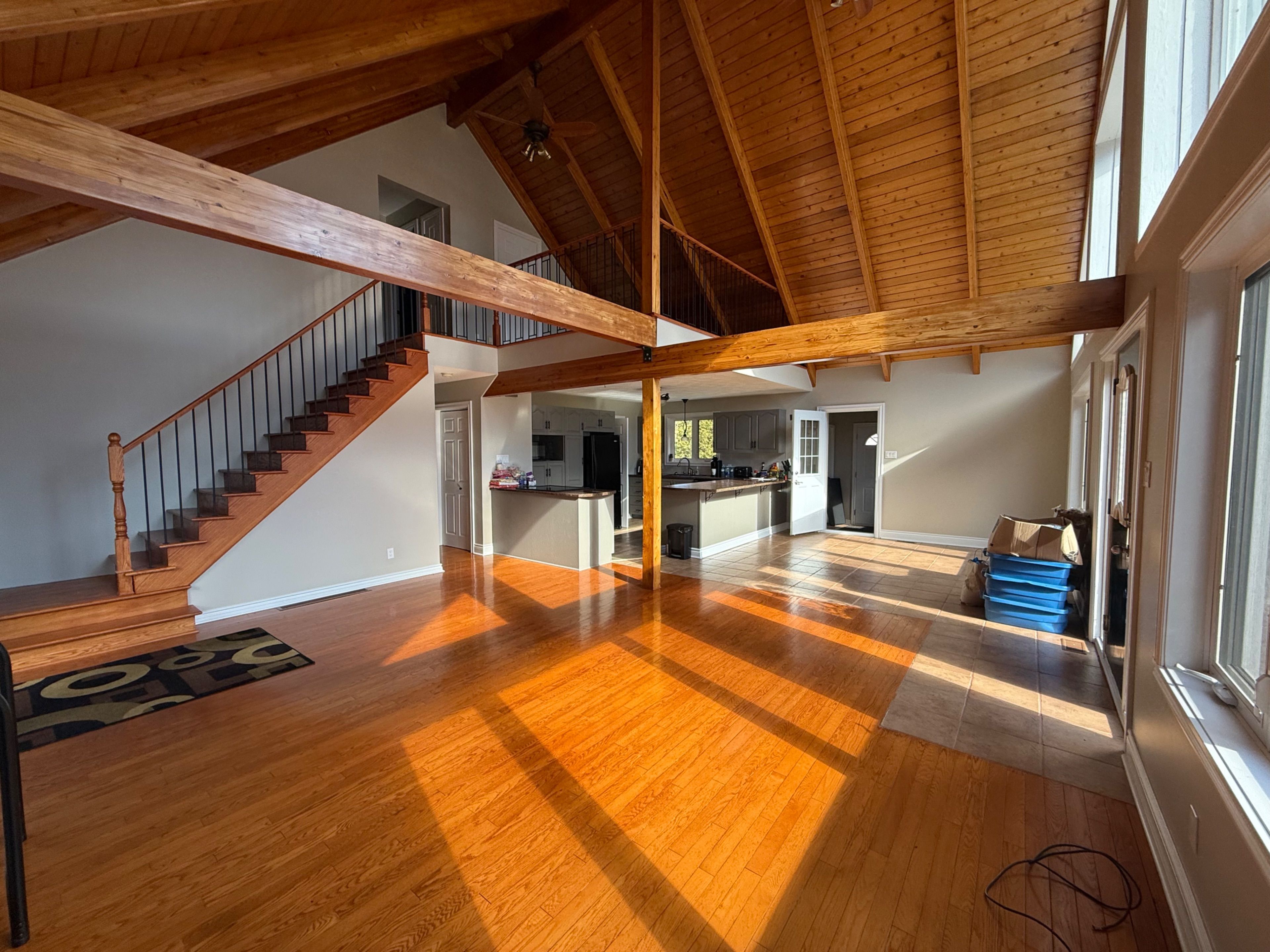 • Open-concept main floor with vaulted ceilings and large front windows.