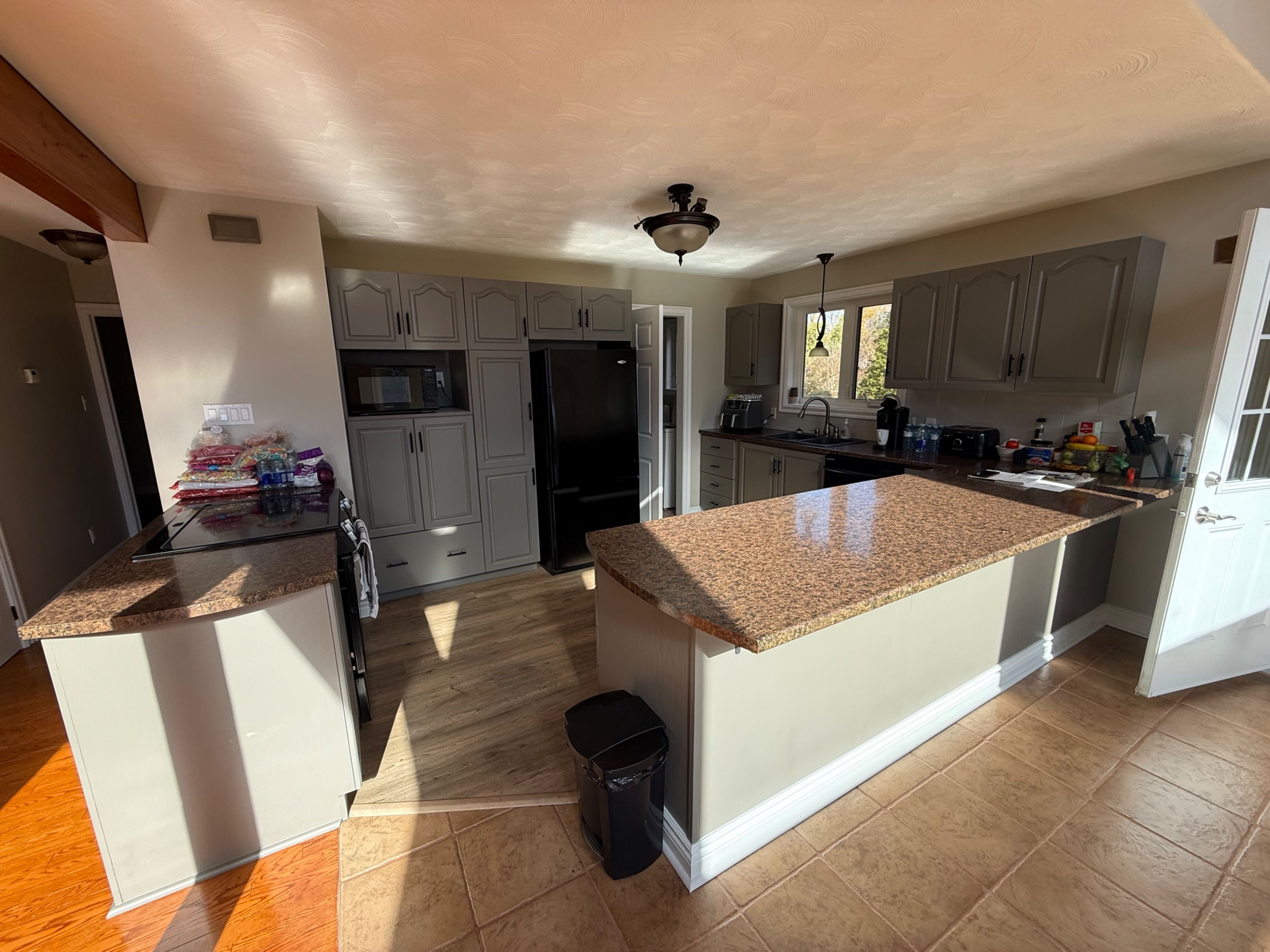 • Spacious kitchen with ample cabinetry and a cozy fireplace.