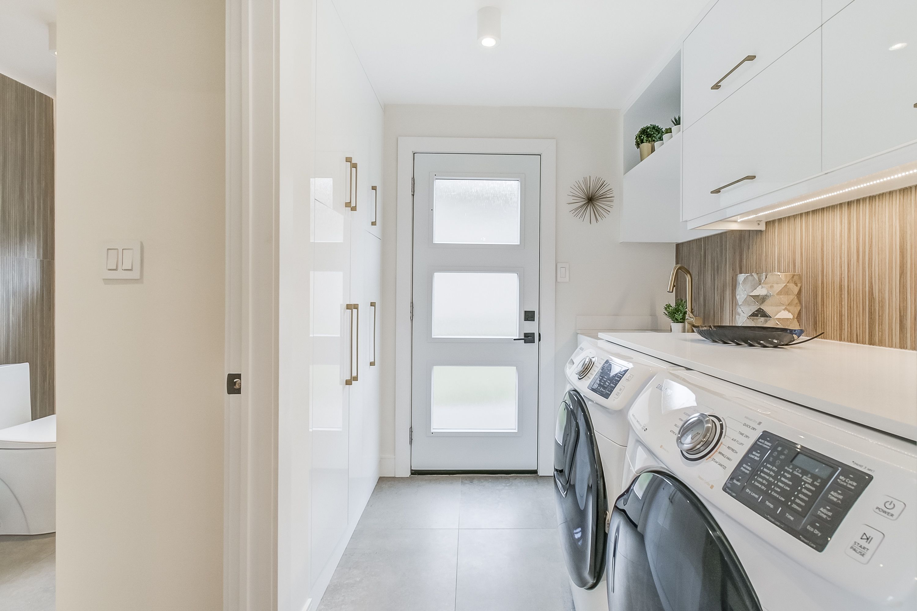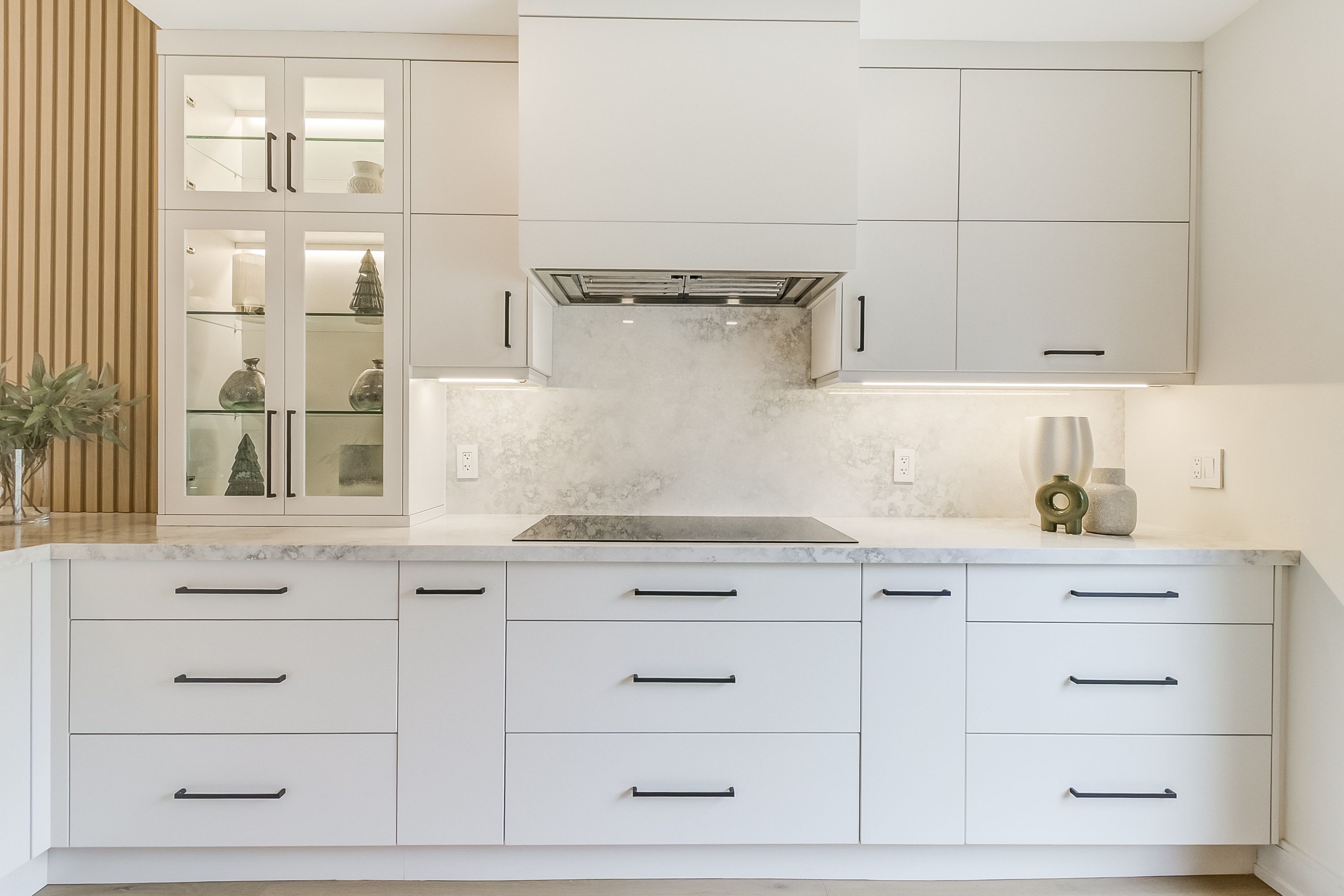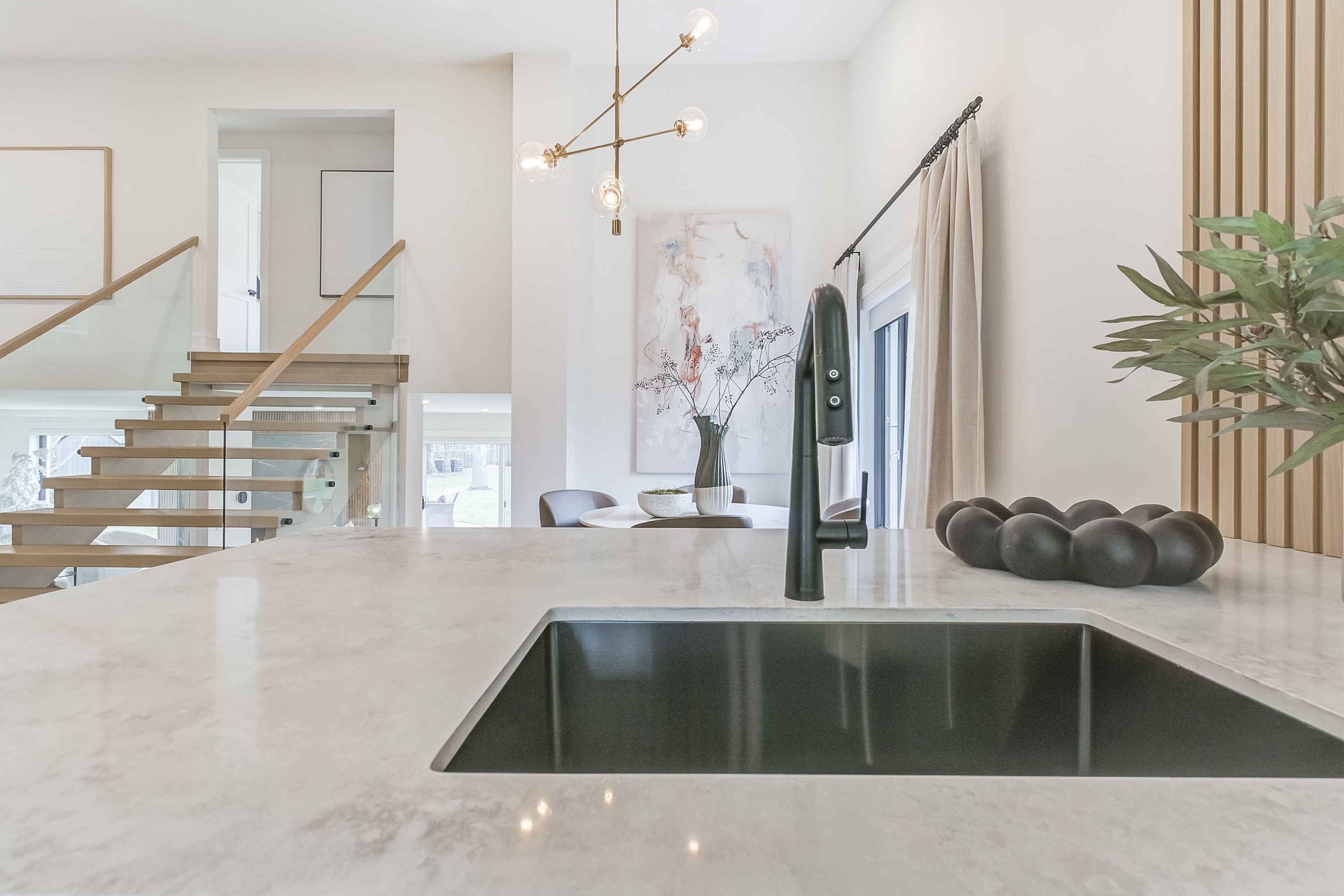 • Bright kitchen featuring polished quartz counters and high-end Bosch appliances.