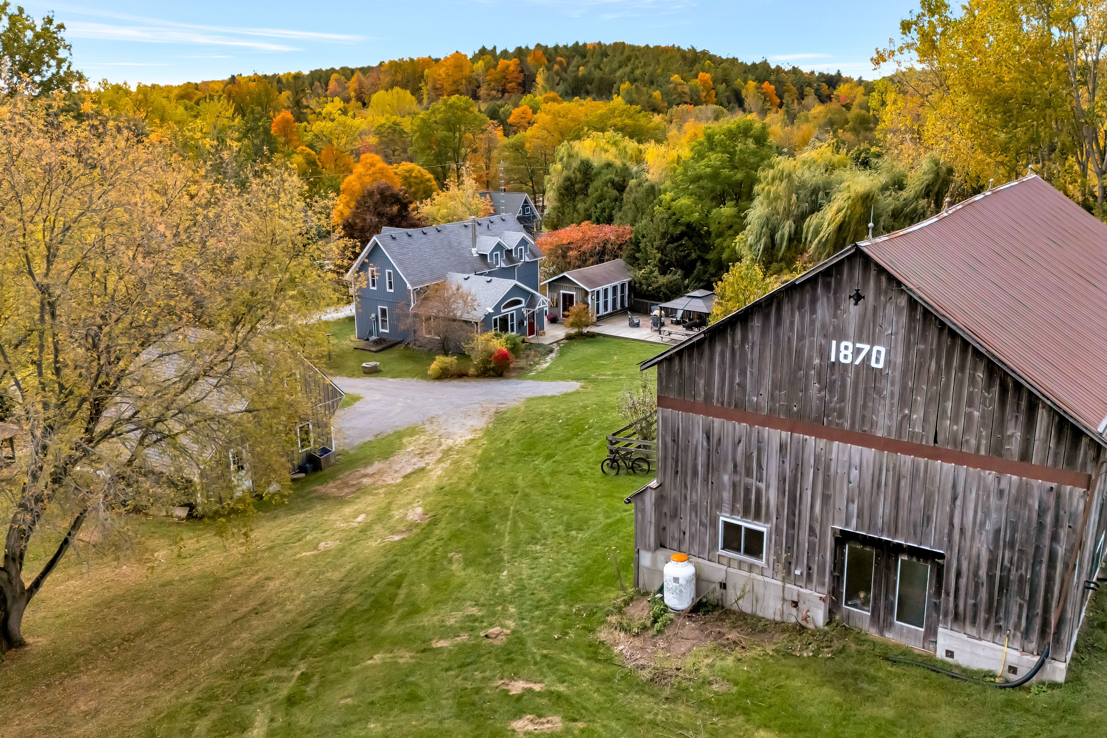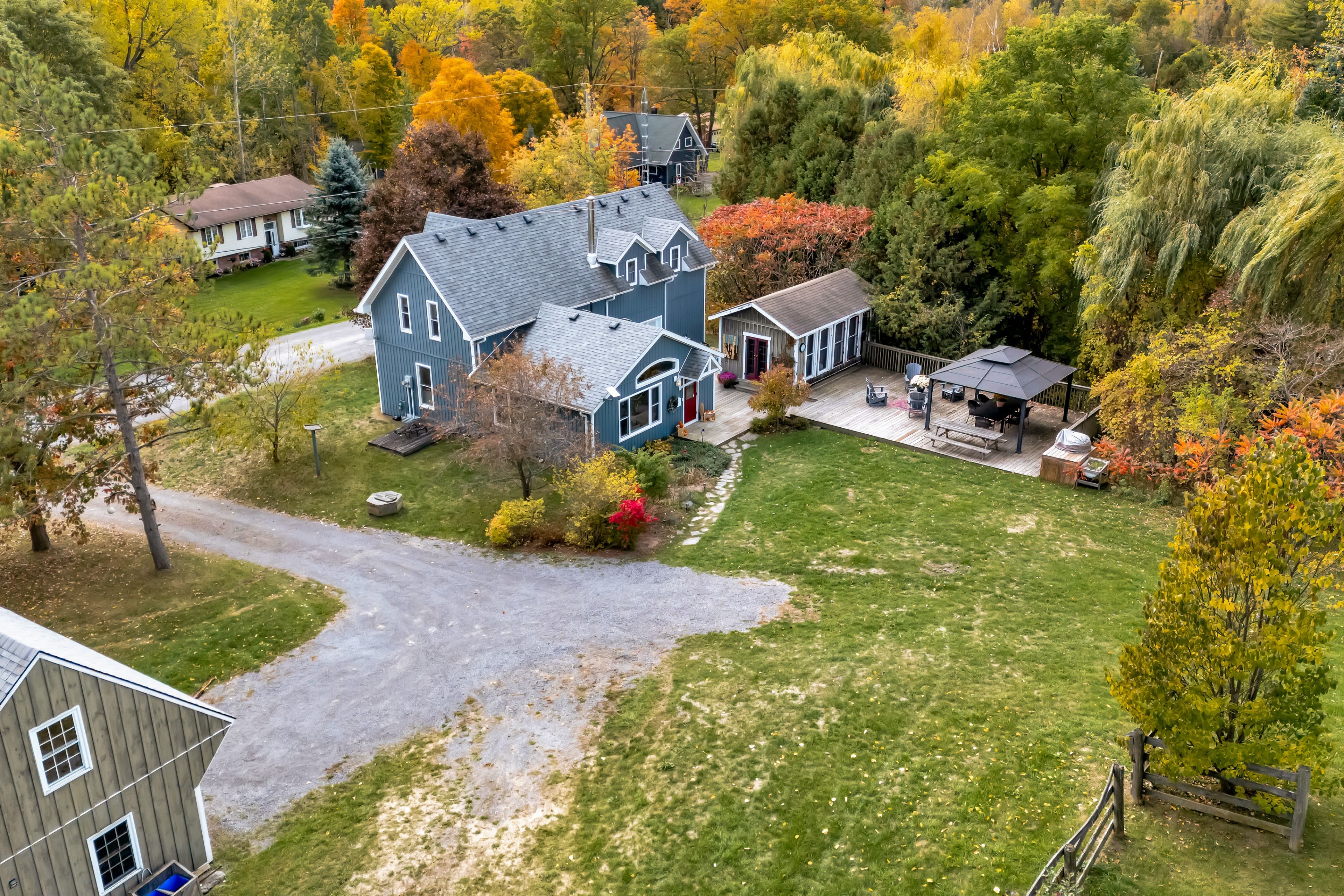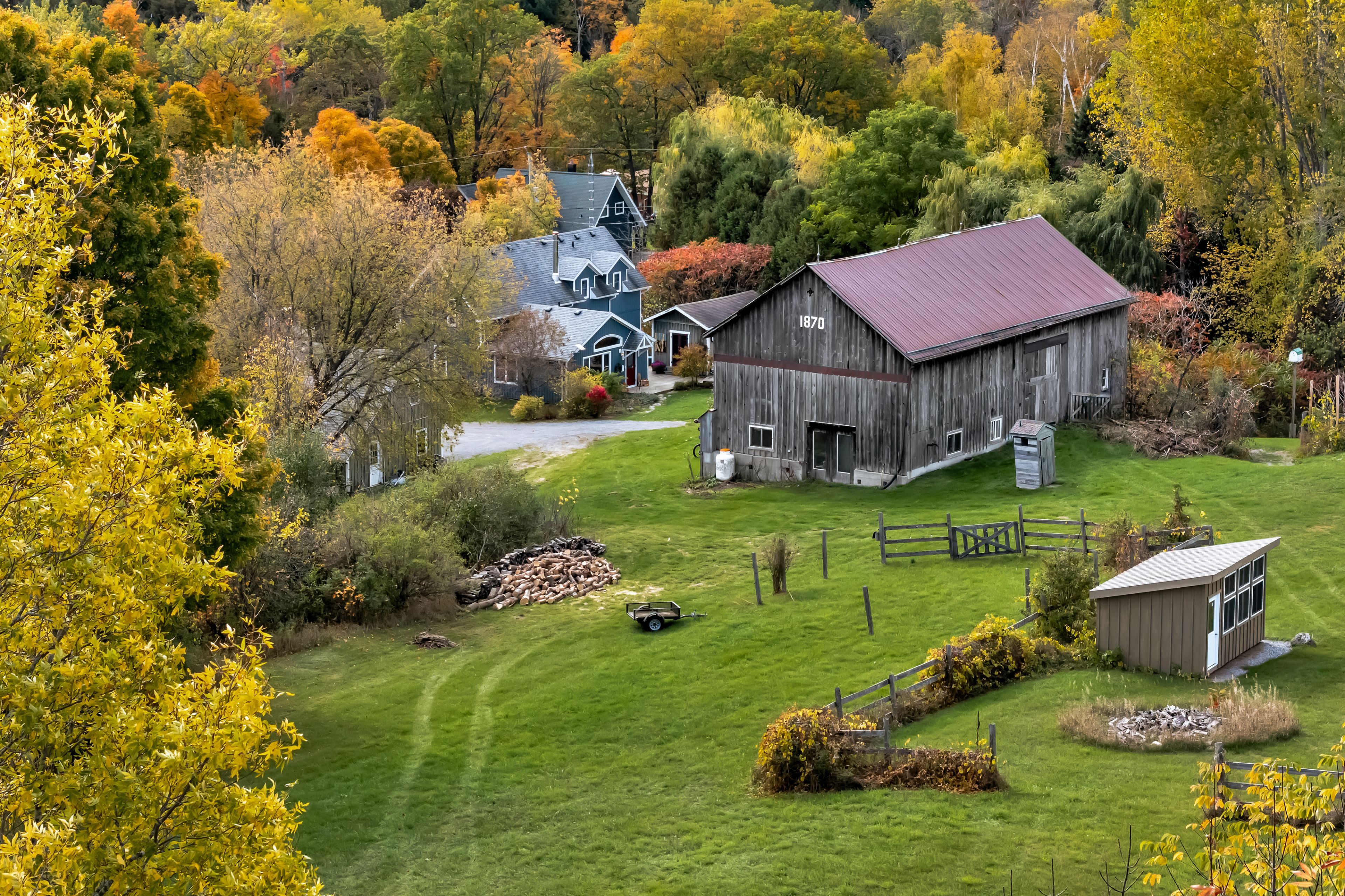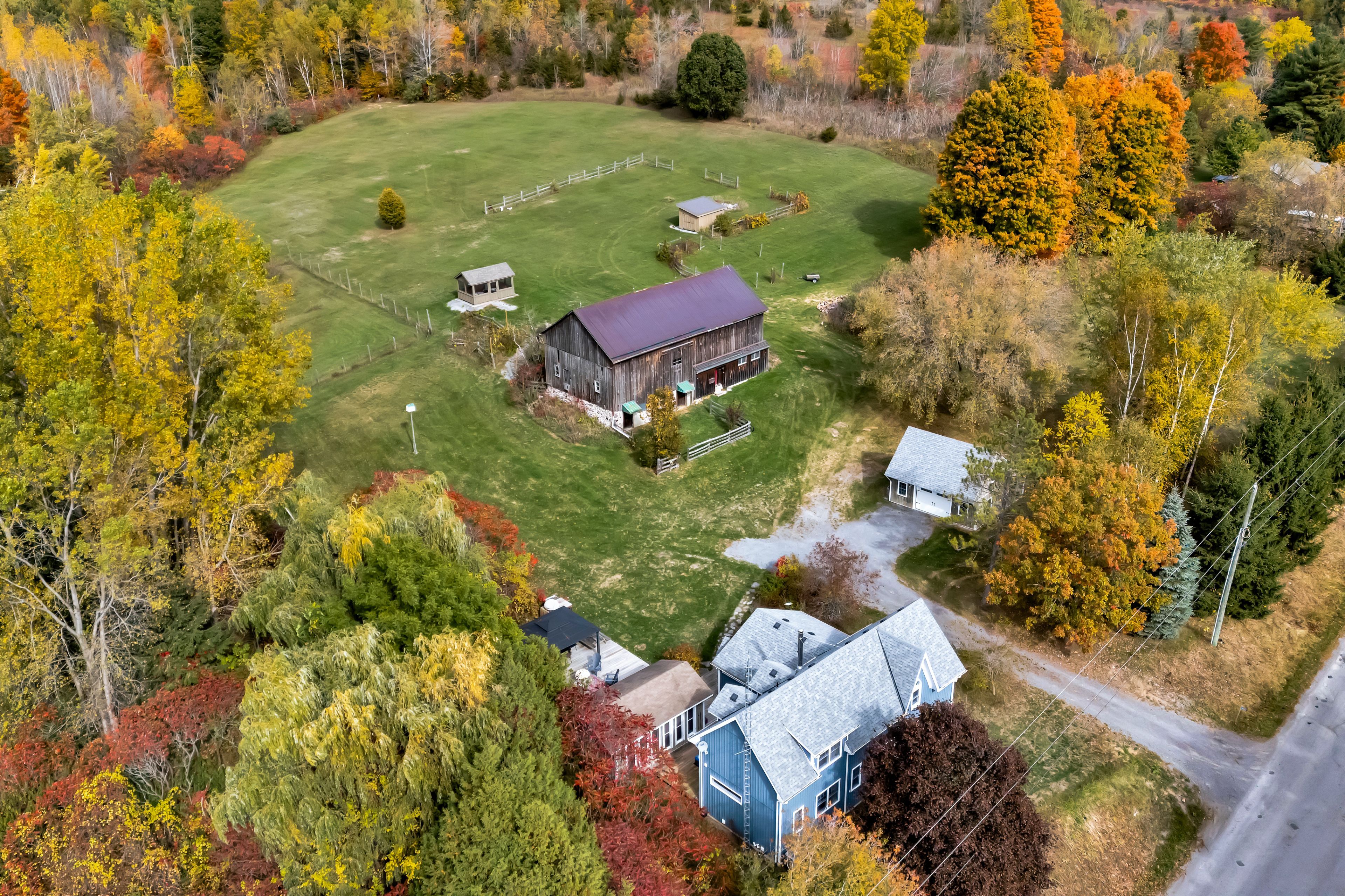 From a bird's-eye perch, the full magic of this timeless 45-acre family estate unfolds-a retreat blending history, character & opportunity. The vibrant setting features a charming c. 1900 farmhouse, a majestic 1870 post-and-beam barn, two cozy bunkies & pavilion + a detached garage w/ loft-offering > 5,000 sq. Ft. Of versatile living, working, & hobby space. Amid rolling hills, streams, and hardwood forest bursting with maple, oak & pine in full fall colour. Lovingly updated & expanded in 2018, the farmhouse retains its heritage charm with a modern design to leverage main floor living w/ an expanded 2-floor footprint, 4 bdrms + 3 baths. Enjoy the custom pine kitchen, natural hardwood floors & cozy wood stove centering the family dining hub. The new bright main-floor primary suite features glass french doors streaming natural light, accessible glass shower ensuite + deck w/o. Upstairs offers an equally large family room w/ ensuite, (potential 2nd primary) + addt'l bdrms & an office nook. Major upgrades incl. Electrical, plumbing, hvac & new b/u generator. Outdoors, a large guest bunkie, hot tub, bbq and covered gazebo tease the backyard oasis to come. Approx 5. 5 acres of cleared rolling hills offer majestic views of two fenced paddocks ready & waiting for an equestrian re-fresh and an array of options for an in-ground pool +++ following the natural landscape of the property. A screened-in pavilion & new 2nd bunkie sit atop the 1st rolling hill. The grand barn towering 30' w/ timeless appeal, has 3 w/o levels: stables below, a heated workshop, and 24' soaring loft spanning the entire 30' x 60' barn. Ideal for a barndominium, artisan studio, or business. Detach 1. 5 car garage for toys, tools & tractors w/ 2nd level loft t. B. Finished. Massive frontage, plenty of acreage and strategic placement opportunities for privacy w/ a 2nd home or potential severance for the kids. Kms of trails await for horseback riding, hiking, cycling & x-country skiing - a 4 season paradise.