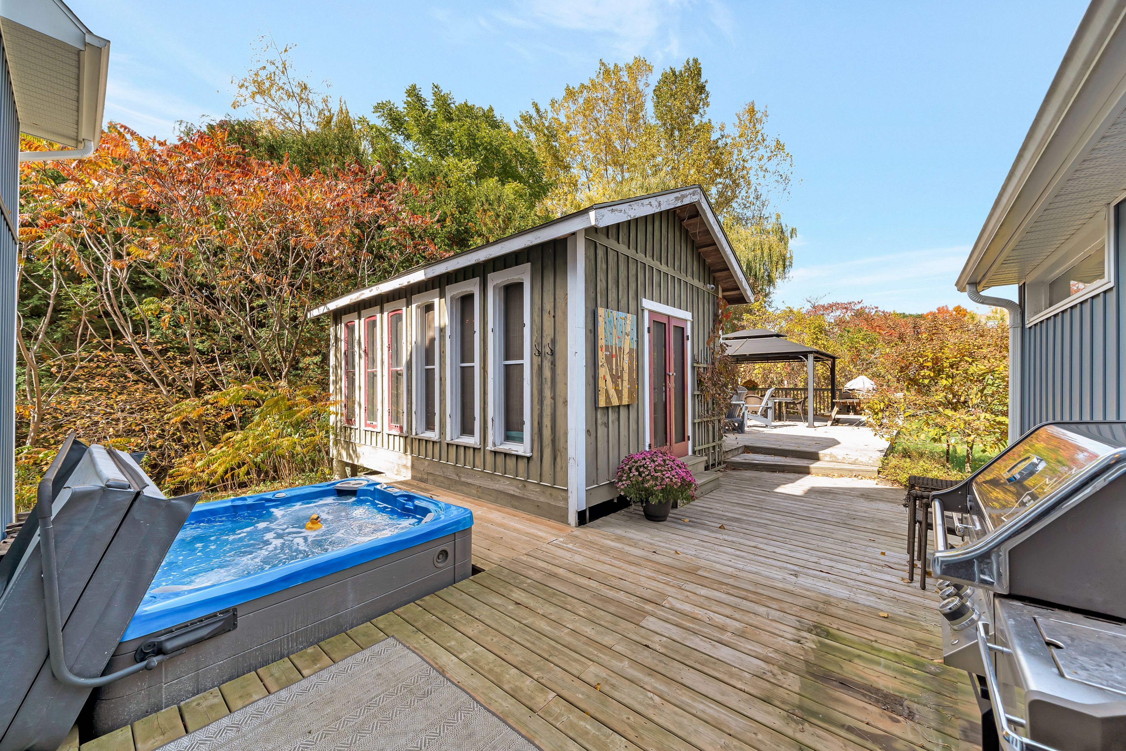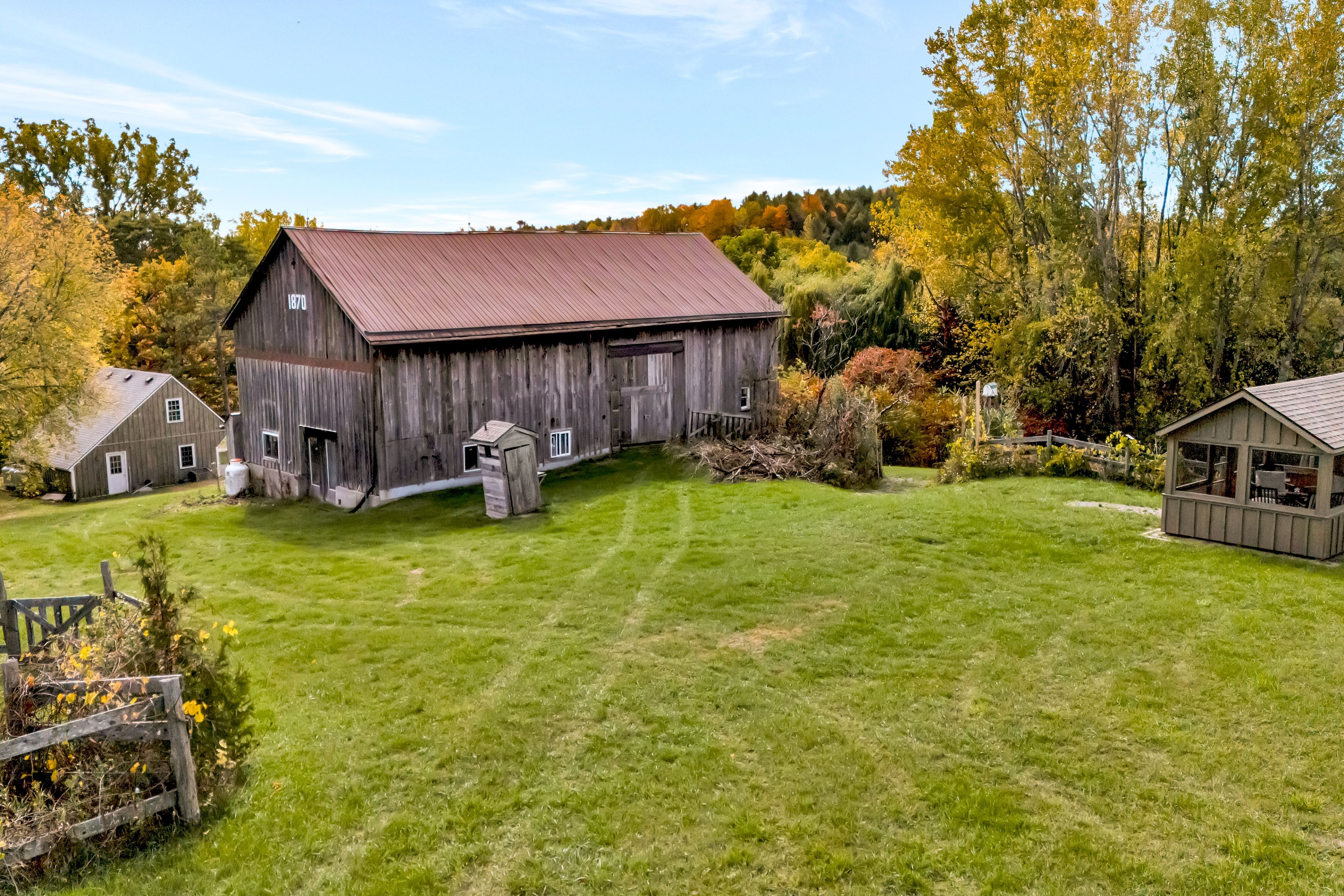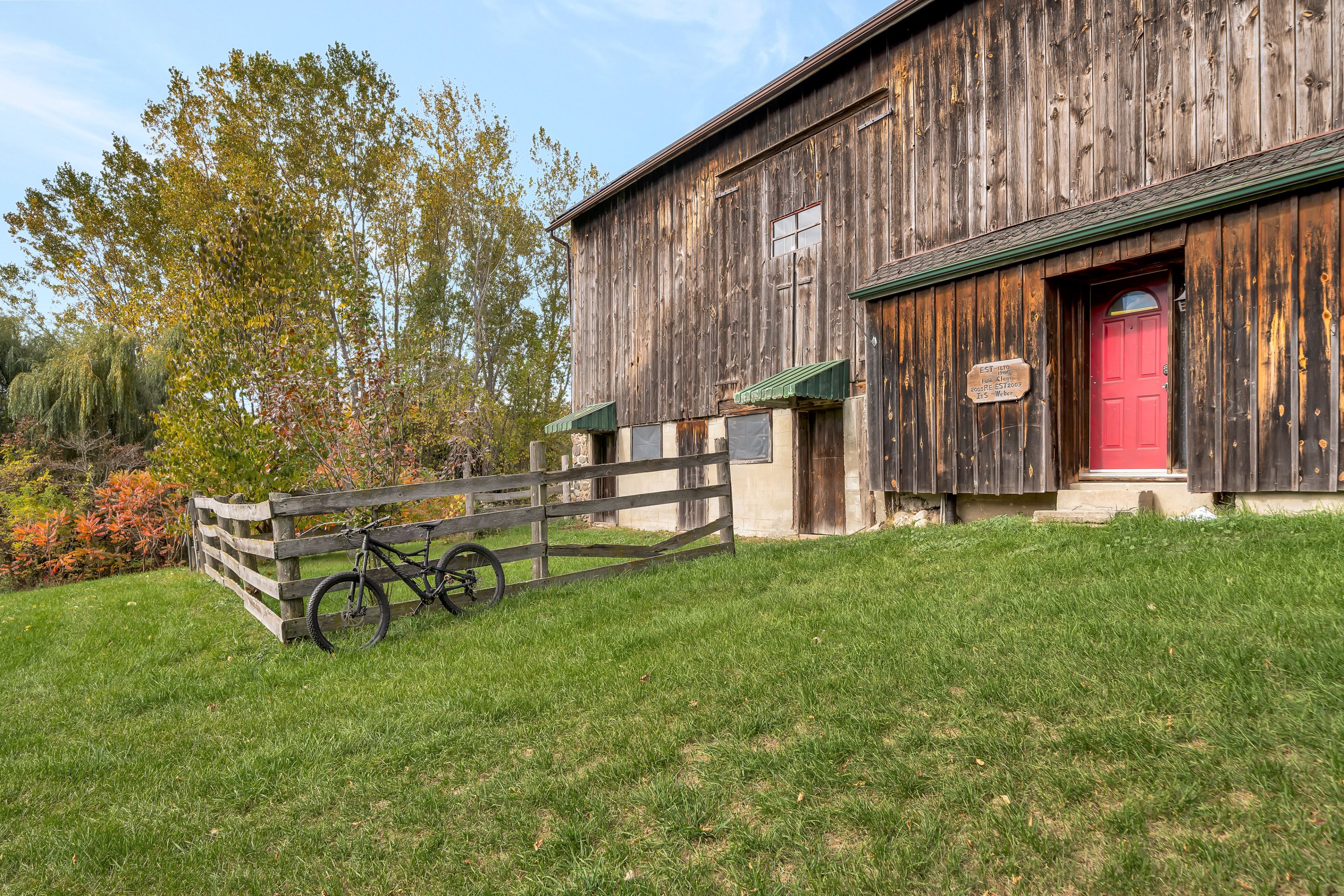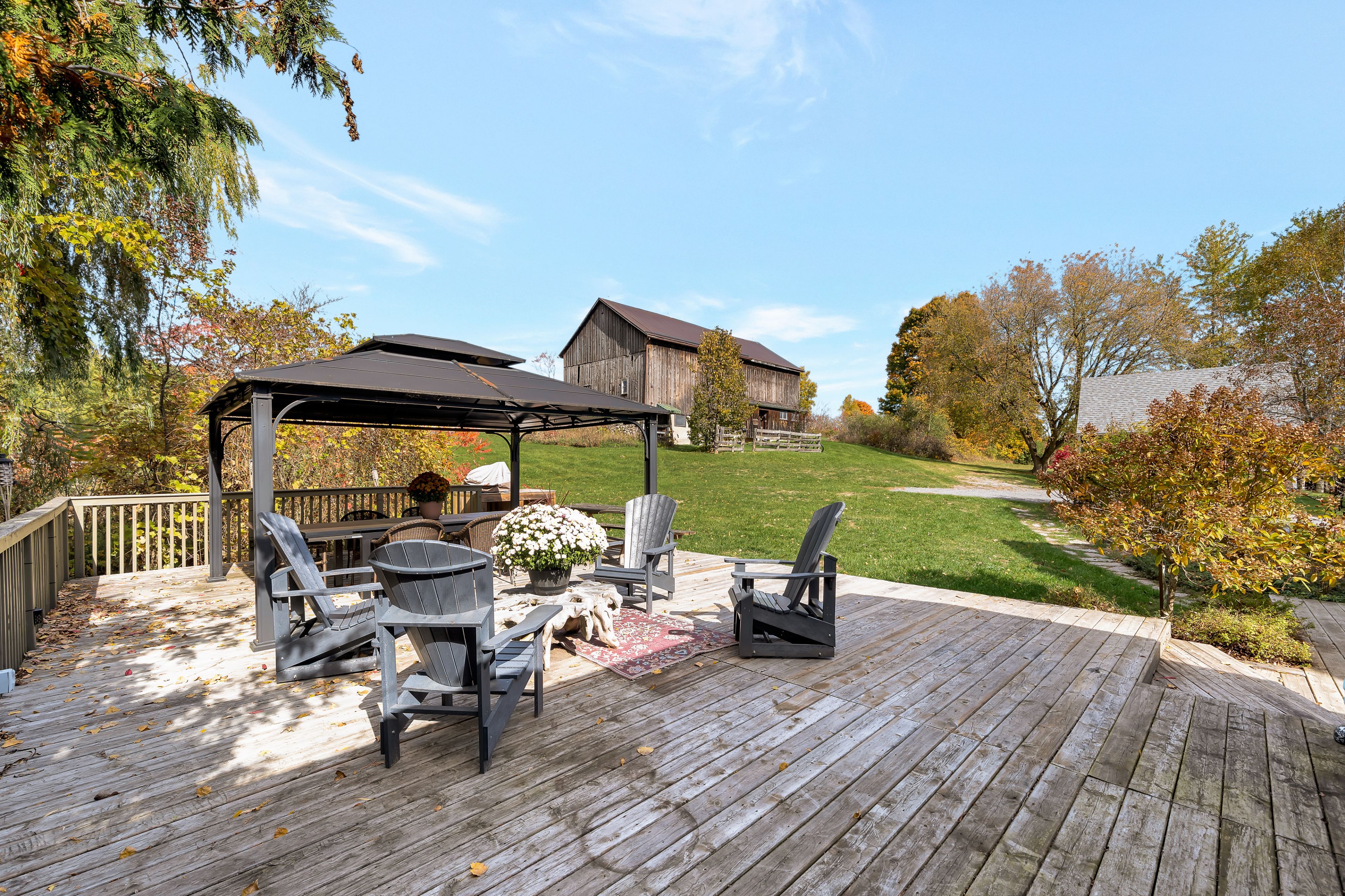 From a bird's-eye perch, the full magic of this timeless 45-acre family estate unfolds-a retreat blending history, character & opportunity. The vibrant setting features a charming c. 1900 farmhouse, a majestic 1870 post-and-beam barn, two cozy bunkies & pavilion + a detached garage w/ loft-offering > 5,000 sq. Ft. Of versatile living, working, & hobby space. Amid rolling hills, streams, and hardwood forest bursting with maple, oak & pine in full fall colour. Lovingly updated & expanded in 2018, the farmhouse retains its heritage charm with a modern design to leverage main floor living w/ an expanded 2-floor footprint, 4 bdrms + 3 baths. Enjoy the custom pine kitchen, natural hardwood floors & cozy wood stove centering the family dining hub. The new bright main-floor primary suite features glass french doors streaming natural light, accessible glass shower ensuite + deck w/o. Upstairs offers an equally large family room w/ ensuite, (potential 2nd primary) + addt'l bdrms & an office nook. Major upgrades incl. Electrical, plumbing, hvac & new b/u generator. Outdoors, a large guest bunkie, hot tub, bbq and covered gazebo tease the backyard oasis to come. Approx 5. 5 acres of cleared rolling hills offer majestic views of two fenced paddocks ready & waiting for an equestrian re-fresh and an array of options for an in-ground pool +++ following the natural landscape of the property. A screened-in pavilion & new 2nd bunkie sit atop the 1st rolling hill. The grand barn towering 30' w/ timeless appeal, has 3 w/o levels: stables below, a heated workshop, and 24' soaring loft spanning the entire 30' x 60' barn. Ideal for a barndominium, artisan studio, or business. Detach 1. 5 car garage for toys, tools & tractors w/ 2nd level loft t. B. Finished. Massive frontage, plenty of acreage and strategic placement opportunities for privacy w/ a 2nd home or potential severance for the kids. Kms of trails await for horseback riding, hiking, cycling & x-country skiing - a 4 season paradise.