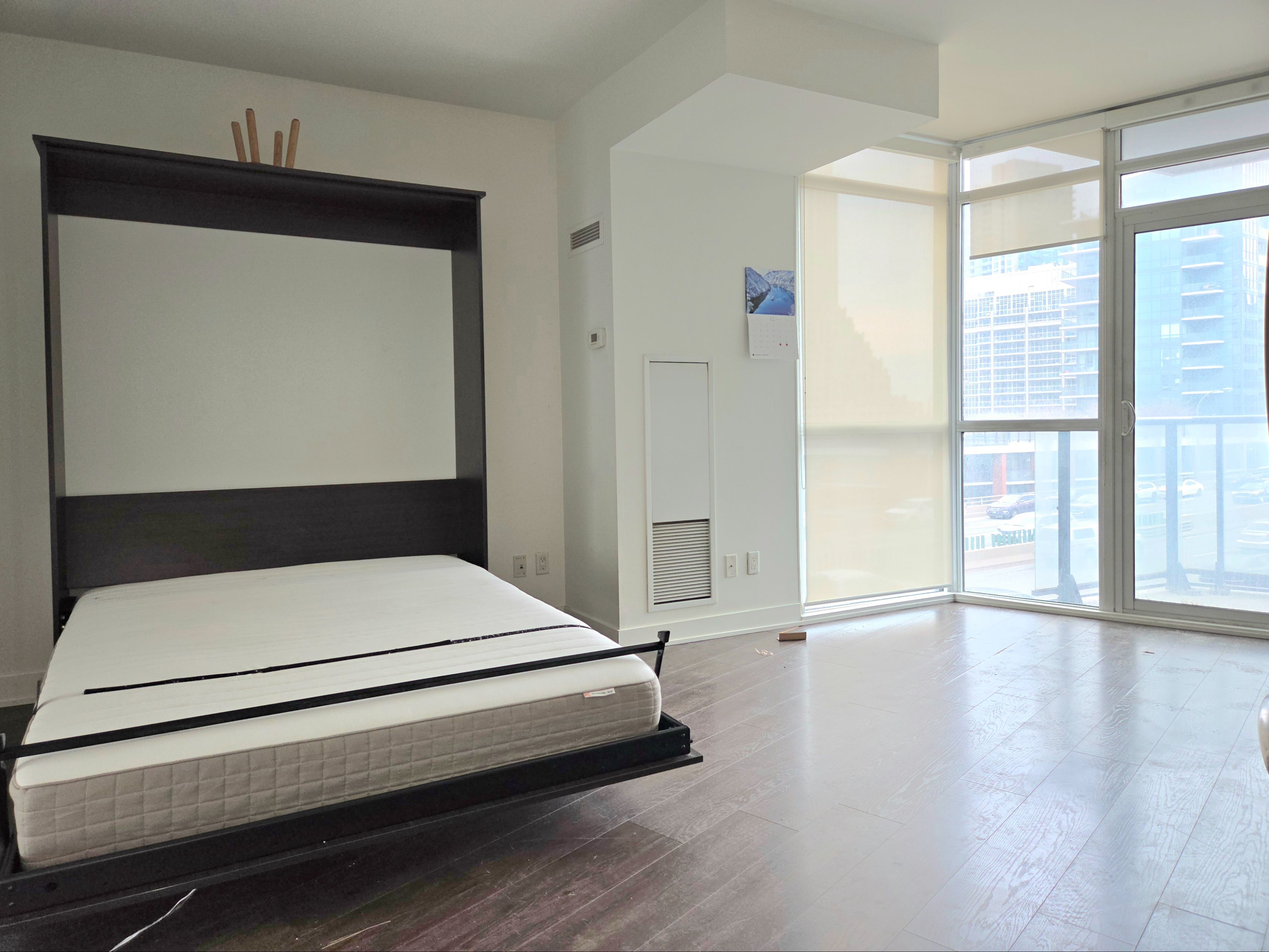 Experience vibrant downtown toronto living at garrison at fort york, perfectly situated near the waterfront and king west's top restaurants, nightlife, and urban conveniences. This bright south-west facing 446 sq. Ft plus balcony suite features floor-to-ceiling windows, an efficient layout with two closets-including one with integrated shelving and hangers-and comes with a murphy bed and shoe rack for smart storage space plus the unit comes with a storage locker. Move right in and make it your own-just bring your dining table! Residents enjoy premium amenities: a fully equipped fitness centre, sauna, outdoor bbq lounge, games and party rooms, and 24/7 concierge service for effortless city living.