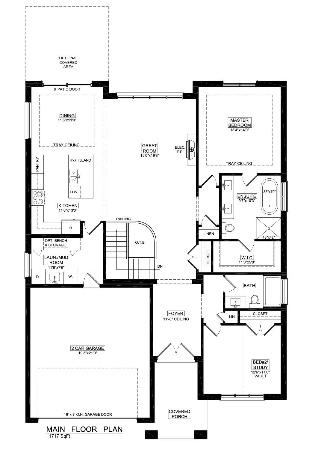 Welcome to the birmingham, a thoughtfully designed bungalow by stonehaven homes, located in the highly sought-after neighbourhood of the boardwalk at mill pond in dorchester. Offering 1,717 sq. Ft. Of well-planned living space, this model features 2 bedrooms, 2 bathrooms, and an attached 2-car garage, delivering comfort, functionality, and timeless appeal. With quality craftsmanship and an efficient layout, the birmingham is ideal for those seeking low maintenance living without compromise. Step inside to an inviting 11-foot ceiling foyer that sets the tone for the home's bright, open feel. The open-concept main living area is designed for both everyday living and entertaining, featuring a well-appointed kitchen with ample cabinetry, pantry, and an island with sink, seamlessly flowing into the dining area with tray ceilings and patio door leading to a covered deck. The adjacent great room is filled with natural light from large windows and anchored by a cozy electric fireplace. The grand primary bedroom offers a private retreat with tray ceilings, walk-in closet, and a luxurious 5-piece ensuite complete with a soaker tub and double sinks. The second bedroom with double closets and main 4-piece bathroom provides comfort and flexibility for guests. Completing the layout is a practical mudroom combined with a laundry room, offering direct access to the garage and enhancing everyday convenience. The unfinished basement offers a blank canvas to tailor to your needs; the possibilities are endless. Experience the pride of stonehaven homes and the beauty of the boardwalk at mill pond in dorchester. Discover a harmonious blend of modern living, exceptional craftsmanship, and the tranquility of nature in this remarkable model home. Please note: the render is for illustrative purposes only.