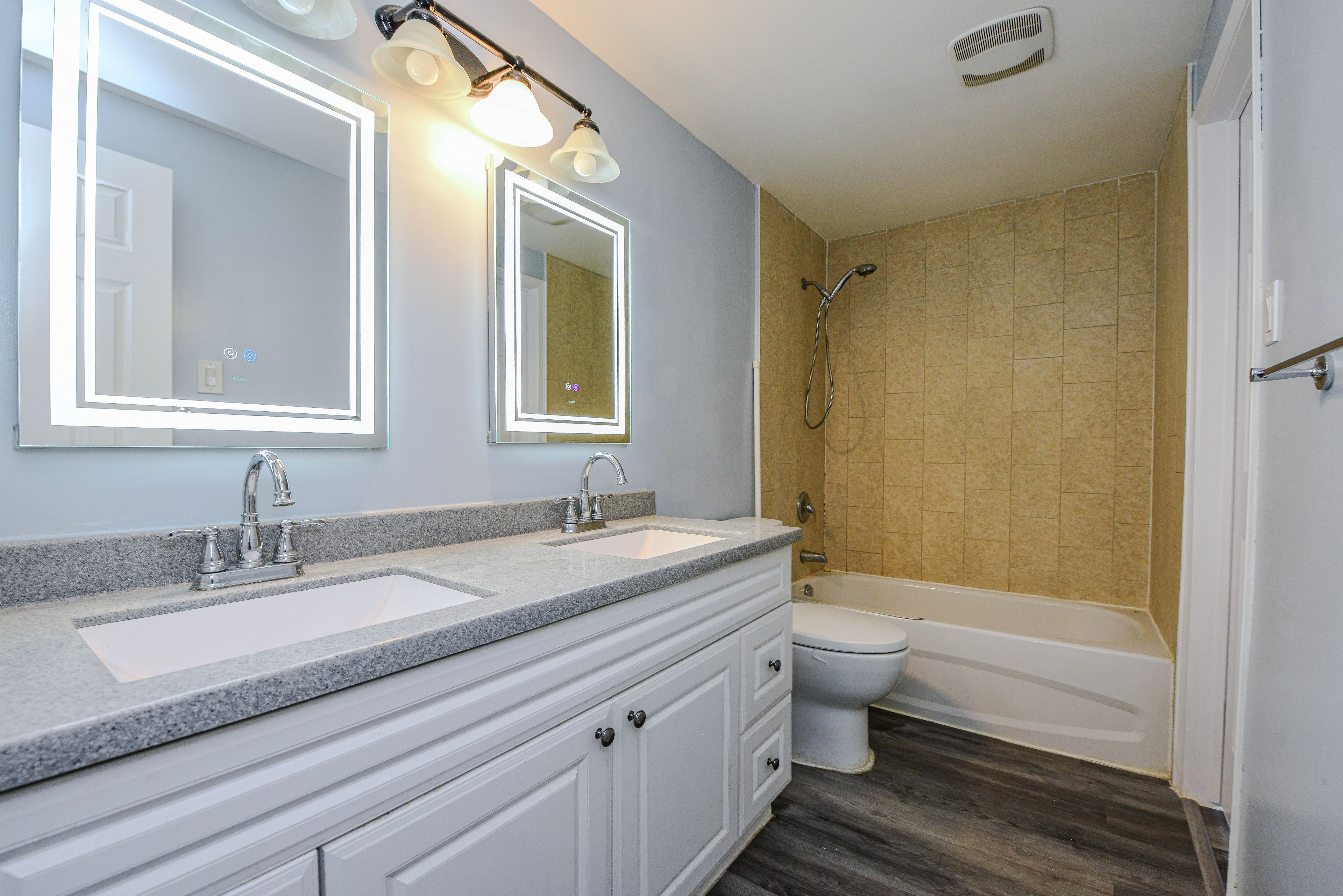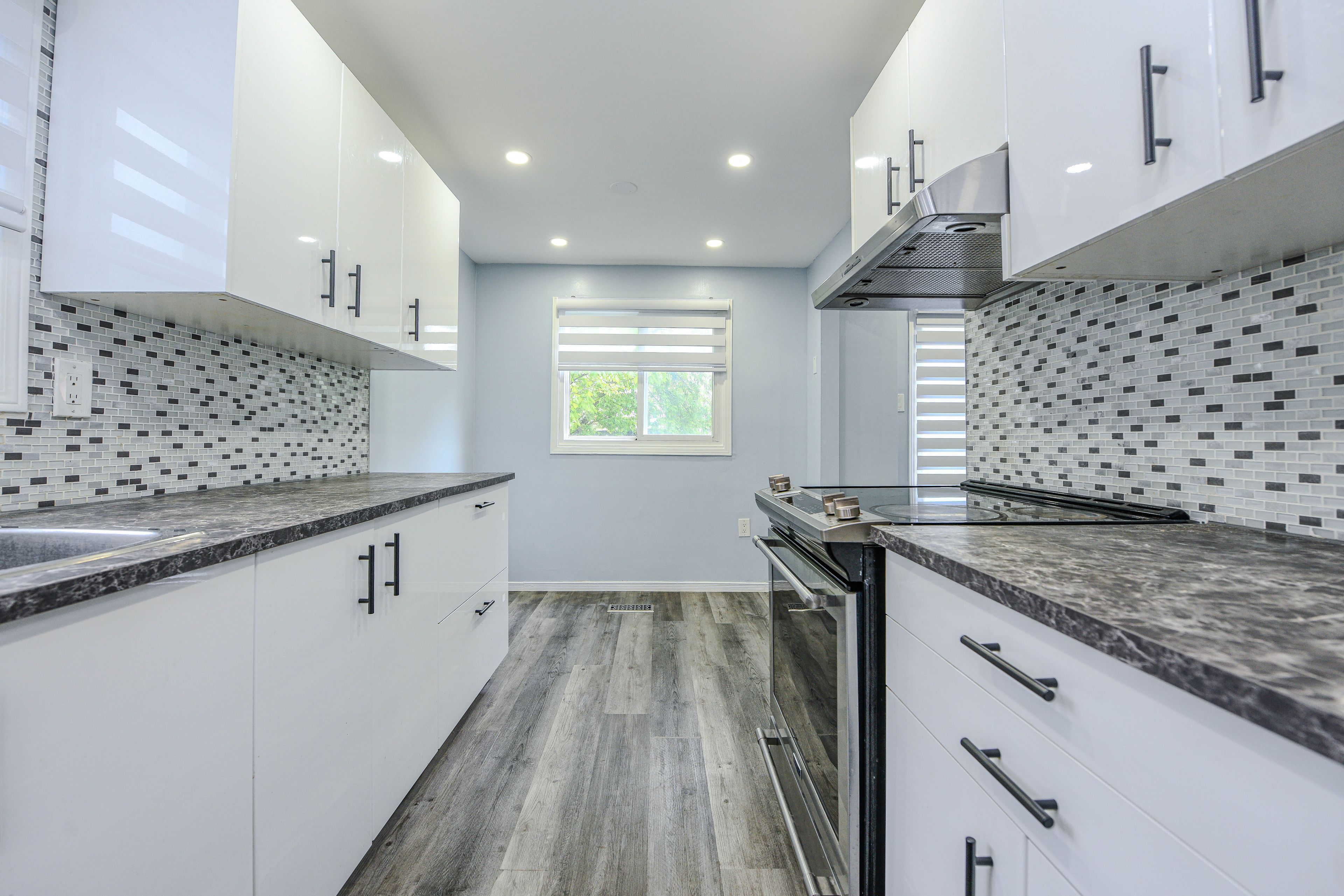 • Modern kitchen with quartz countertops for a sleek look.