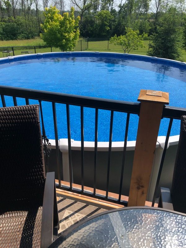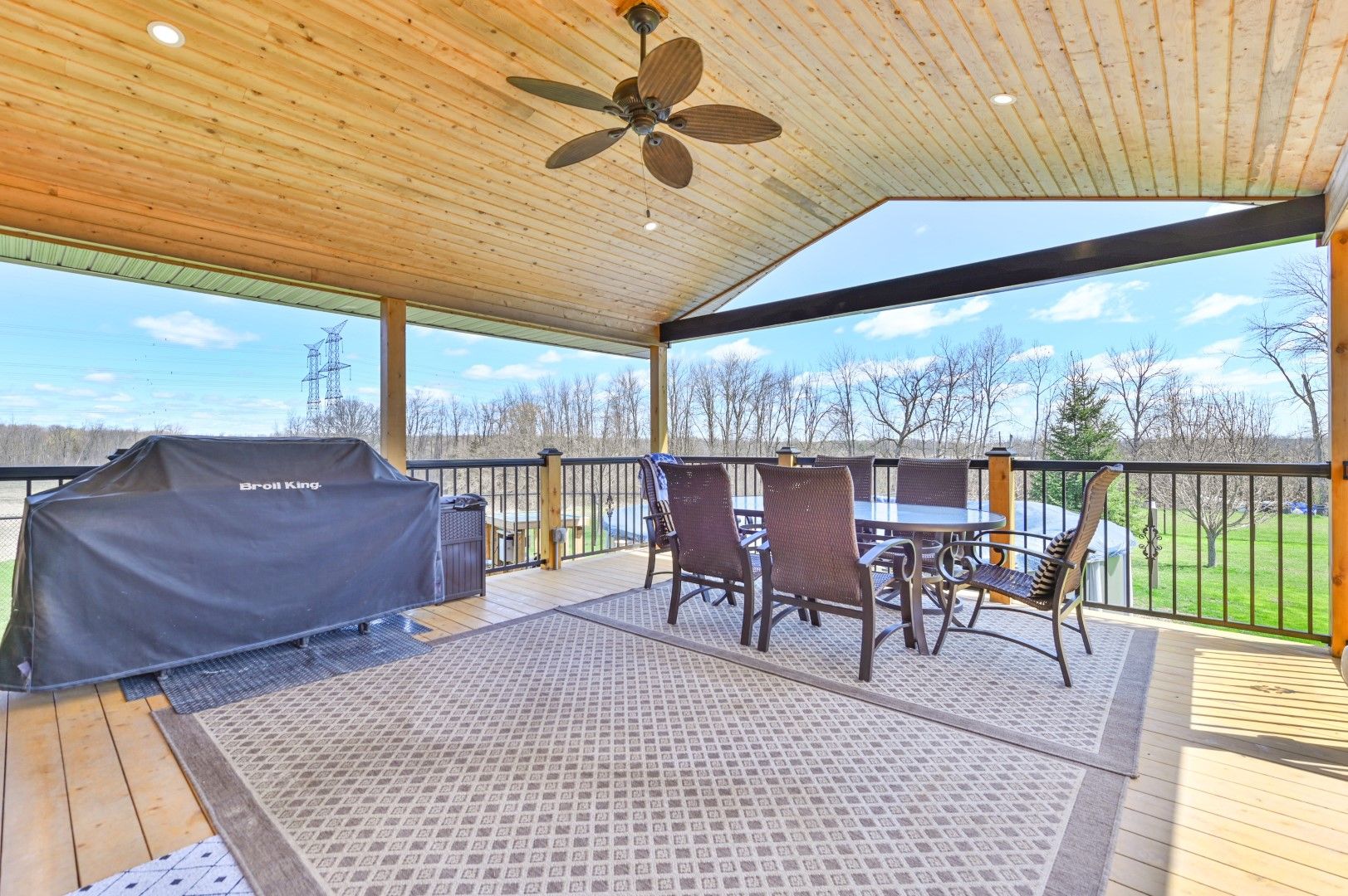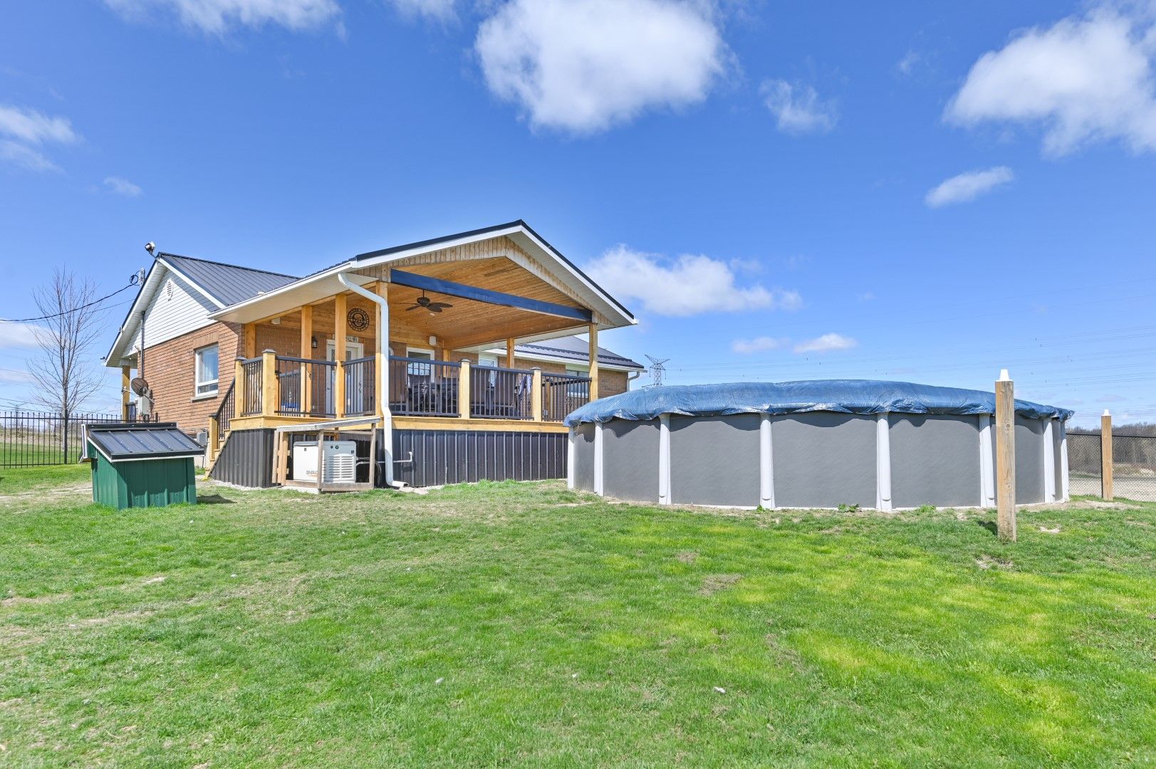 • Large covered deck overlooking an above-ground pool for relaxation.