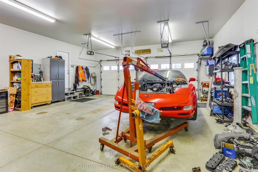 Welcome to this well-appointed raised ranch offering the perfect blend of country living and city convenience. This 3-bedroom home features a primary bedroom on the main level, located just a few steps up from the foyer, complete with a large walk-in closet and access to a spacious bathroom with jacuzzi tub and walk-in shower. The open-concept kitchen, dining, and living area is filled with natural light and overlooks the just-over-half-acre lot backing onto farmland, offering peaceful views and privacy. The lower level includes two additional bedrooms and a large family room, ideal for kids or a private retreat. A separate mid-level houses the foyer, mudroom/laundry, convenient half bath, and direct garage access, creating excellent functionality and separation of space. The double-wide, double-deep garage provides room for up to four vehicles or recreational toys and features a rear door to the fully fenced backyard. Enjoy summer evenings on the partially covered deck, relax by the firepit with sunset views, or cool off in the above-ground pool. Additional storage is provided by a large shed. Located minutes from london on a paved road with quick access to hwy 401. Heated by forced-air propane.