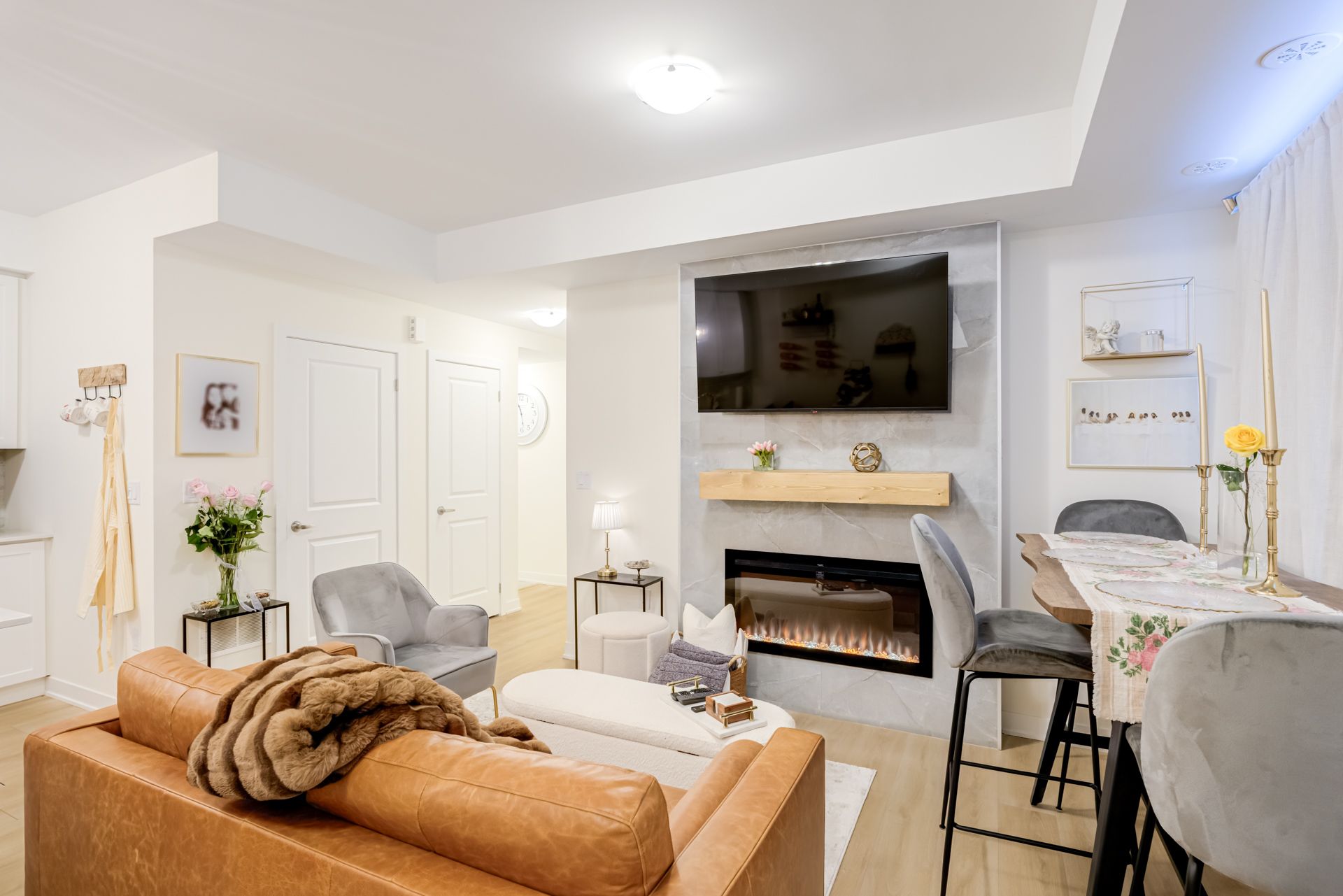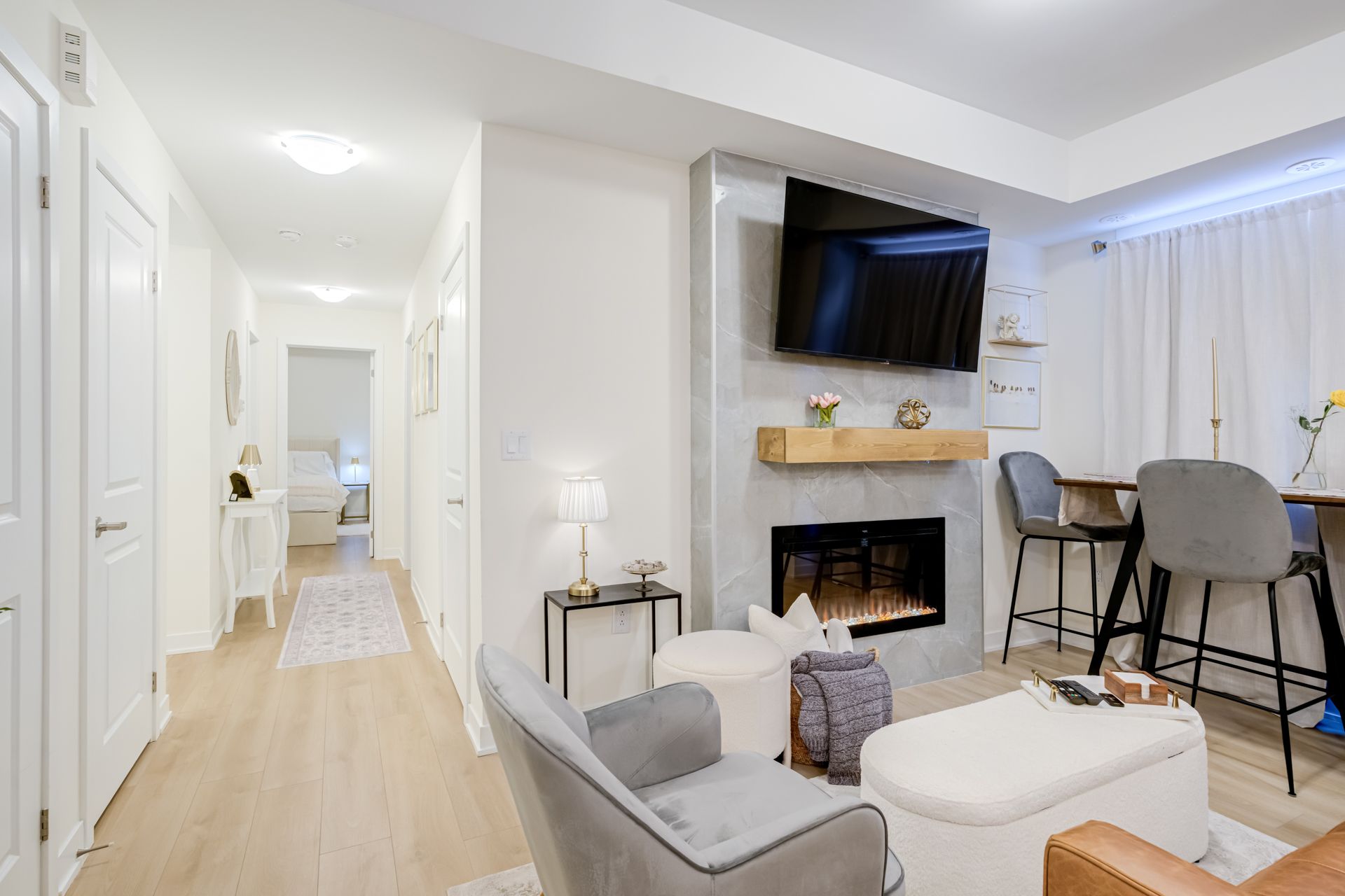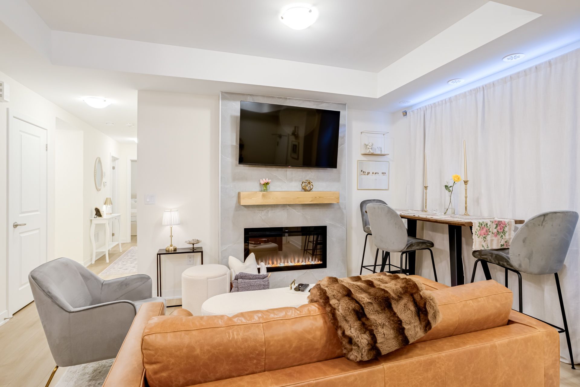 • Sleek electric fireplace adds warmth and style to living space.