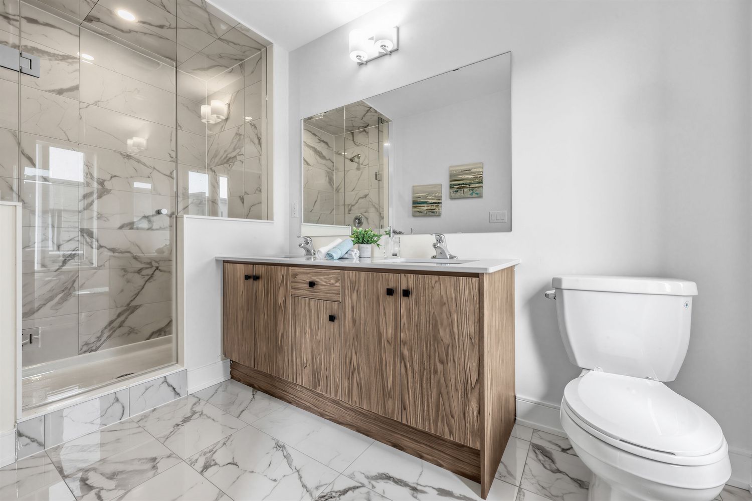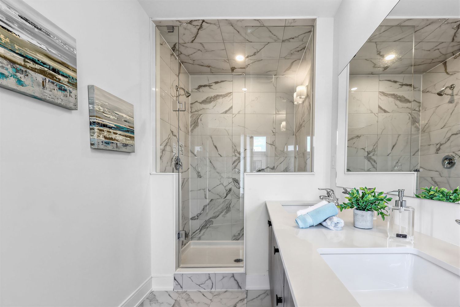 • Convenient ensuite bath with double sinks and glass shower stall.