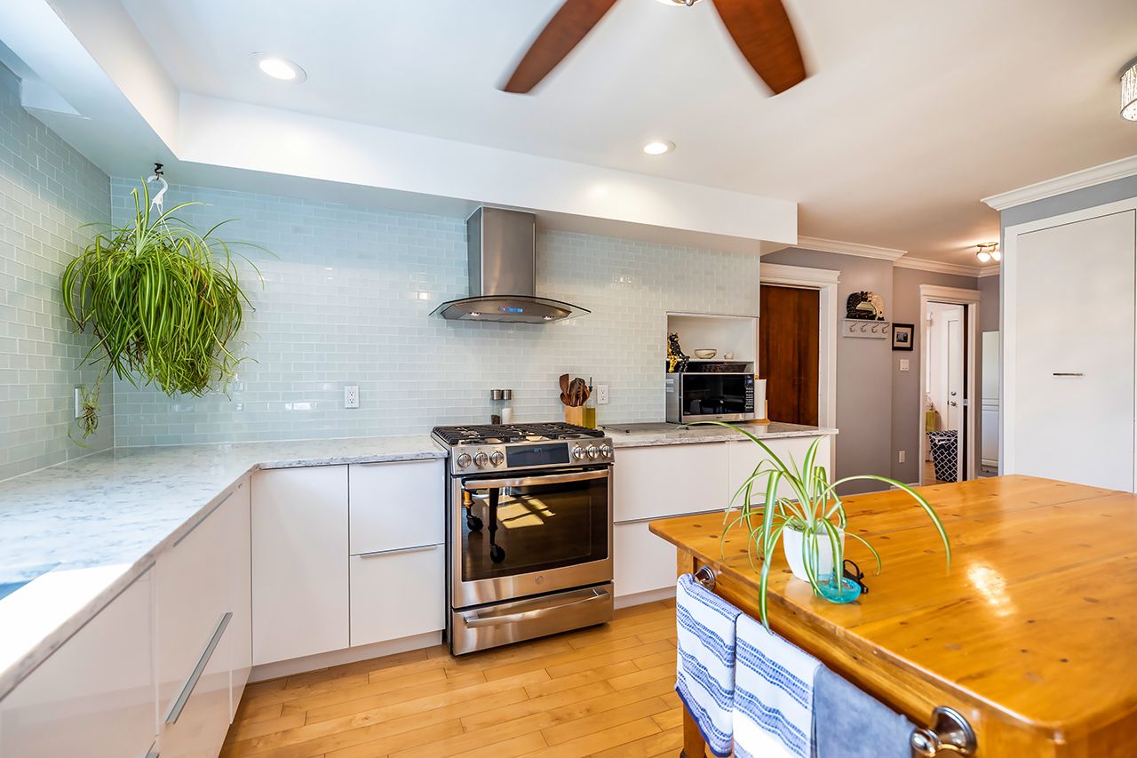 • Bright kitchen with quartz counters, stainless appliances, and smart cabinetry.