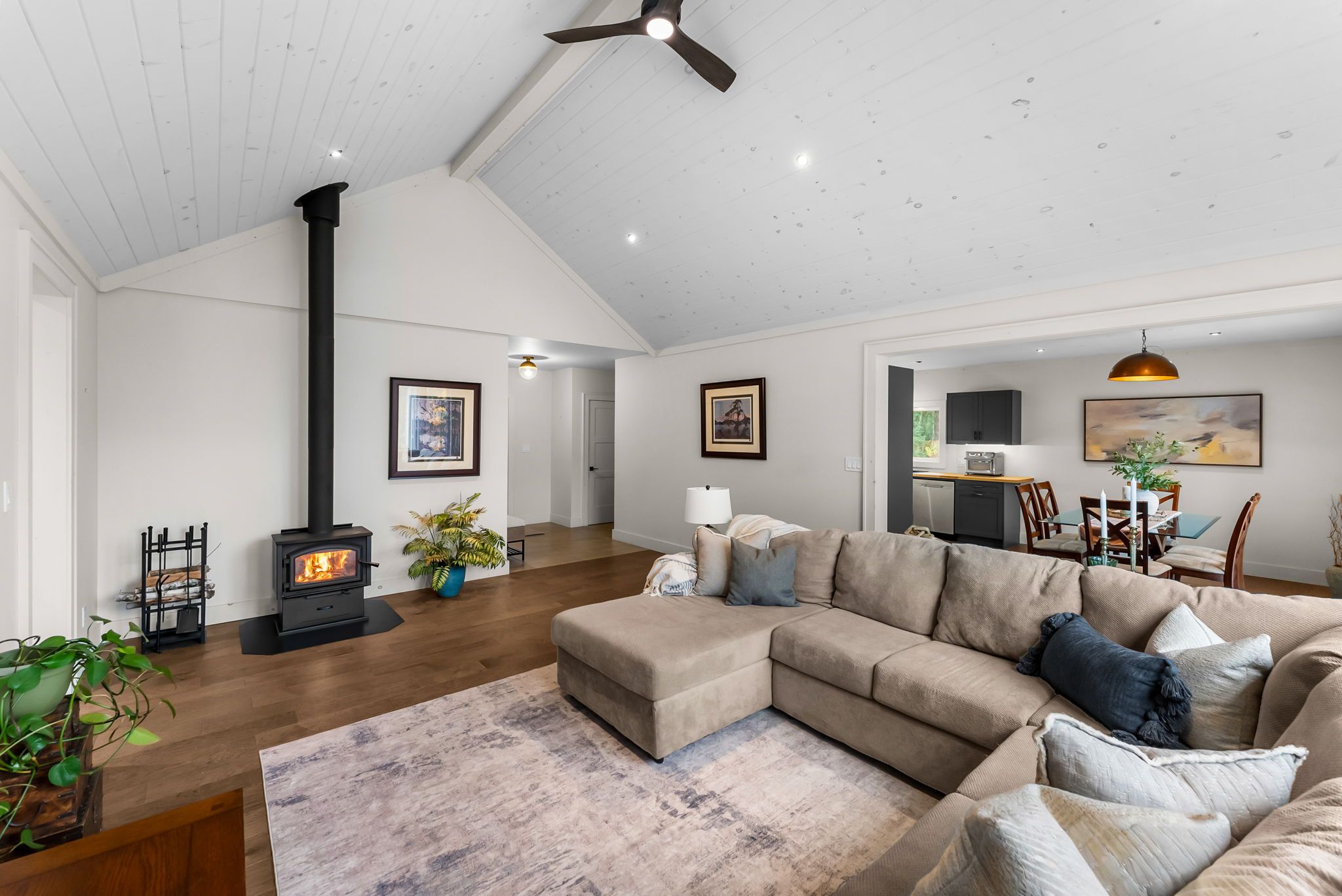 • Inviting living room features a cathedral ceiling and woodstove for warmth.