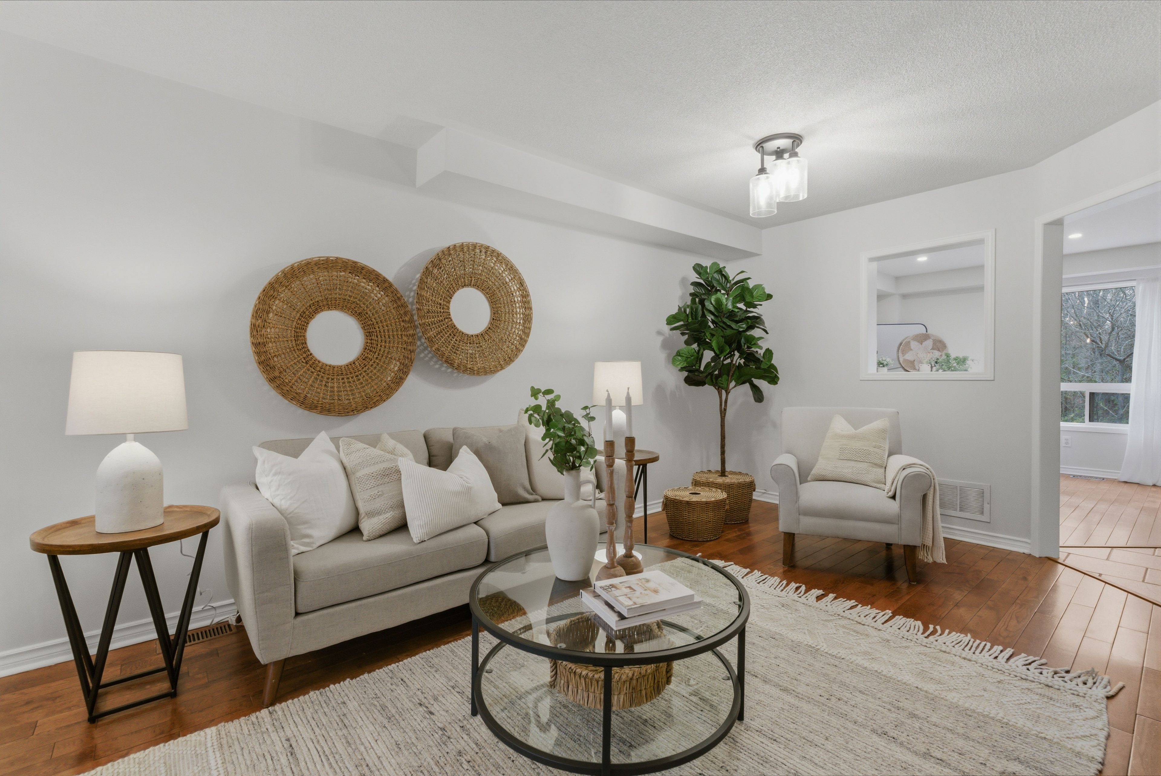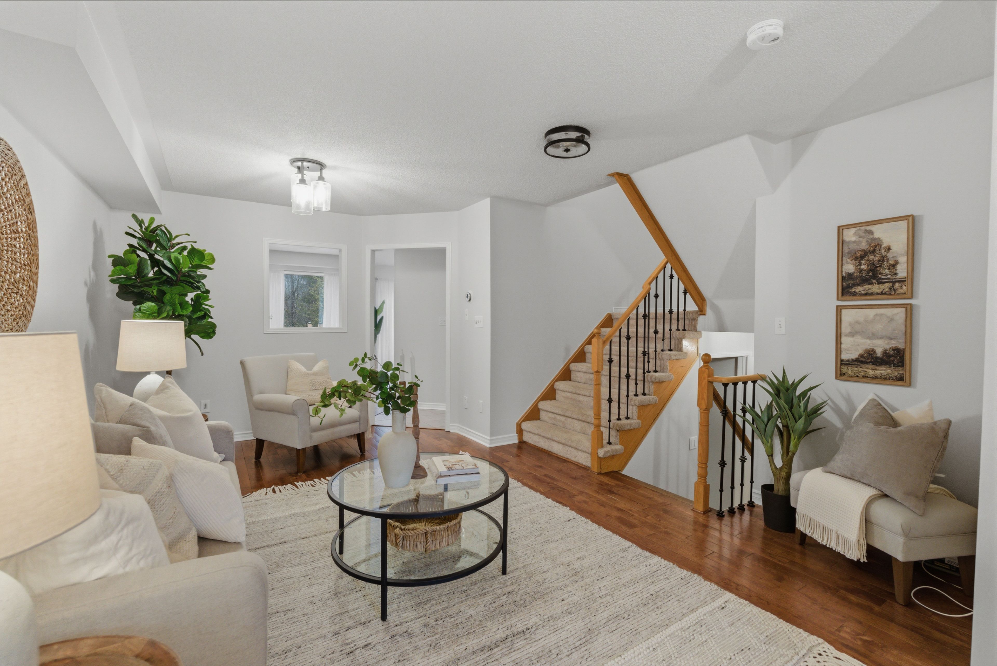 • Bright living room with hardwood floors and pot lights throughout.