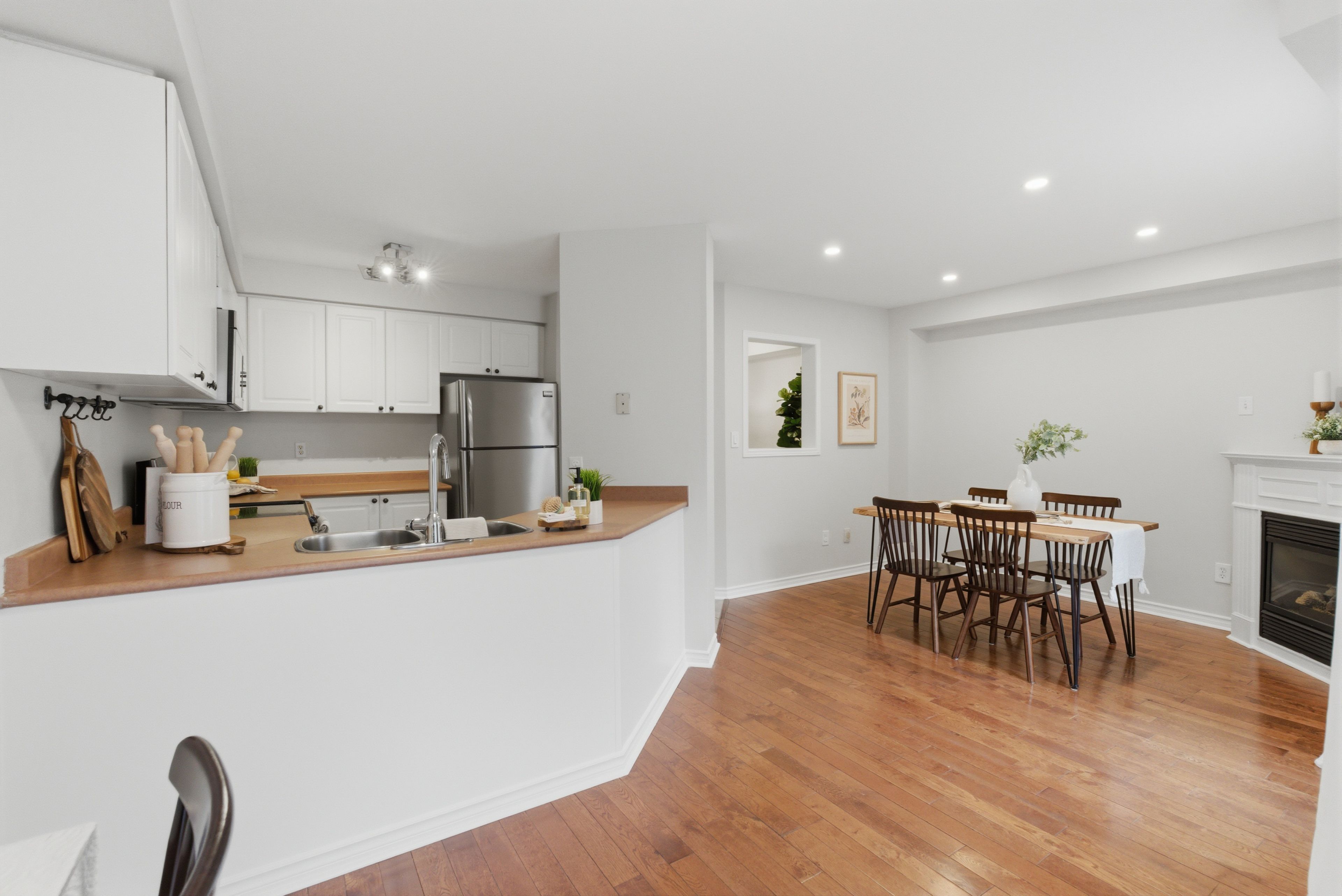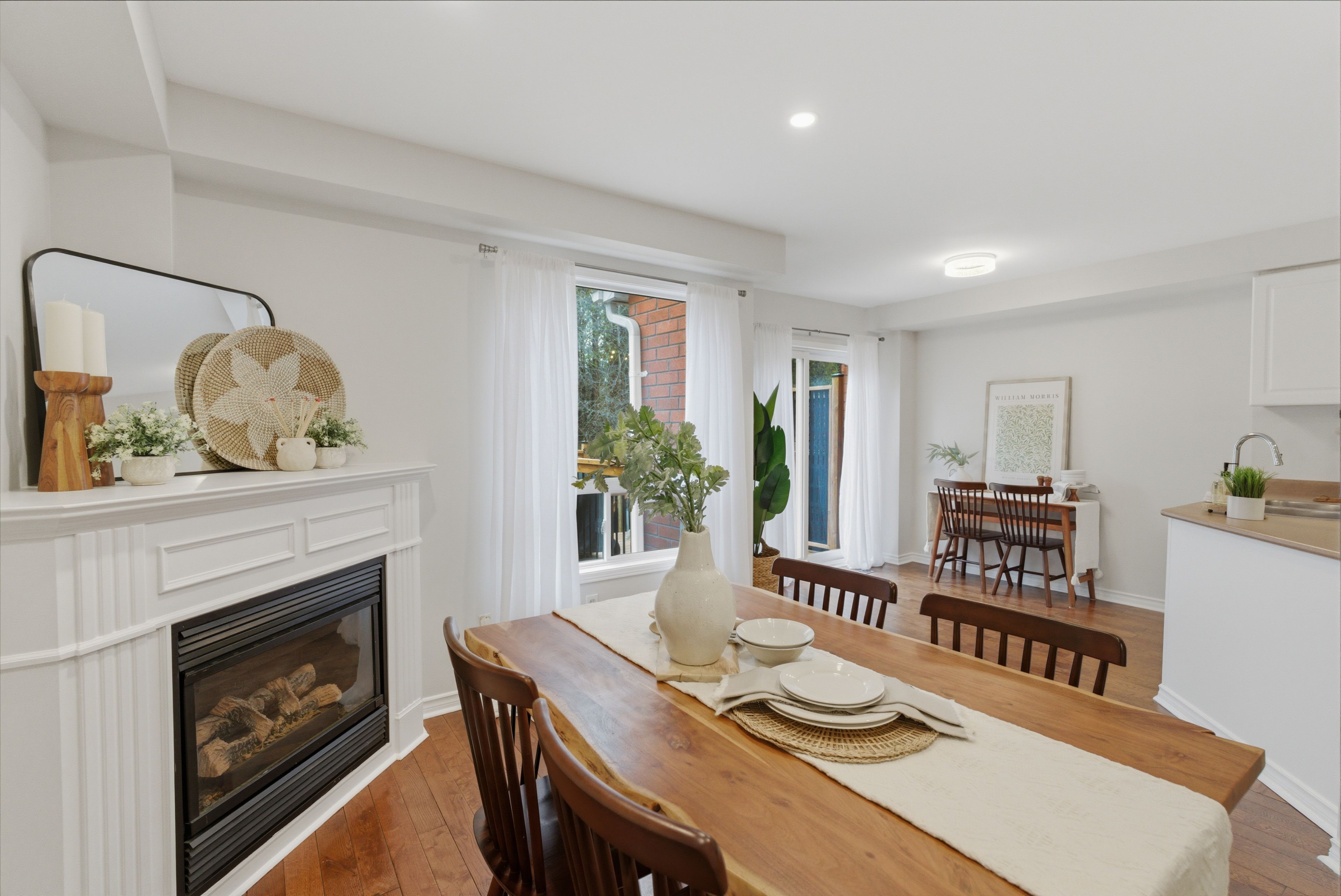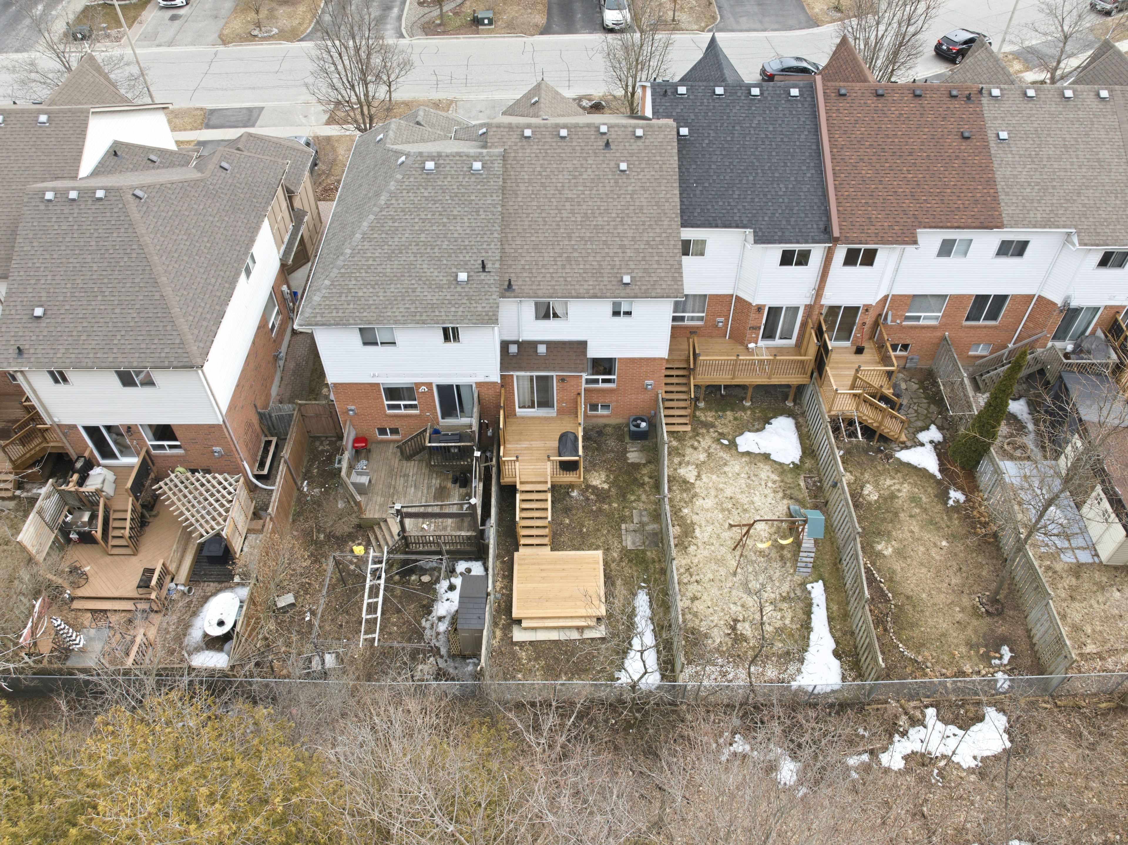 Welcome home to this beautiful gem, ideally located on a family-friendly street and backing onto a serene ravine. The main floor features hardwood flooring throughout, with a bright living room complete with pot lights. The dining area offers a cozy corner gas fireplace and a large window overlooking the backyard, seamlessly connected to a bright, white eat-in kitchen with a walkout to the deck, perfect for everyday living and entertaining. Upstairs, you'll find three spacious bedrooms, all with large windows. The primary bedroom includes a feature wall, walk-in closet and a generous 4-piece ensuite, while a 4-piece main bathroom adds convenience for the rest of the household. The finished basement provides additional living space with laminate flooring throughout, a beautiful tv feature wall, and a bar area, ideal for entertaining. It also features a dedicated laundry room, a large storage closet, and plenty of additional storage space under the stairs. Step outside to a private backyard retreat featuring a new two-level deck and backing onto a peaceful ravine, an ideal setting for relaxing or hosting guests. Located close to shopping, schools, transit & restaurants, this freehold townhome offers great space, a family-friendly setting, and a convenient location, the perfect place to call home! Extras: freshly painted (2026), backyard 2 level deck (2025), dishwasher (2025), pot lights (main floor) (2022), sink in powder room (2022), kitchen sink & faucet (2022).