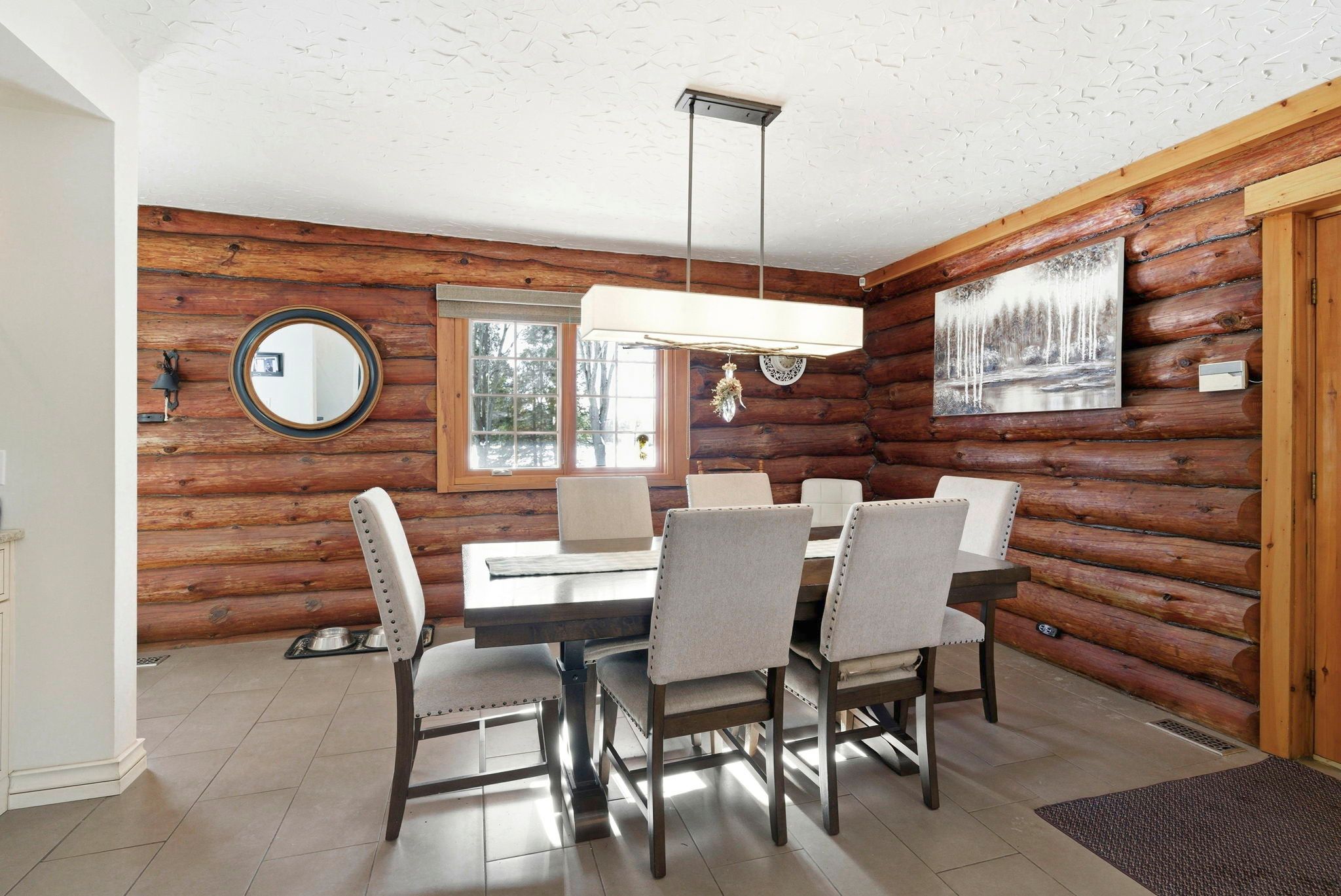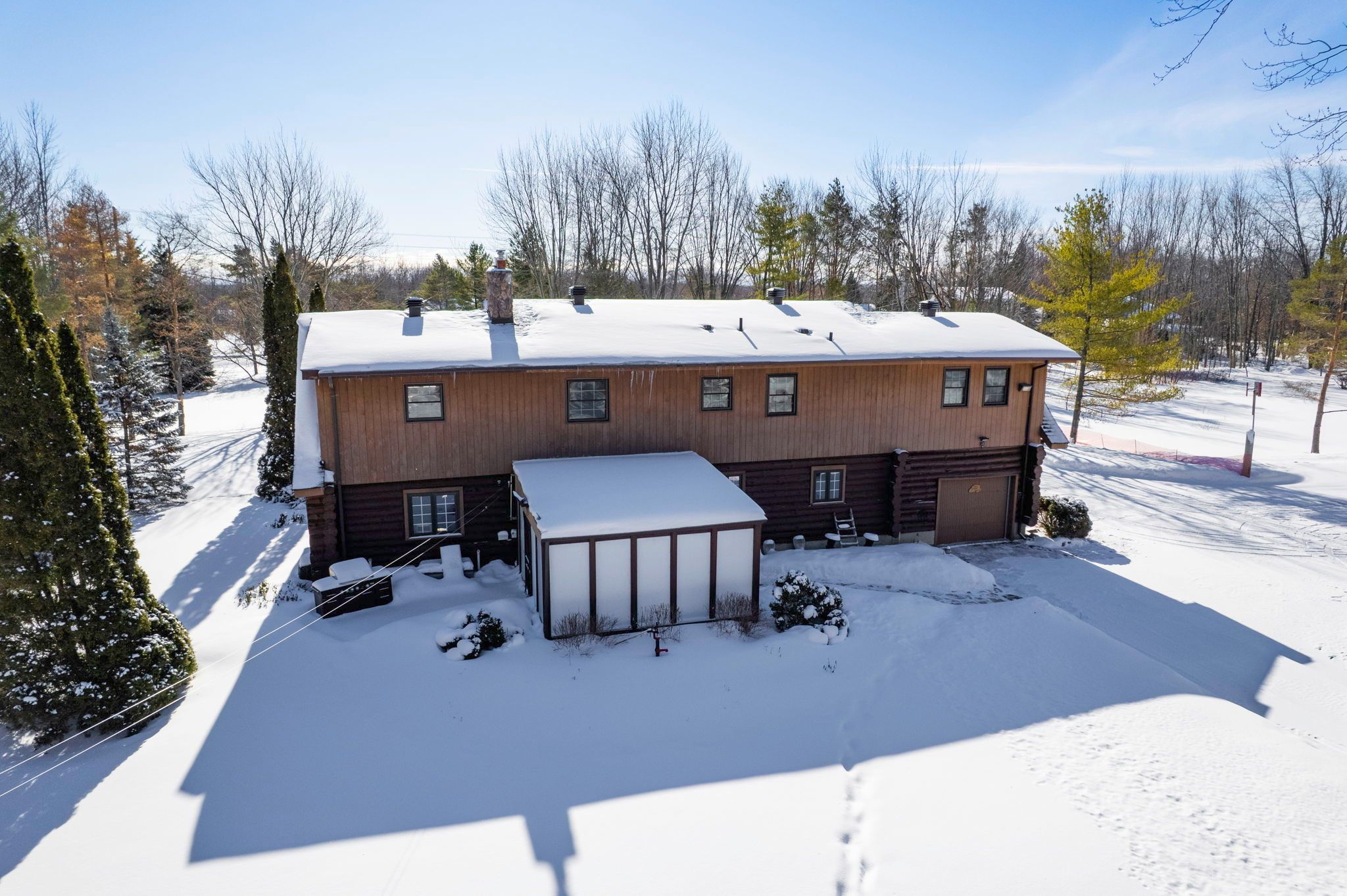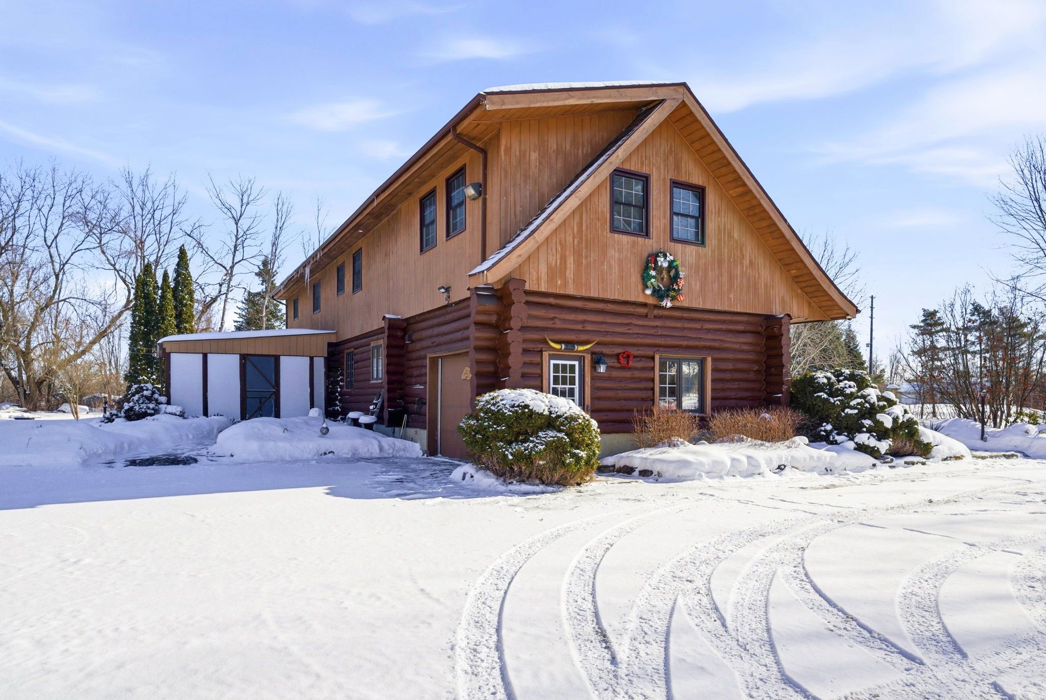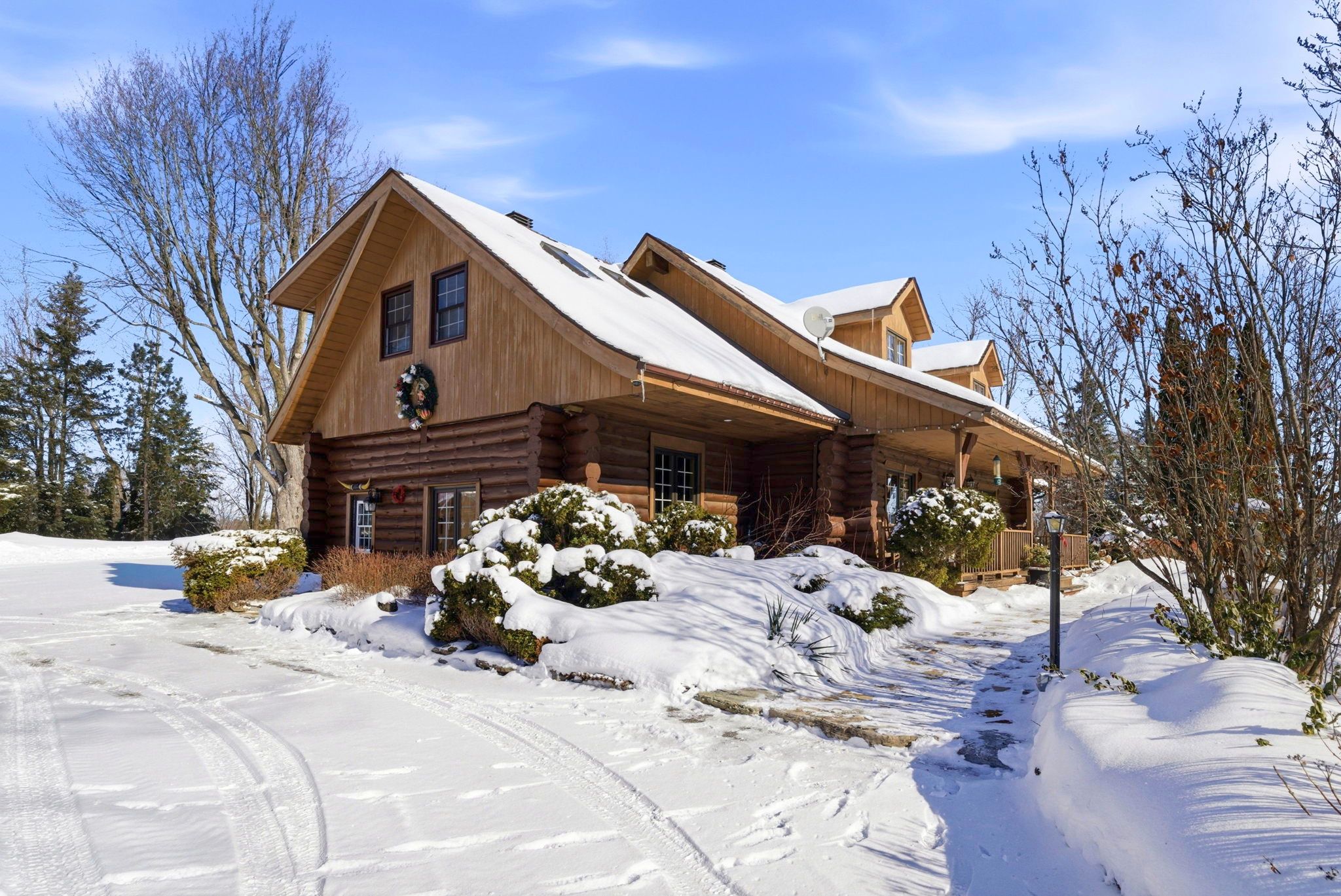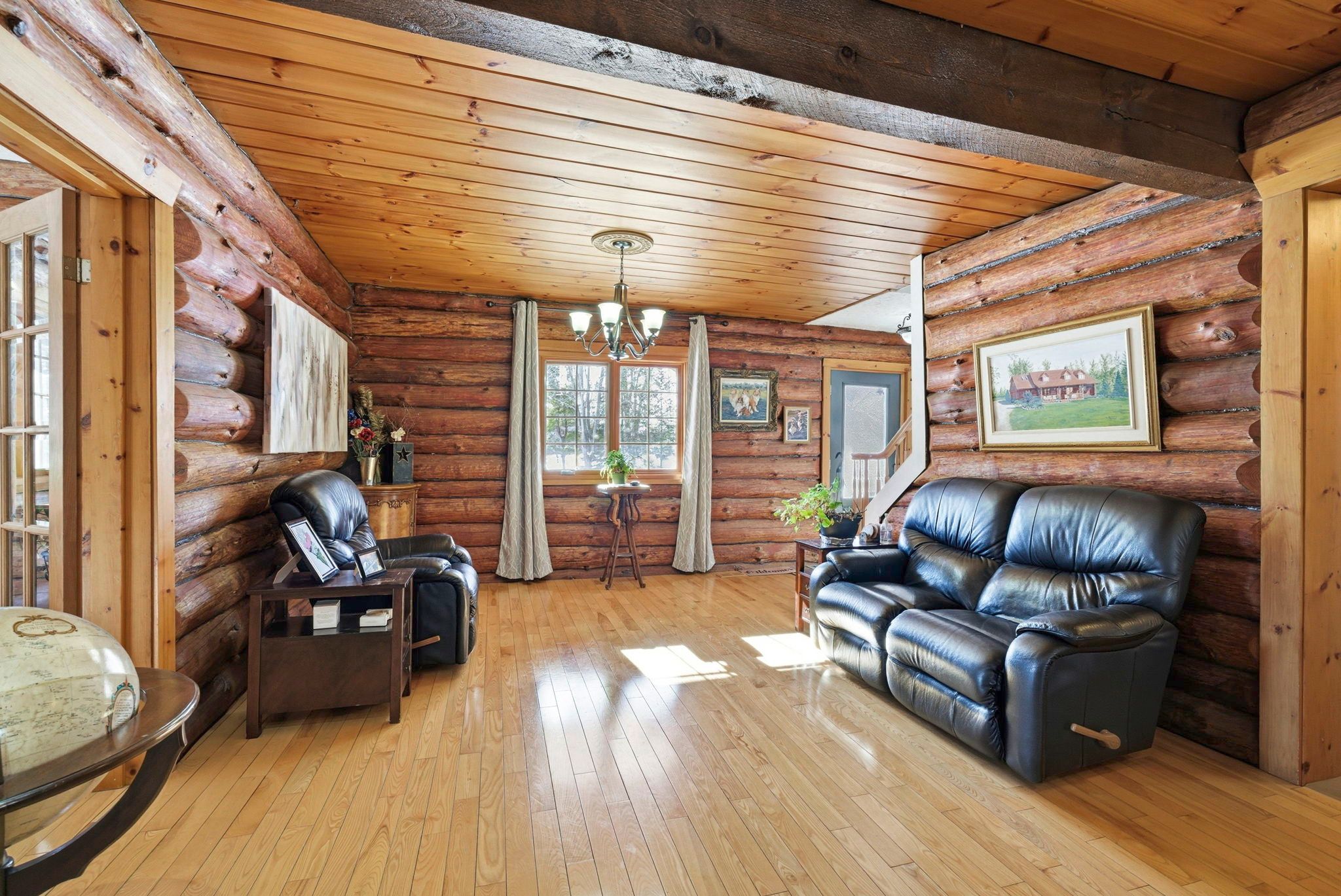 Welcome to this stunning 3,000 sq. Ft. Log home set on over 2 beautifully maintained acres just outside the city limits. Offering the perfect blend of peaceful rural living and convenient proximity to cornwall, this property is ideal for families seeking space, character, and comfort. From the moment you arrive, the charm is undeniable. A spacious front porch invites you to relax and enjoy the quiet surroundings. Inside, exposed wood throughout the main floor creates a warm, timeless atmosphere. The updated eat-in kitchen features custom cabinetry, granite countertops, and a large island perfect for gathering. The inviting living room is highlighted by a striking stone fireplace with a gas insert and patio doors leading to the expansive screened-in patio, ideal for evening relaxation. A separate main-floor family room offers additional living space, and a convenient 2-piece bath combined with laundry adds everyday practicality. Upstairs you'll find four generously sized bedrooms. The primary suite includes a private 3-piece ensuite and a bonus room that could serve as a fifth bedroom, office, nursery, or exercise space. A full bathroom and an additional second-floor family room provide flexibility for growing families. The basement is currently used for storage but offers excellent potential for future development, with a walk-out from the attached single-car garage. Outside, the immaculate yard showcases mature landscaping, stone walkways, multiple patio areas, and a fire pit, perfect for entertaining or peaceful evenings under the stars. With ample parking and space for campers, boats, or recreational vehicles, this property blends lifestyle and practicality. Located minutes to cornwall, approximately one hour to ottawa and just over an hour to montreal, this home offers space, warmth, and character you won't want to miss.
