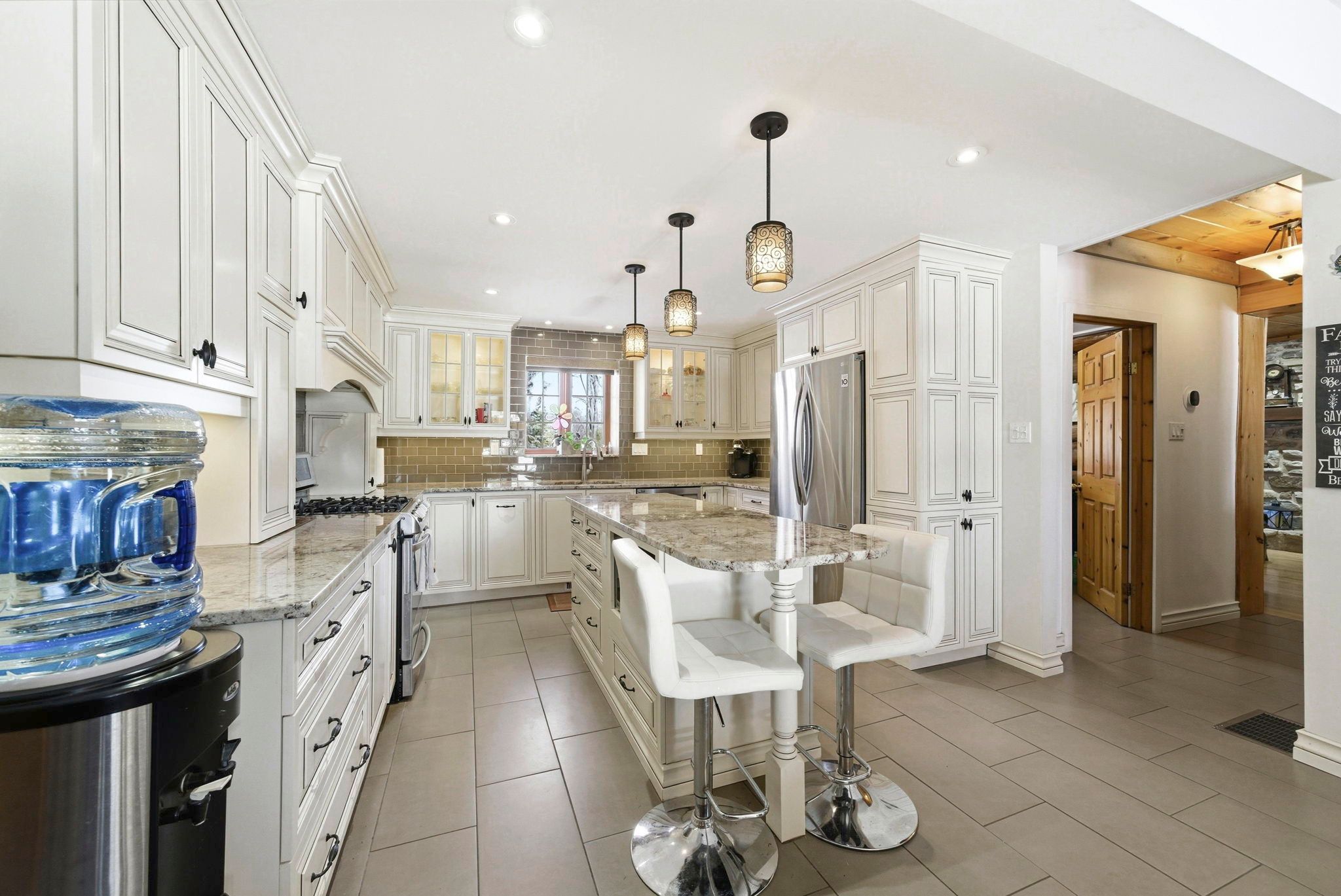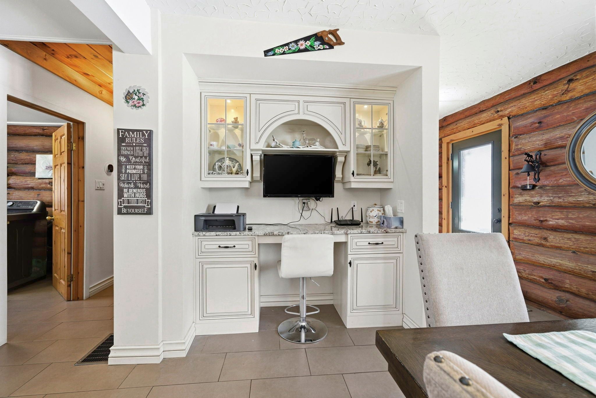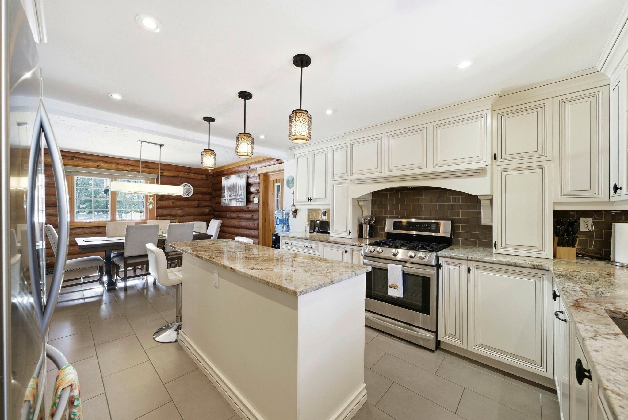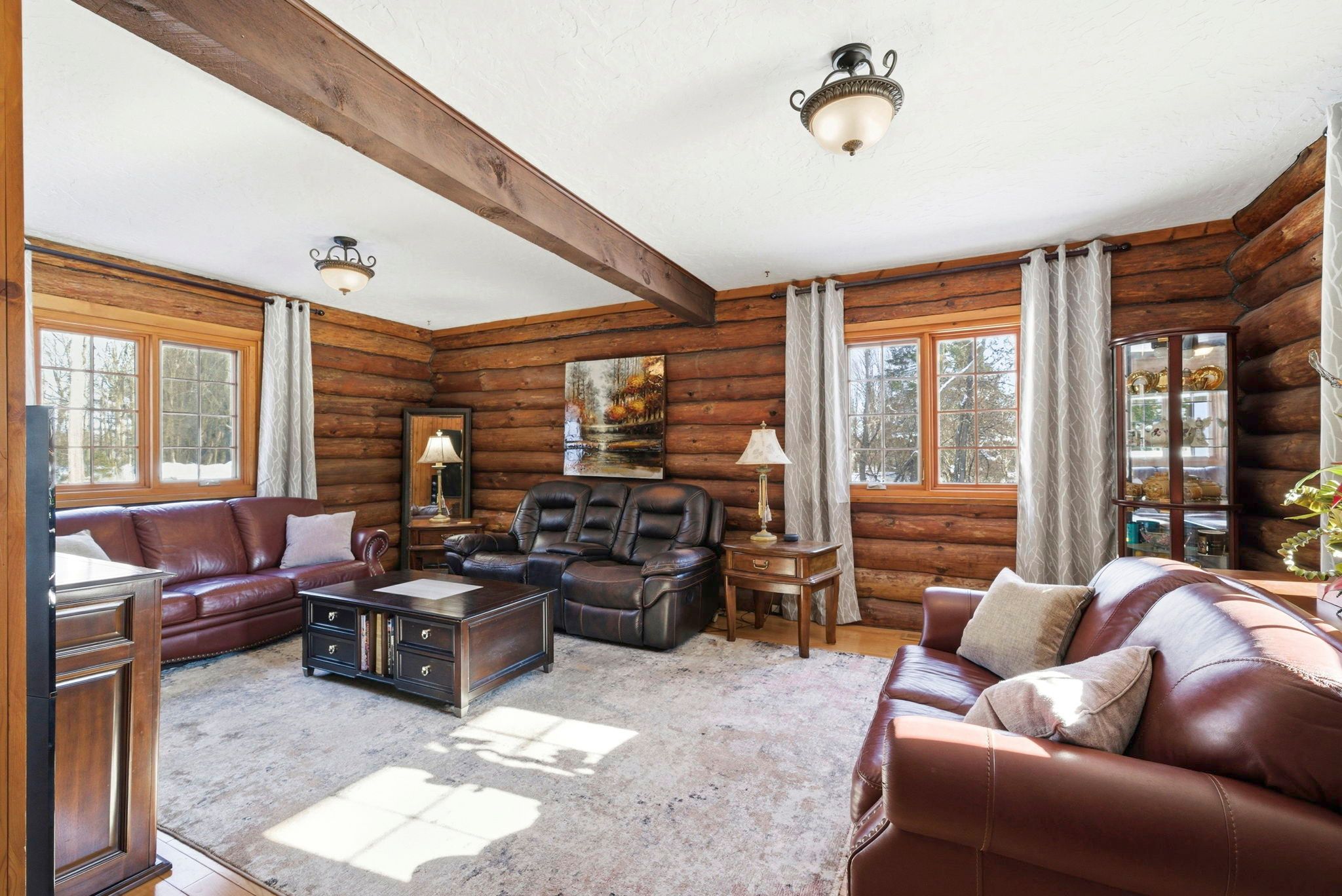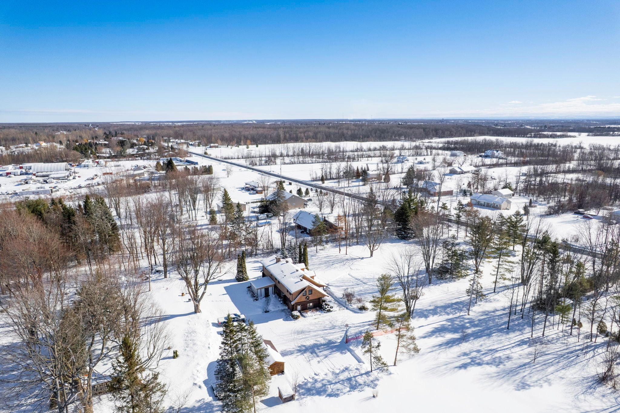 Welcome to this stunning 3,000 sq. Ft. Log home set on over 2 beautifully maintained acres just outside the city limits. Offering the perfect blend of peaceful rural living and convenient proximity to cornwall, this property is ideal for families seeking space, character, and comfort. From the moment you arrive, the charm is undeniable. A spacious front porch invites you to relax and enjoy the quiet surroundings. Inside, exposed wood throughout the main floor creates a warm, timeless atmosphere. The updated eat-in kitchen features custom cabinetry, granite countertops, and a large island perfect for gathering. The inviting living room is highlighted by a striking stone fireplace with a gas insert and patio doors leading to the expansive screened-in patio, ideal for evening relaxation. A separate main-floor family room offers additional living space, and a convenient 2-piece bath combined with laundry adds everyday practicality. Upstairs you'll find four generously sized bedrooms. The primary suite includes a private 3-piece ensuite and a bonus room that could serve as a fifth bedroom, office, nursery, or exercise space. A full bathroom and an additional second-floor family room provide flexibility for growing families. The basement is currently used for storage but offers excellent potential for future development, with a walk-out from the attached single-car garage. Outside, the immaculate yard showcases mature landscaping, stone walkways, multiple patio areas, and a fire pit, perfect for entertaining or peaceful evenings under the stars. With ample parking and space for campers, boats, or recreational vehicles, this property blends lifestyle and practicality. Located minutes to cornwall, approximately one hour to ottawa and just over an hour to montreal, this home offers space, warmth, and character you won't want to miss.