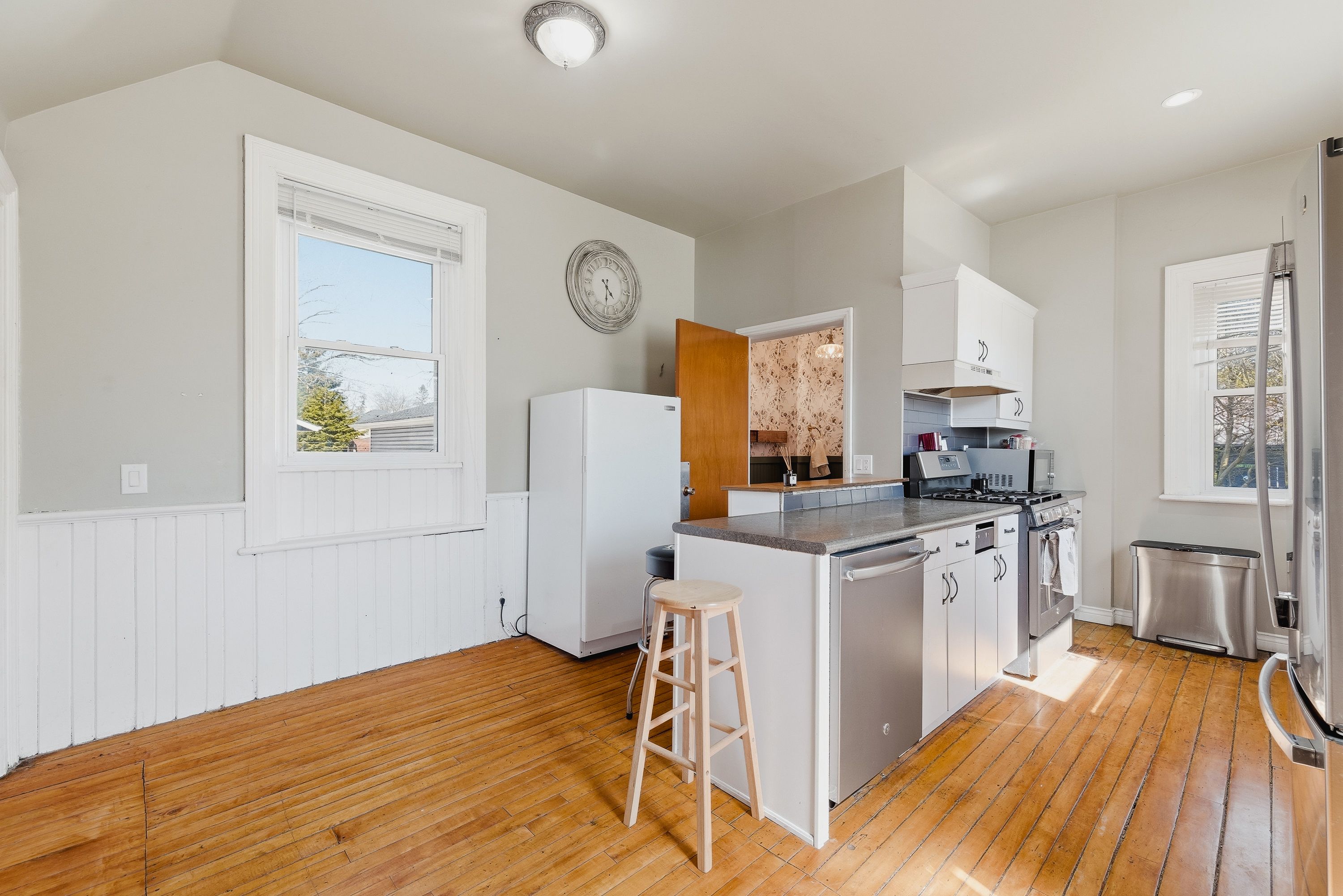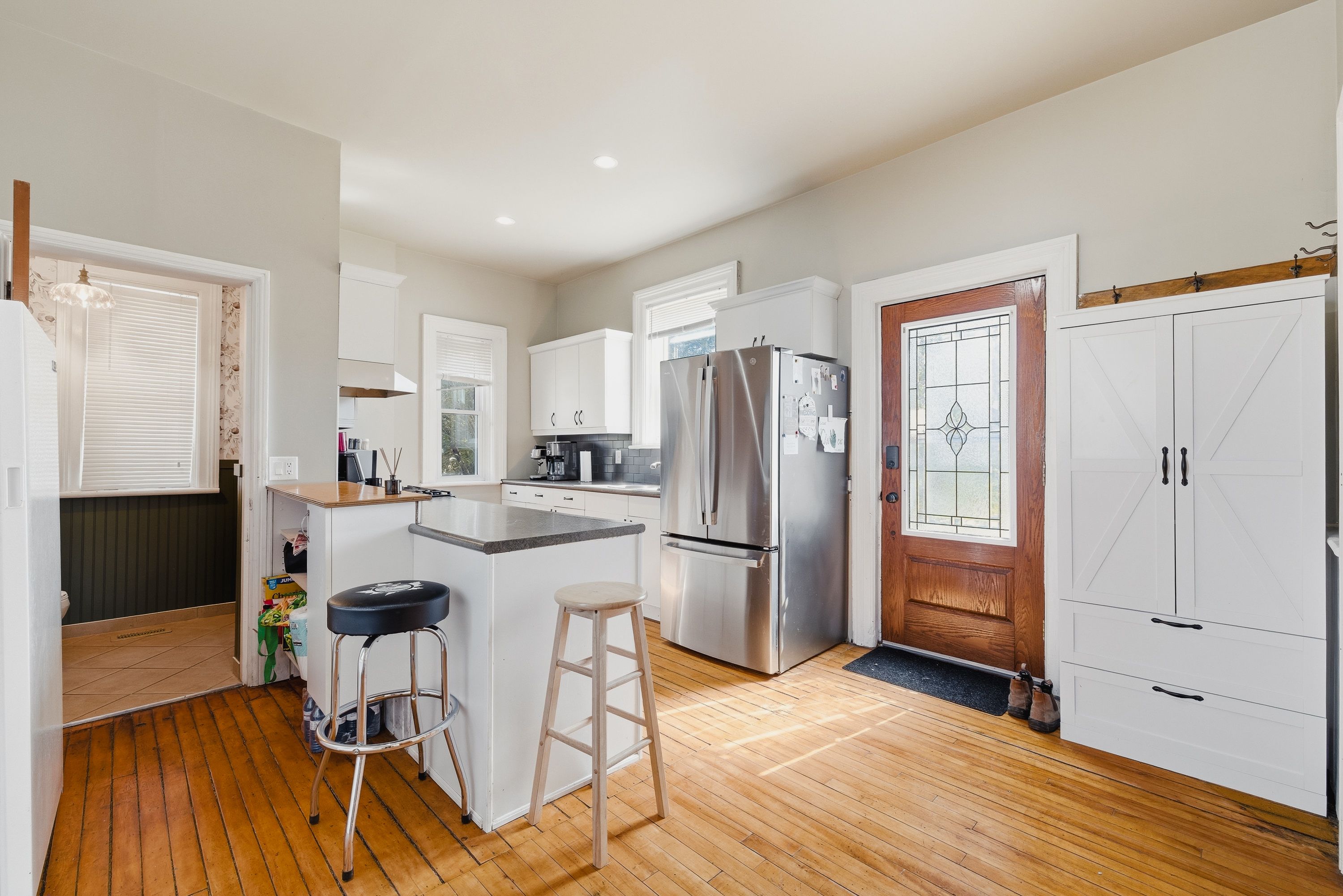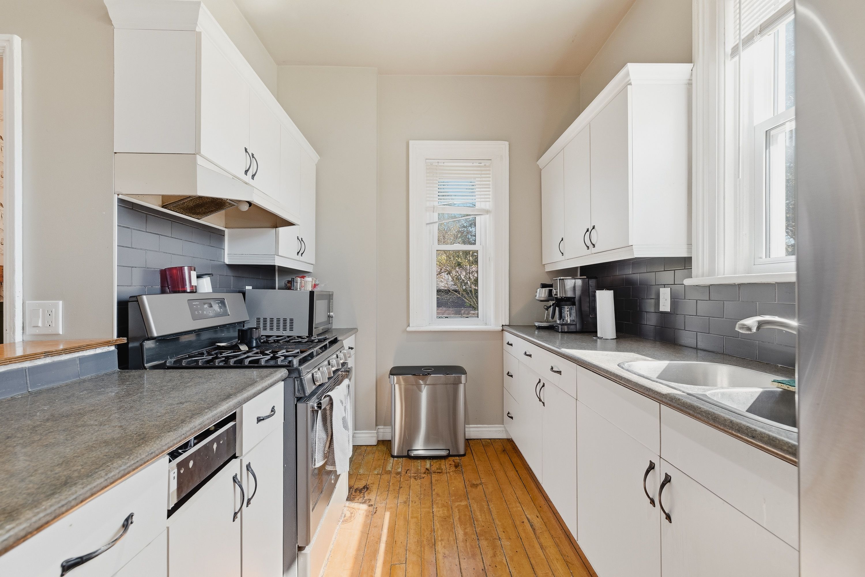 • Three bedrooms and two bathrooms with original wood floors and high ceilings.