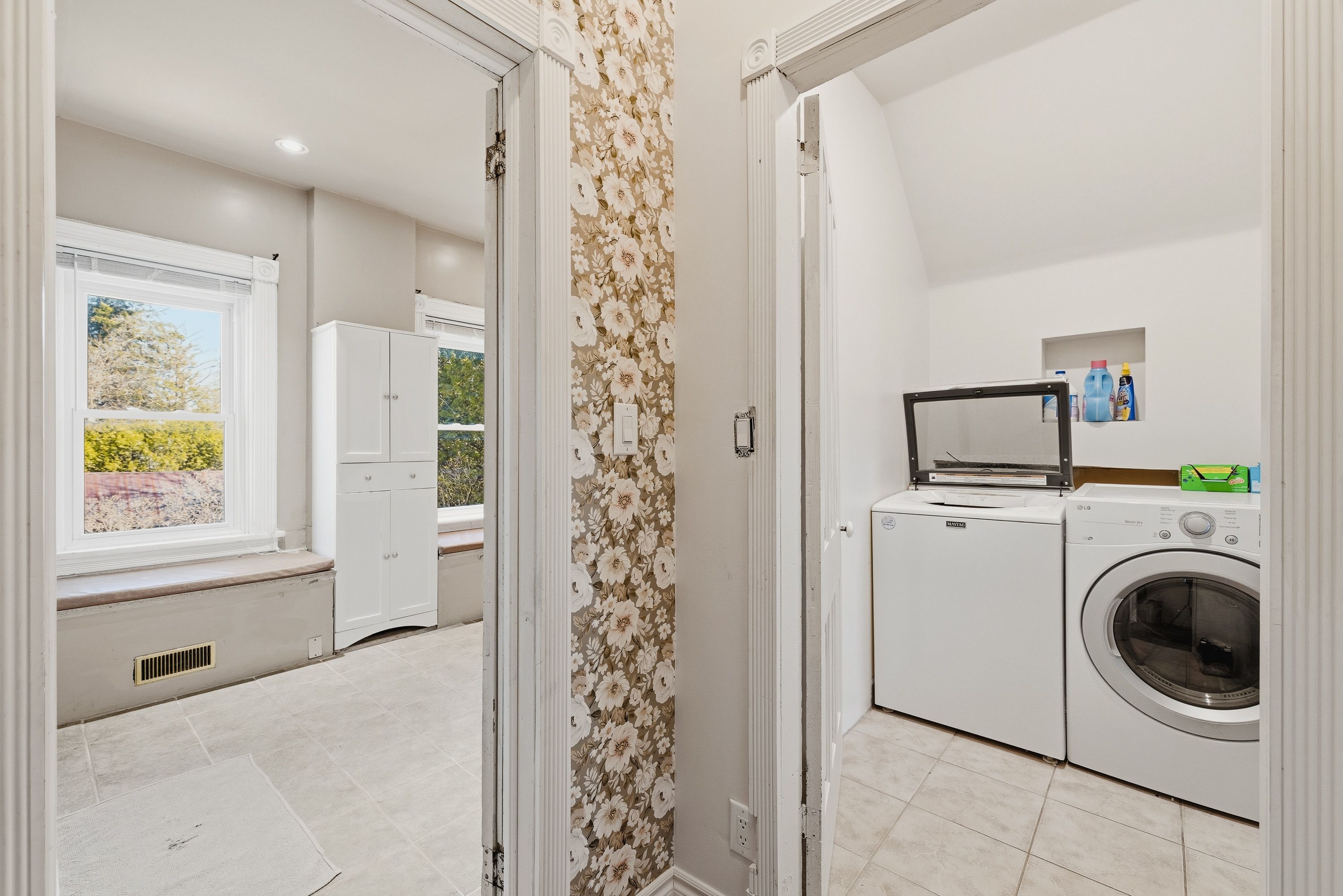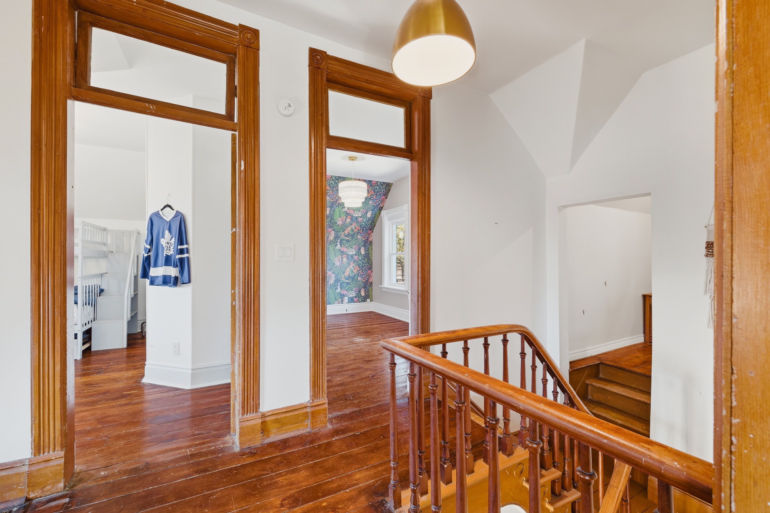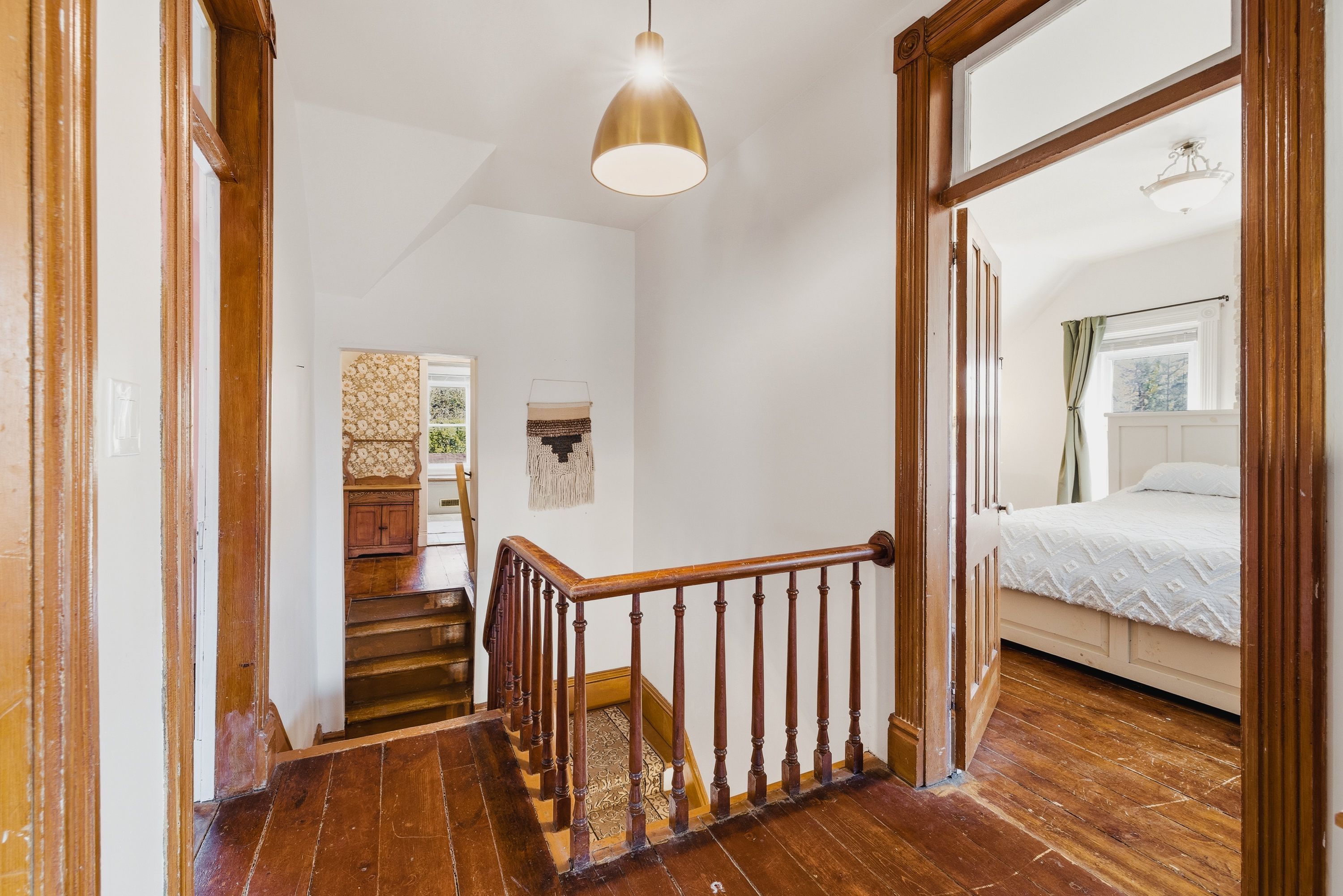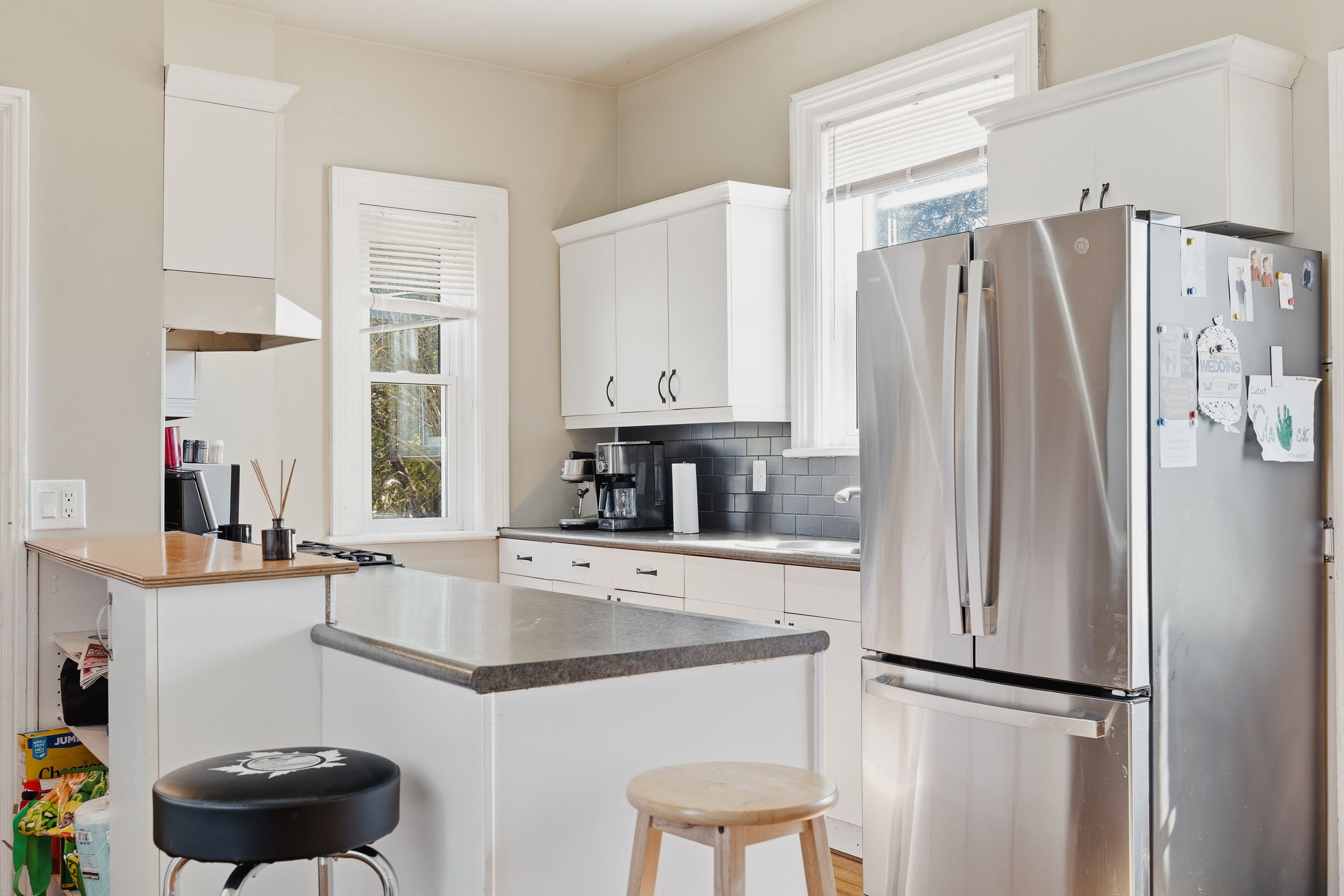 • Three bedrooms and two bathrooms with original wood floors and high ceilings.