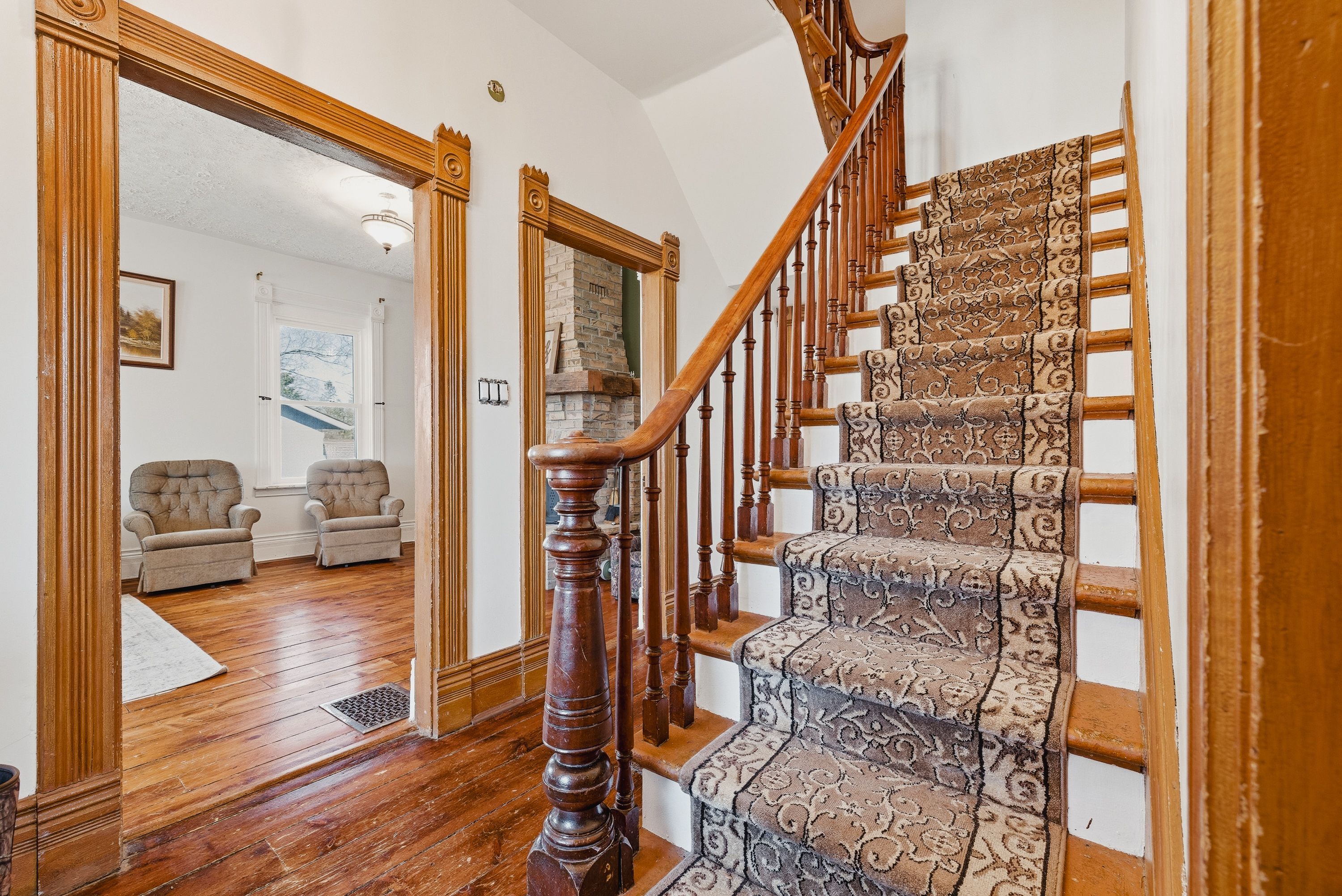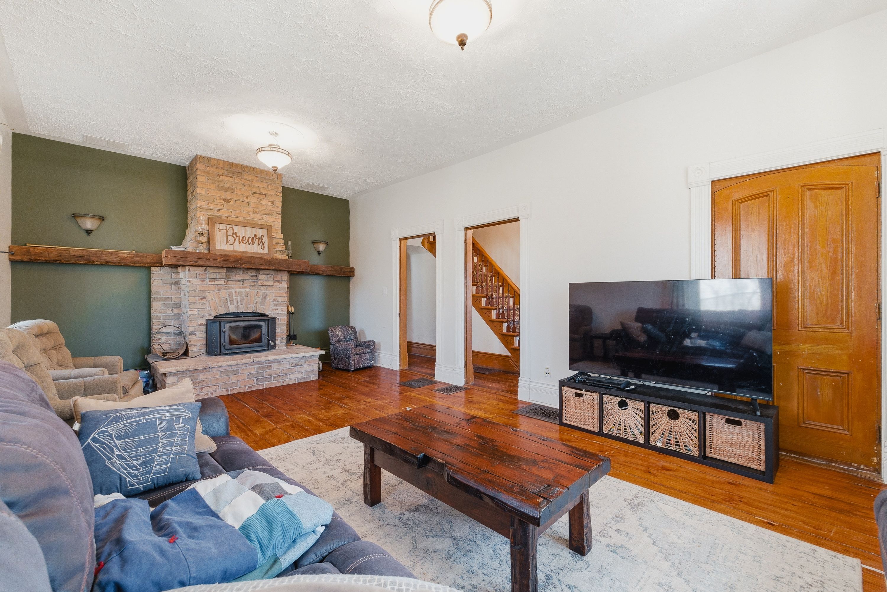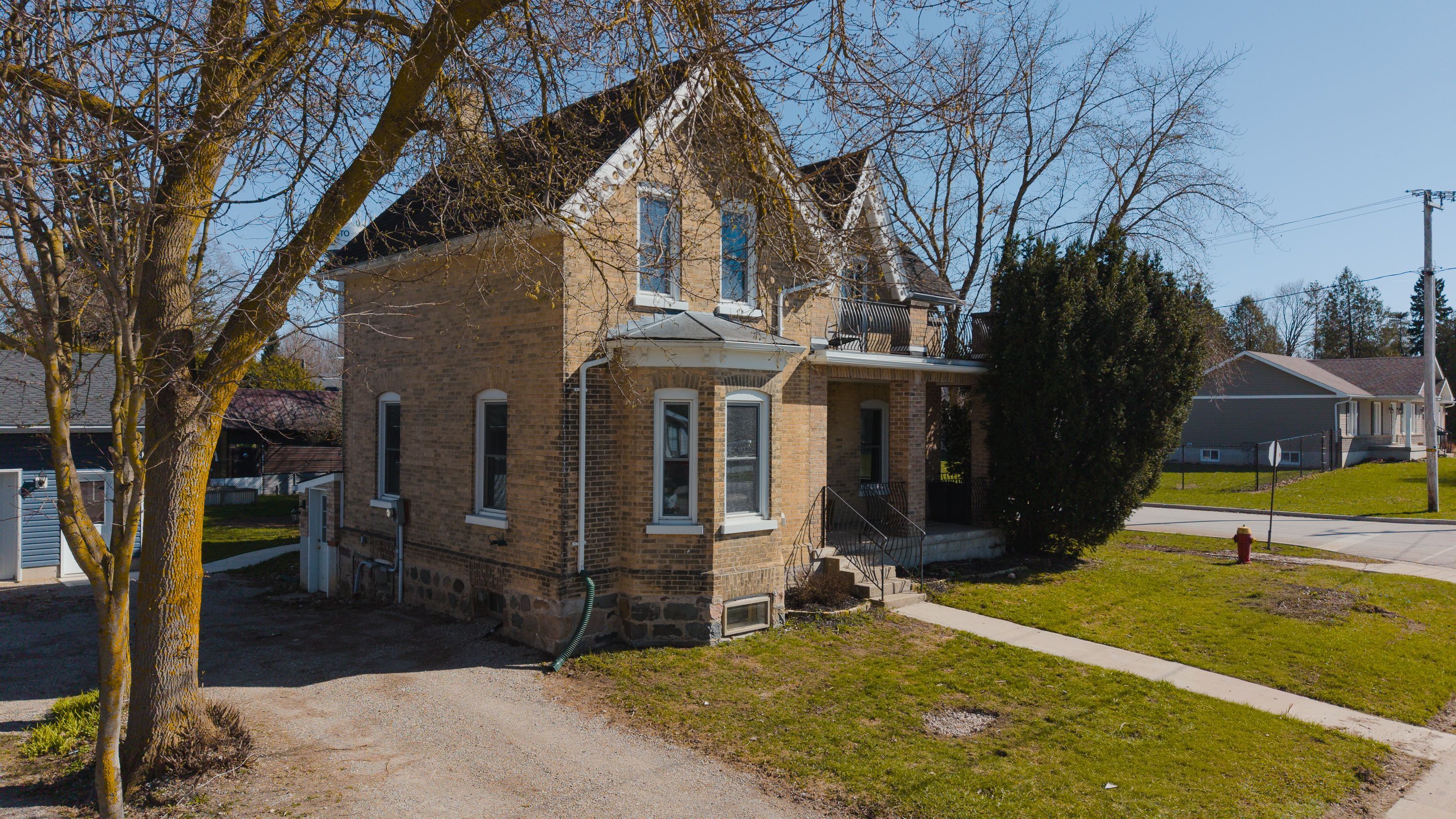 Welcome to 17 allan street west, a charming yellow brick home set in the peaceful community of clifford. Located on a large corner lot in a quiet neighbourhood, this property is just steps from local shops, downtown conveniences, and the green space of cenotaph park, offering a perfect blend of small-town living and everyday accessibility. This solid 1. 5-storey home features 3 bedrooms and 2 bathrooms, with timeless character throughout including original wood floors, trim, and soaring ceilings. The main floor offers a spacious living room with a rustic wood-burning fireplace, a formal dining area, kitchen, and an updated 2-piece bath. Upstairs, you'll find three generous bedrooms, including a primary bedroom with its own private second-floor balcony, a large 4-piece bathroom with ensuite privileges, and the convenience of second-floor laundry. The unfinished basement includes a workshop area, ample storage, and a separate walk-up entrance. Major updates include a furnace and a/c (2022), with no rental items. Outside, enjoy a partially fenced yard with mature trees, garden beds, and a large deck-perfect for relaxing or entertaining. A standout feature is the 30 x 30 heated and insulated detached workshop, ideal for hobbies or additional workspace. A wonderful opportunity to own a character-filled home with modern updates in a welcoming community.