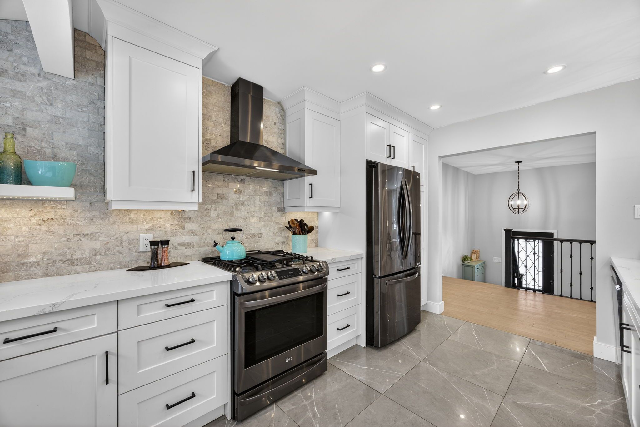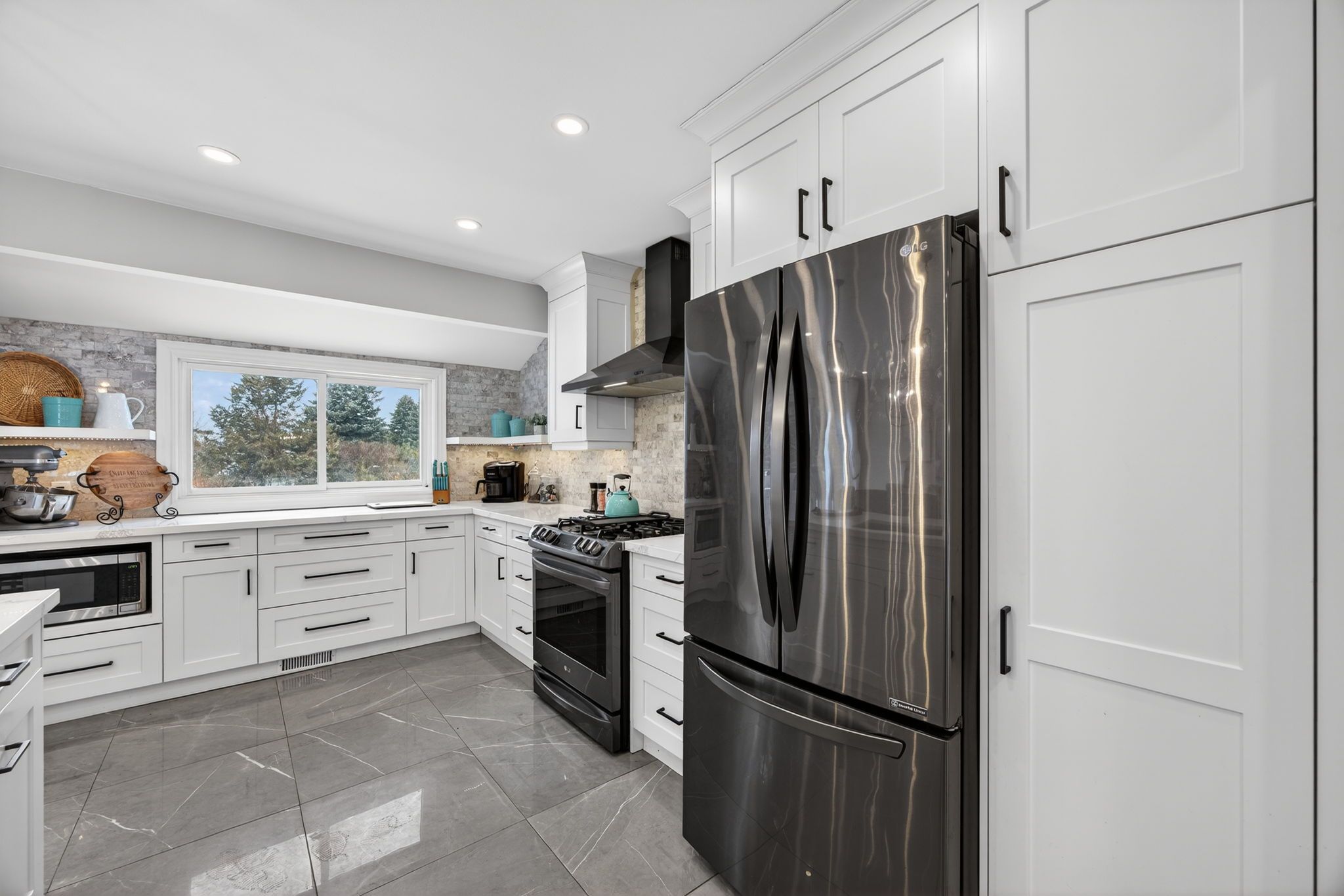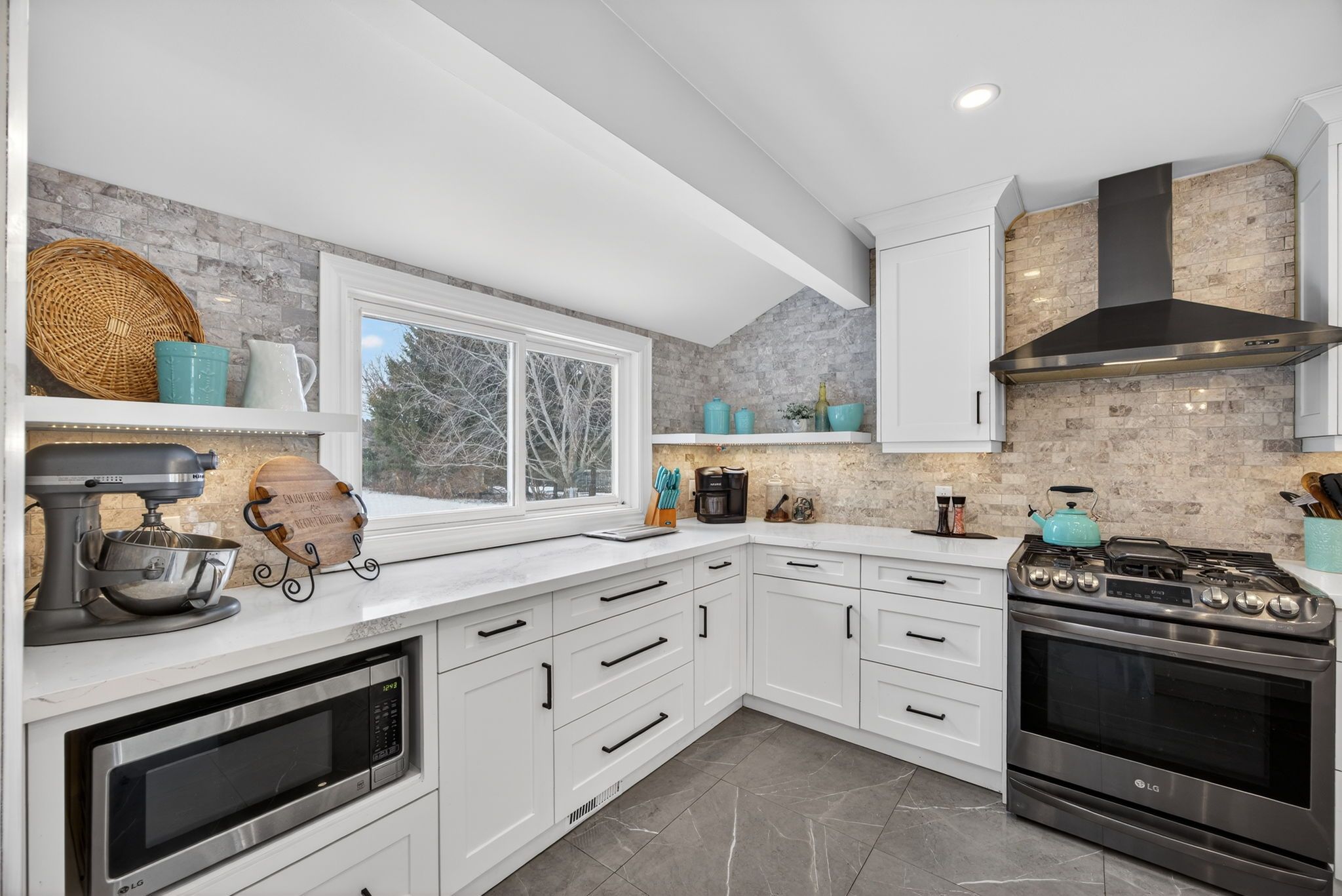 • Stylish kitchen with quartz countertops and stainless steel appliances.