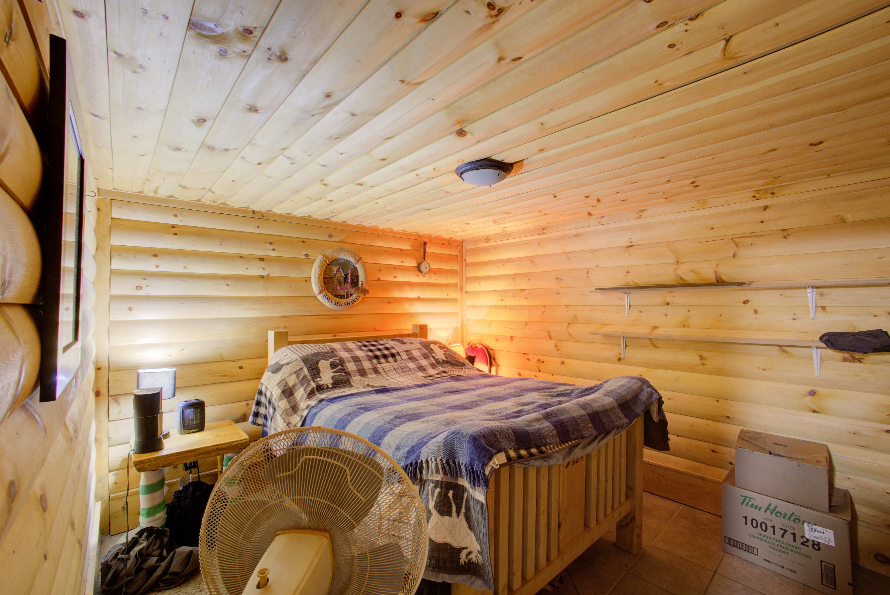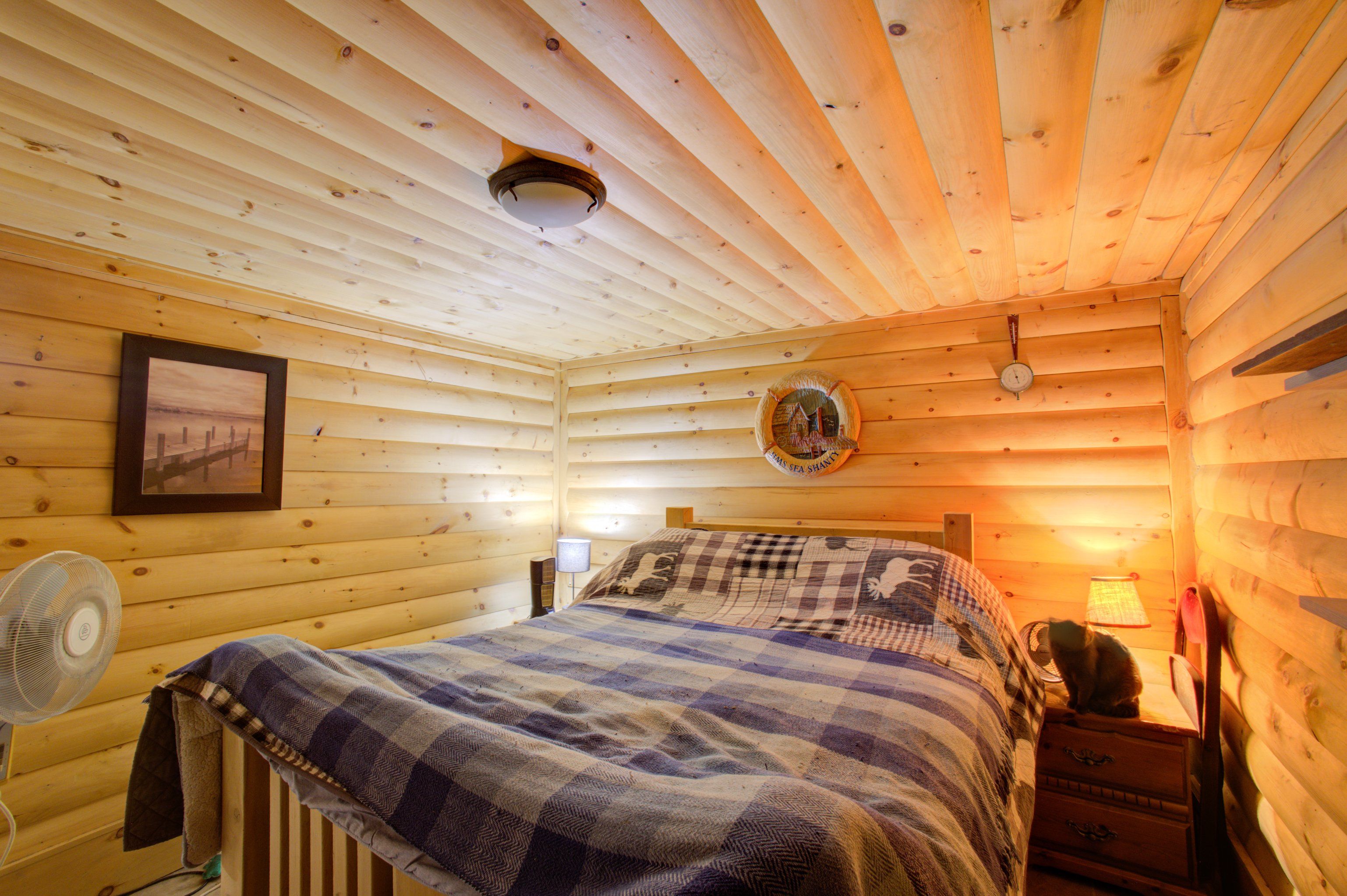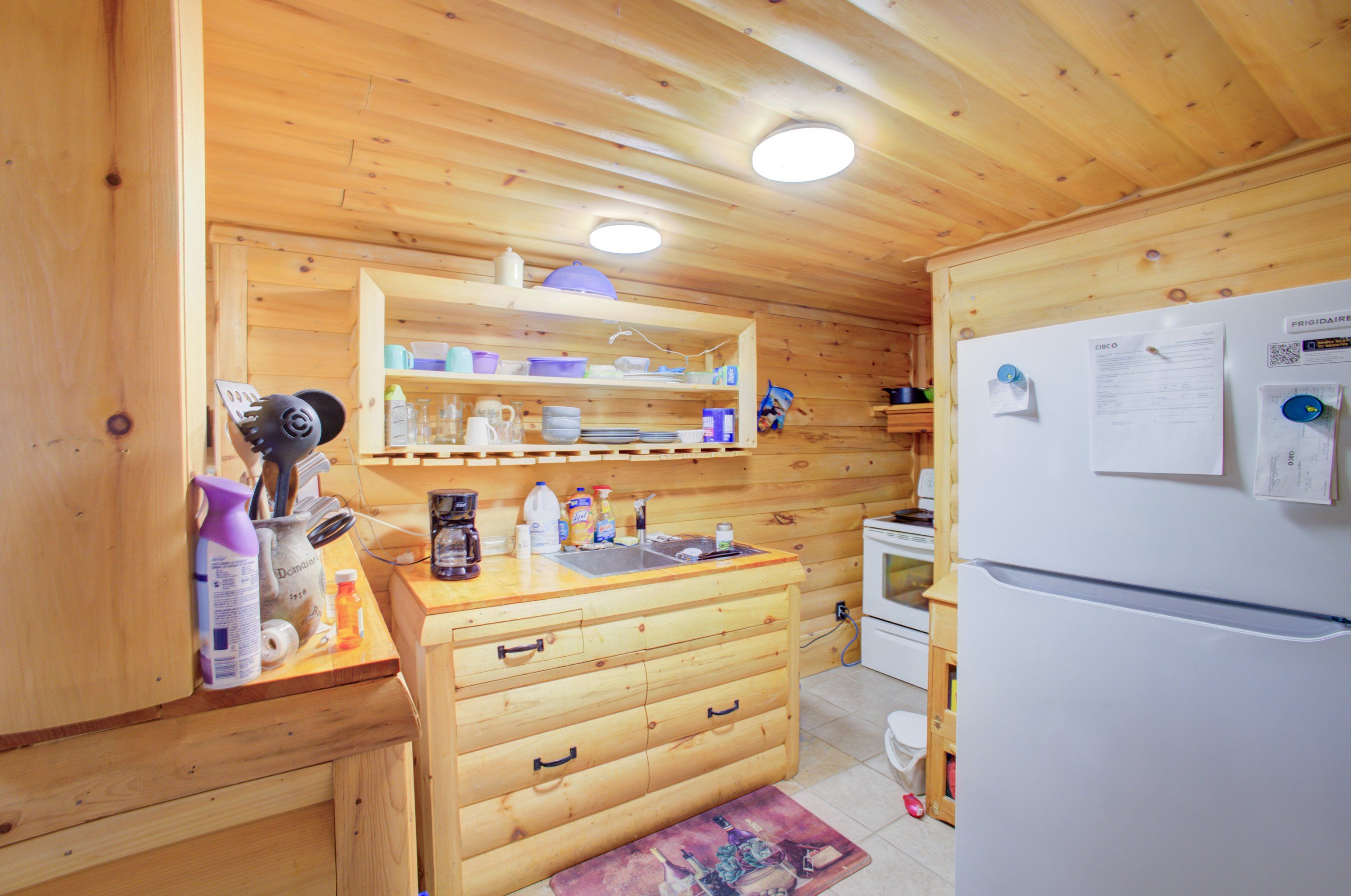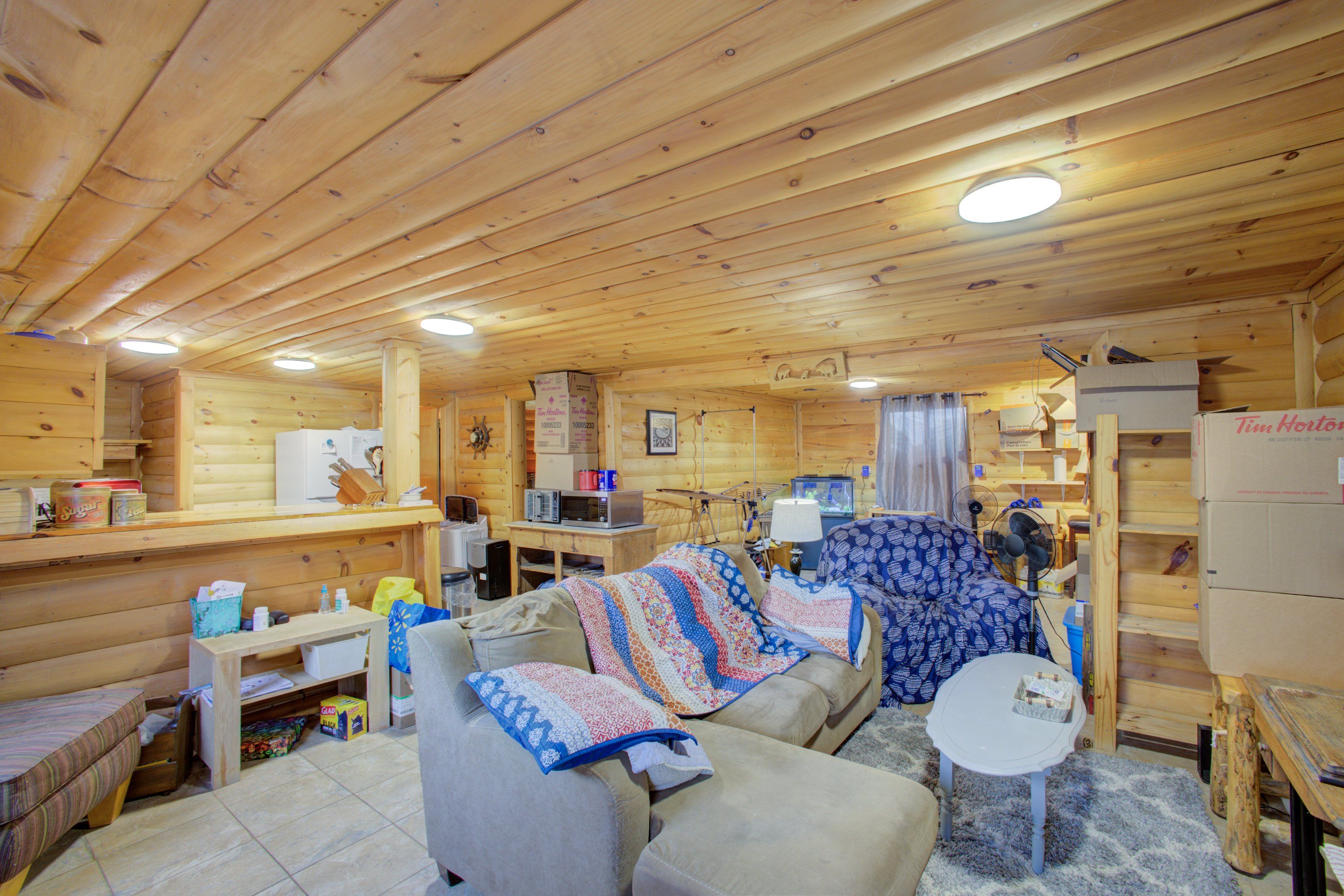 • Inviting living room with high ceilings and a cozy woodstove.