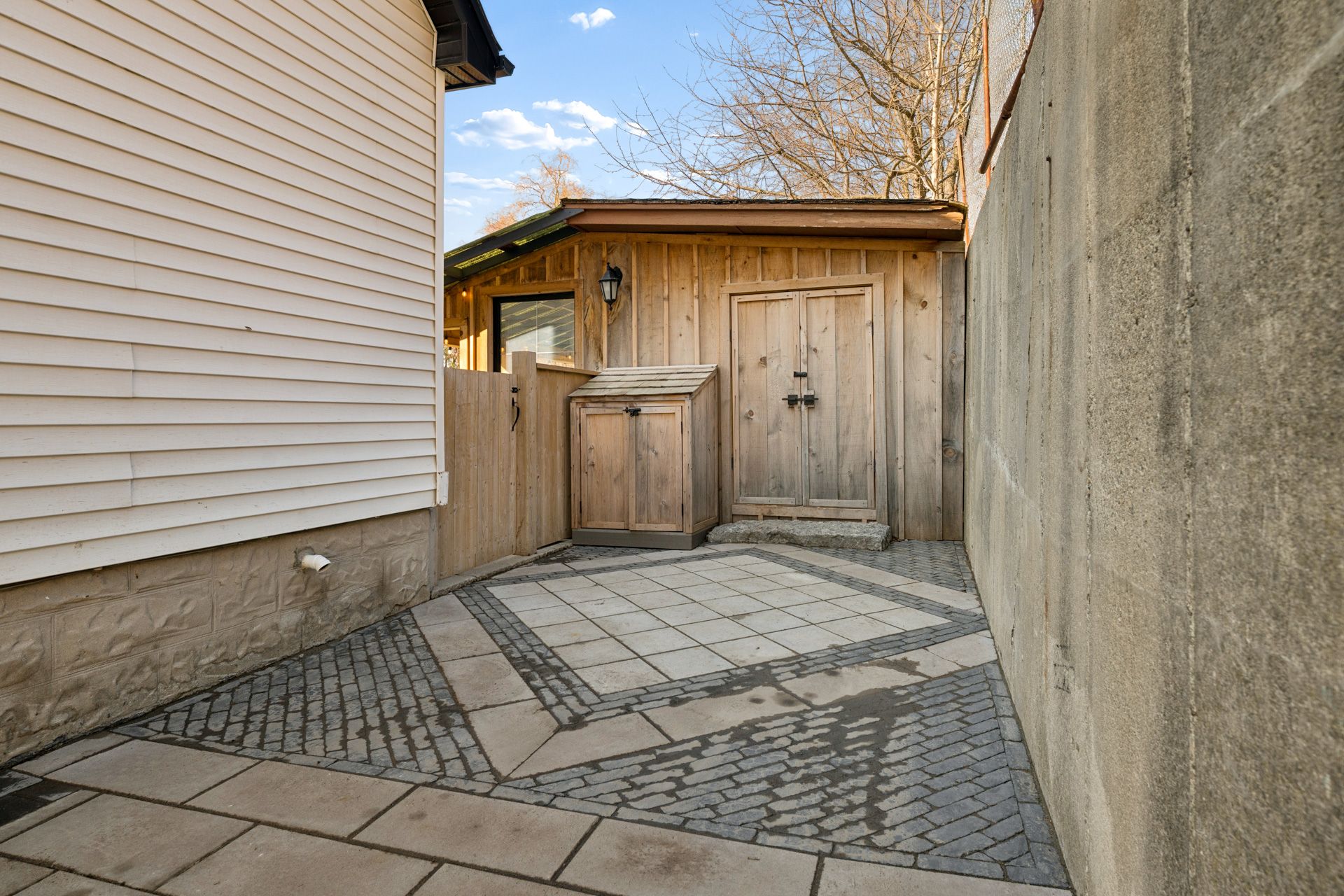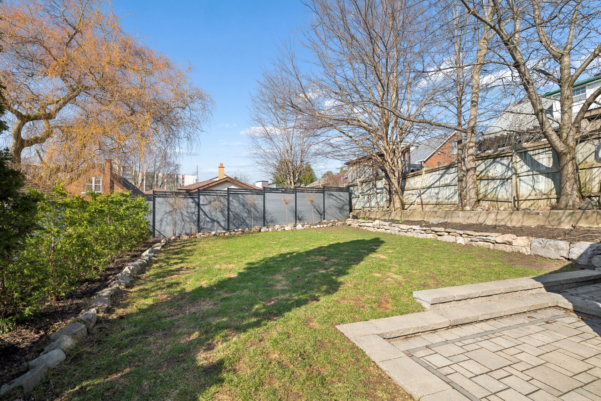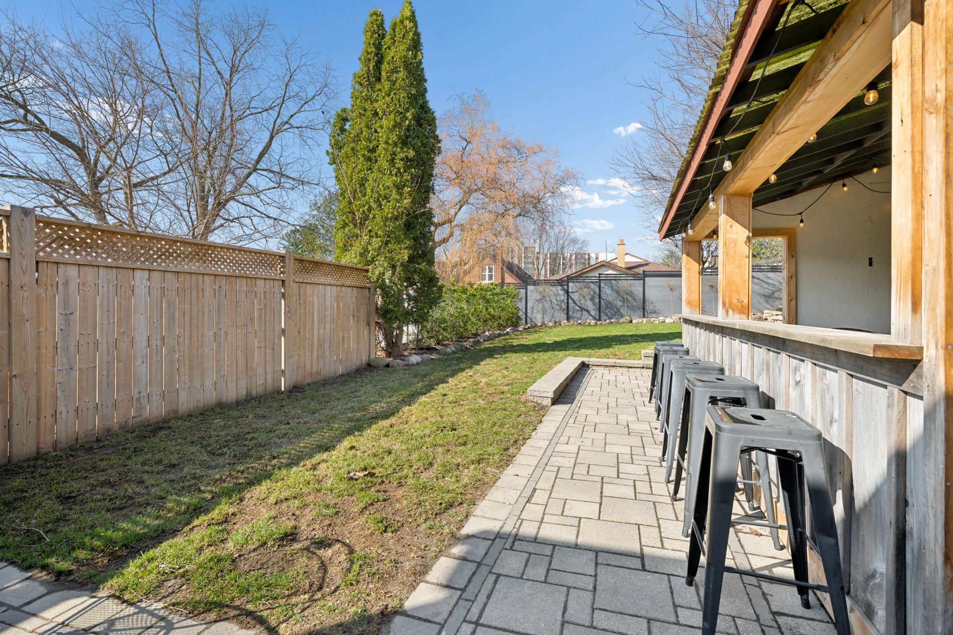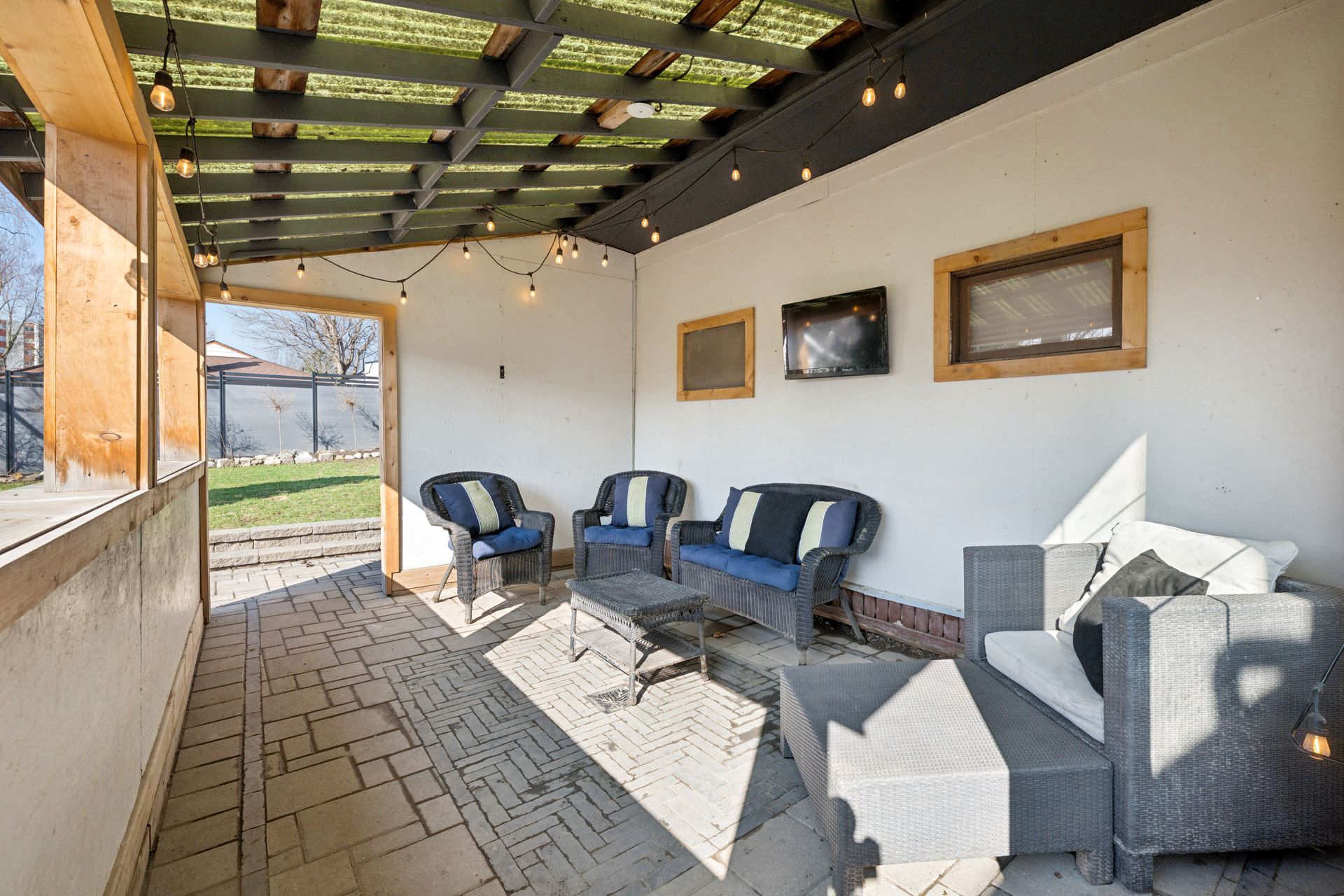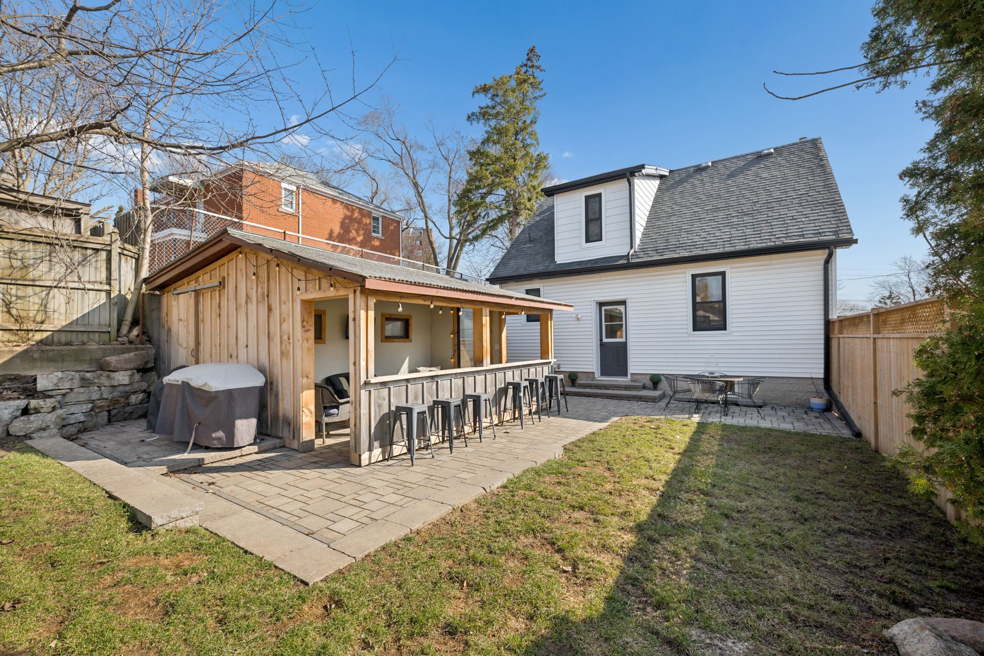 • Professionally landscaped backyard with a covered structure and lounge area.