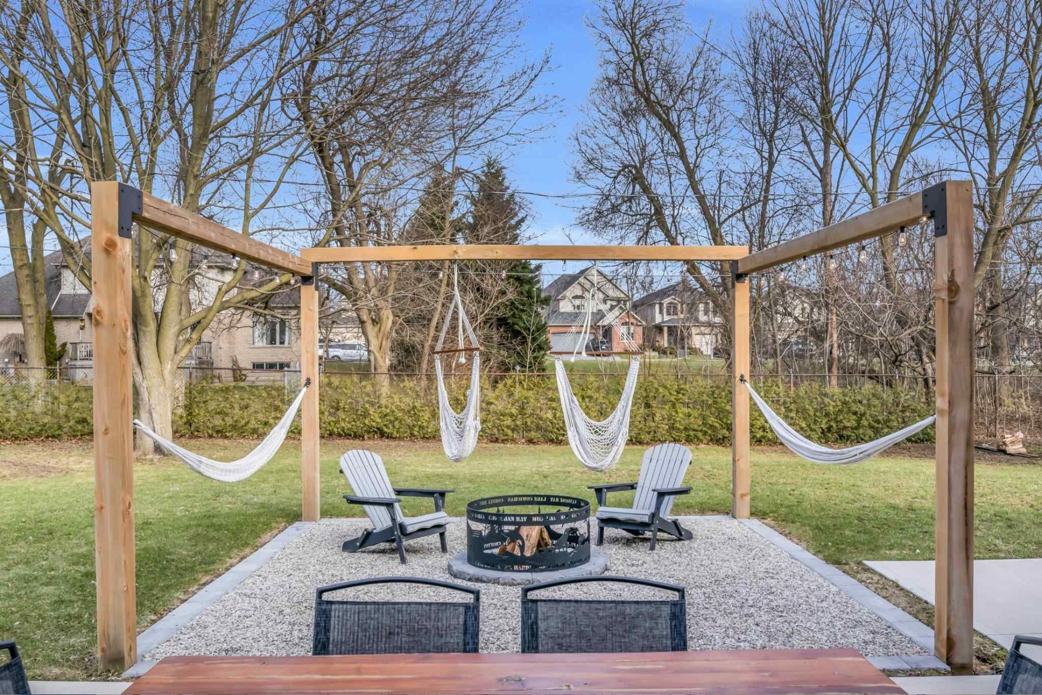 • Private outdoor space with multiple patios, pergola, and firepit area.