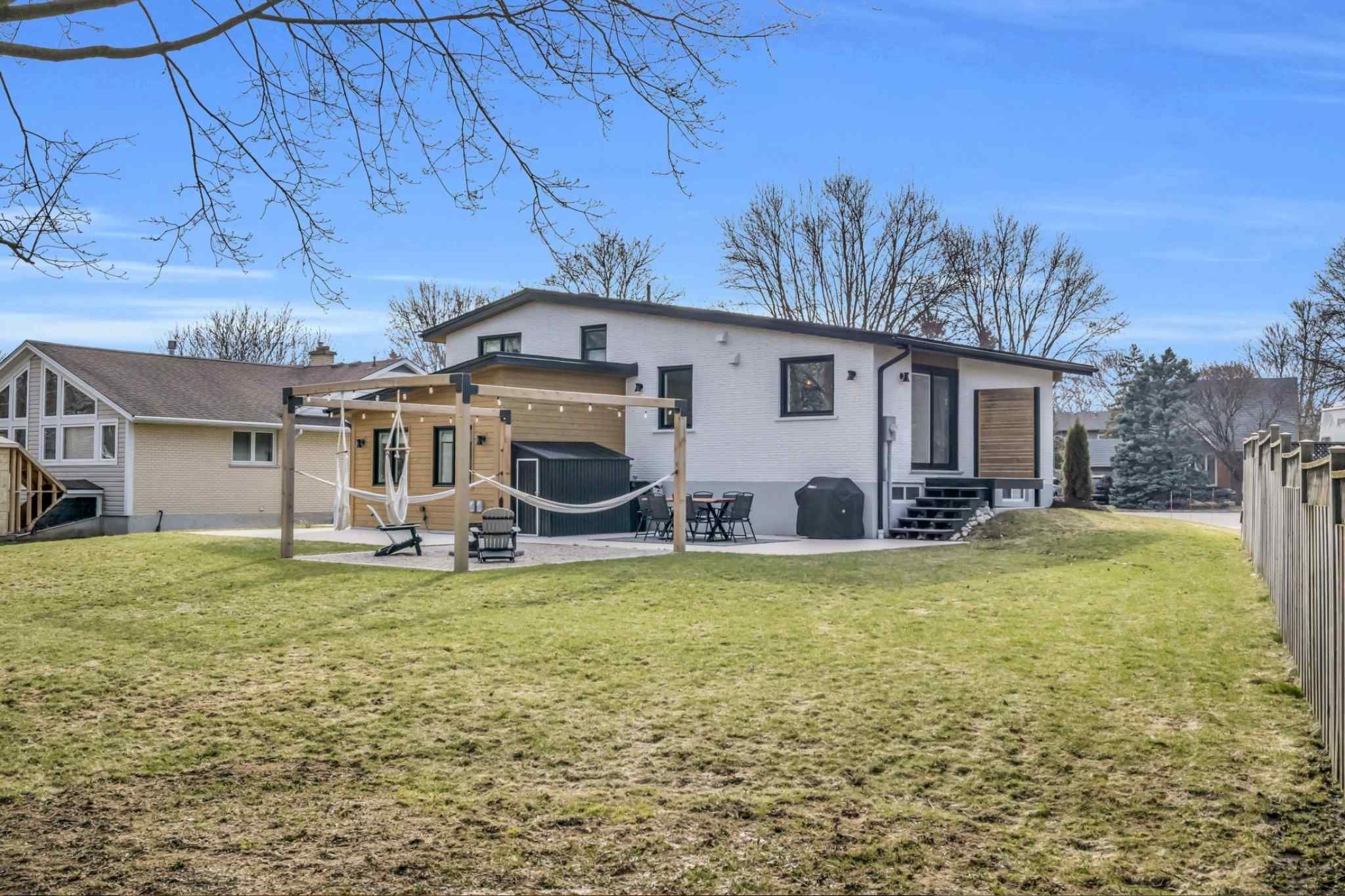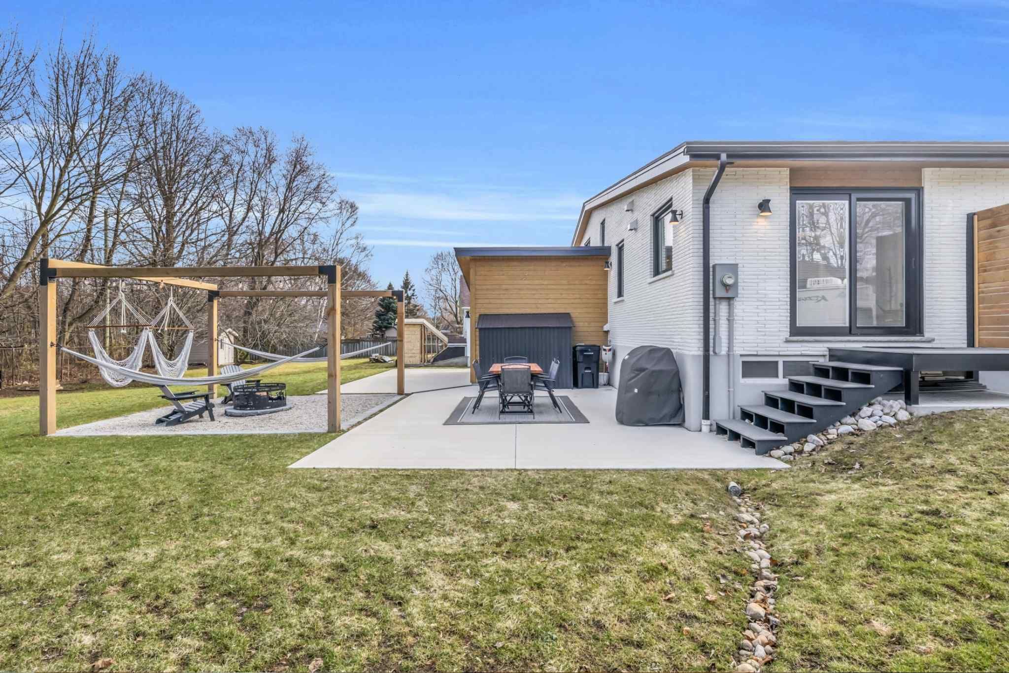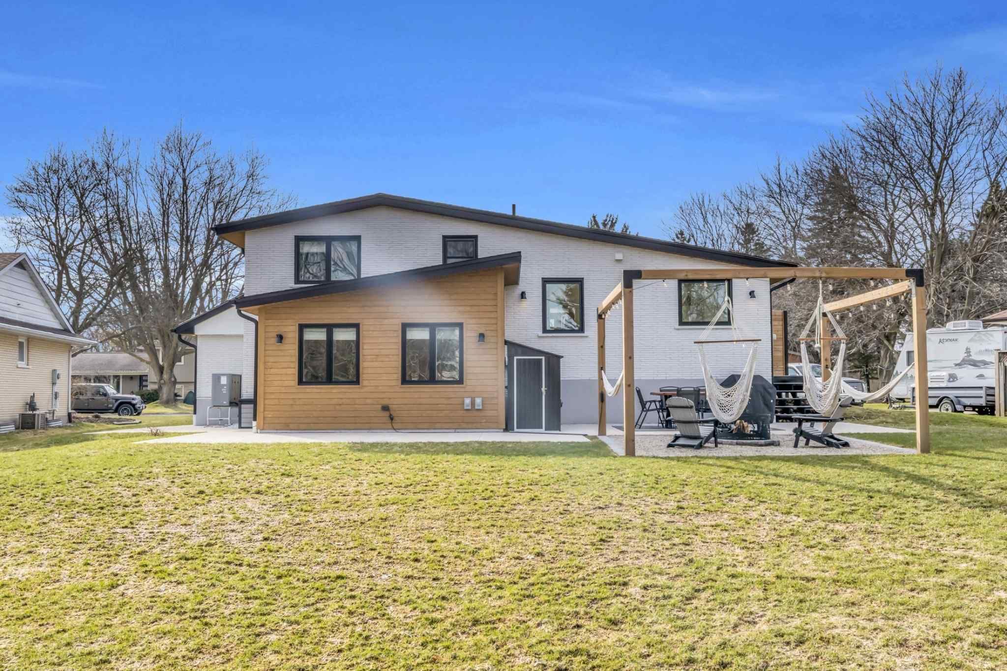 Welcome to 17 bluebird place in elmira-an extensively renovated home set on a premium oversized lot at the end of a quiet cul-de-sac in a mature, family-friendly neighbourhood. Offering approximately 1,860 sq ft of beautifully finished living space, this 3+1 bedroom, 2 bathroom home blends thoughtful design with modern comfort. Fully renovated in 2024, the home showcases a bright, open interior with all new flooring, trim, doors, lighting, and neutral finishes throughout. The custom chef's kitchen is a standout, featuring quartz countertops and backsplash, high-end appliances including an induction range with dual oven/air fryer, custom cabinetry with built-in storage solutions, and a large island with integrated outlets-perfect for everyday living and entertaining. The kitchen flows seamlessly into the dining area with a newly added walkout to the backyard. Both bathrooms have been fully updated with premium finishes, including heated floors, custom marble details, and upgraded fixtures. Additional highlights include a spacious recreation room, a newly added laundry room with custom cabinetry, and a versatile studio space with separate entrance, 3-piece bath, and closet-ideal as a primary suite, guest space, home office, or flex area. Set on an expansive, private lot partially backing onto mature greenspace, the outdoor space offers exceptional privacy and functionality. Enjoy multiple poured concrete patio areas for a swim spa or hot tub, a pergola with hammocks, firepit area, and a refreshed yard. The driveway accommodates up to five vehicles, and the home features new windows, roofing updates, and upgraded 200 amp electrical service with ev capability. Conveniently located close to schools, shopping, and everyday amenities, and just a short drive to waterloo, kitchener, guelph, and beyond, this turn-key home is a rare opportunity to own a thoughtfully updated property in a quiet, established neighbourhood.