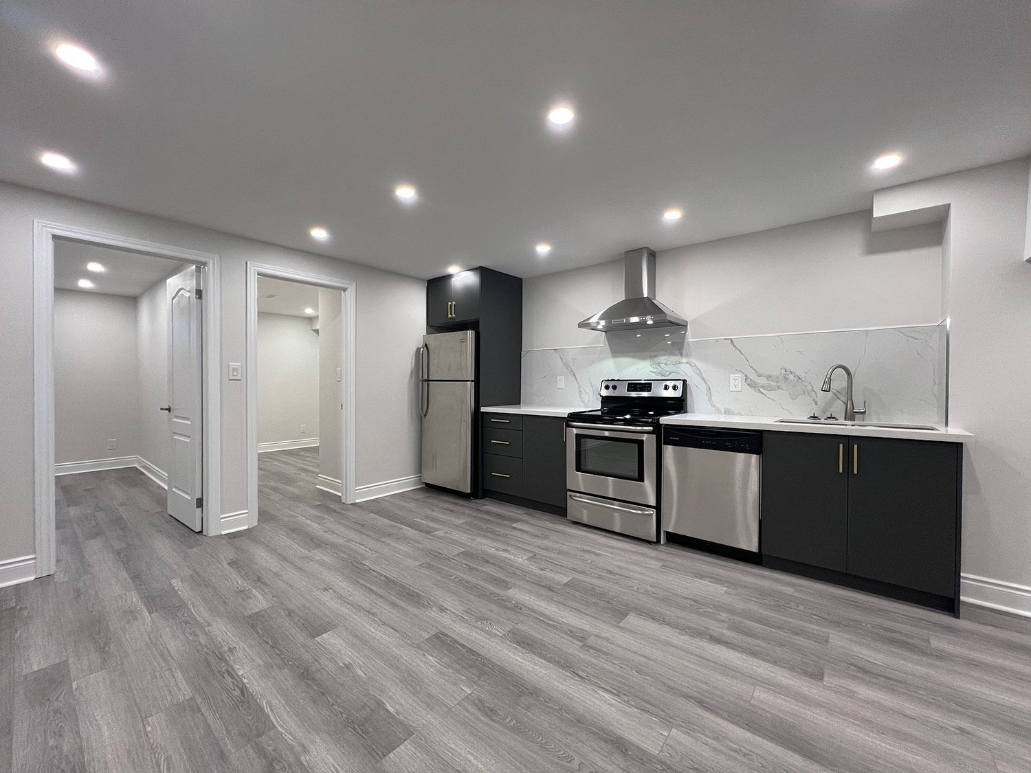 • Modern kitchen features quartz counters and stainless steel appliances.