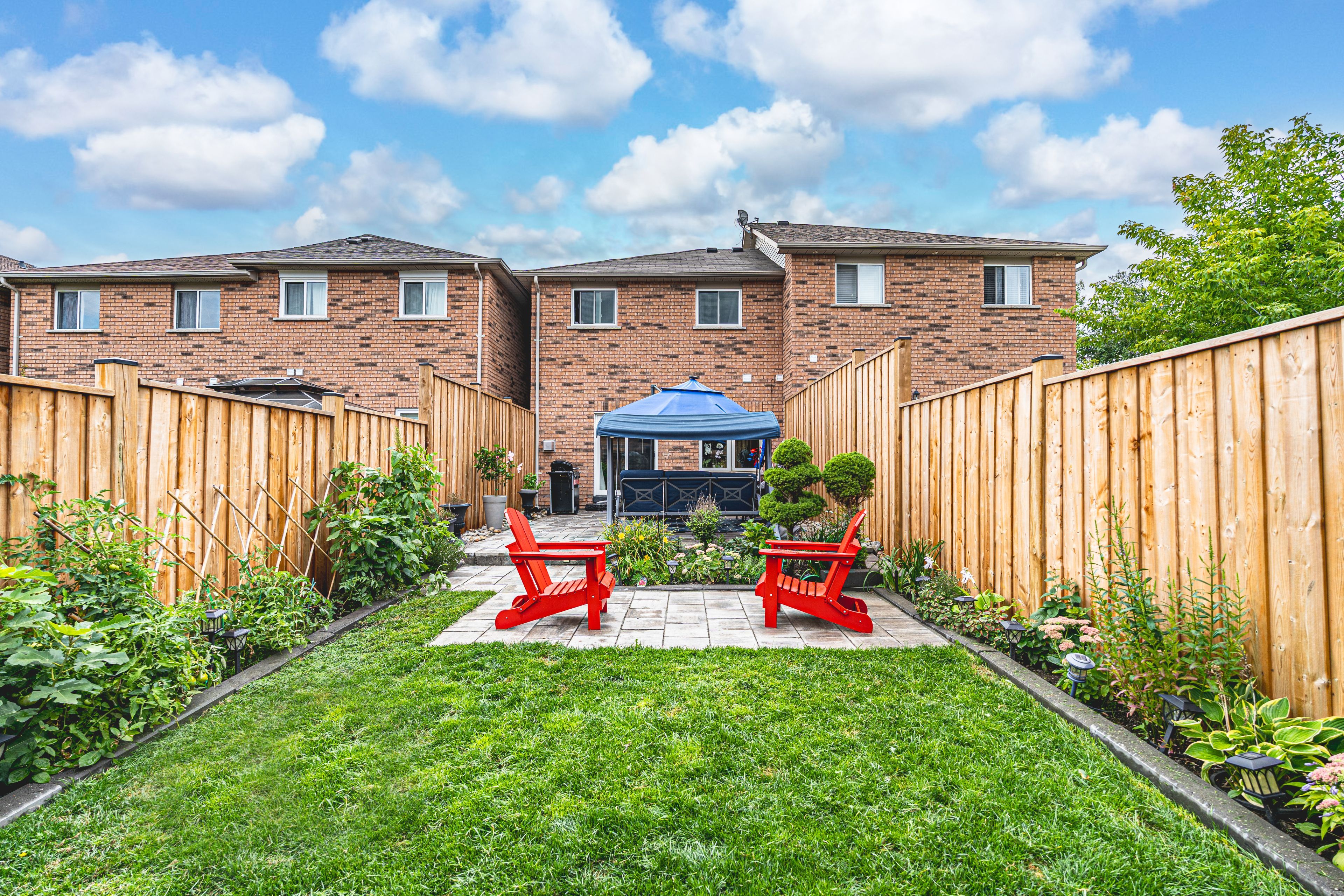 • Fully fenced backyard with patio, shrubs, and garden beds for relaxation.