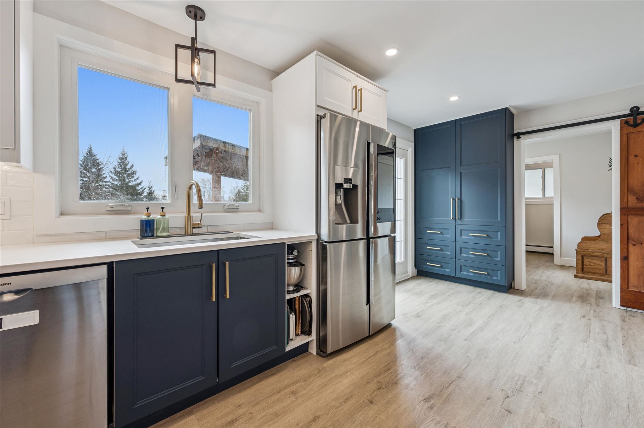 • Bright and modern kitchen with quartz counters and banquette seating.