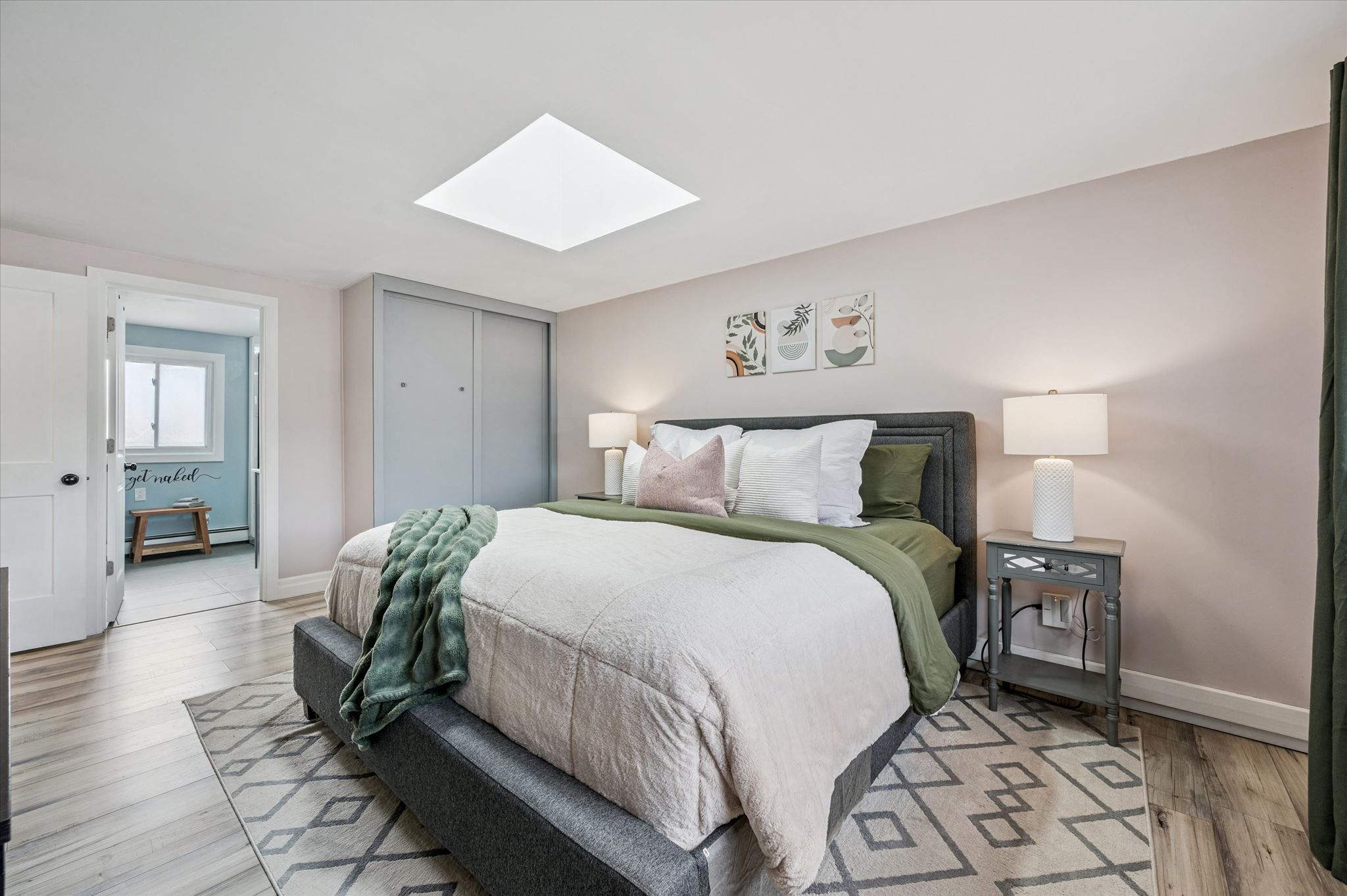 • Bright, modern kitchen with quartz counters and banquette seating.