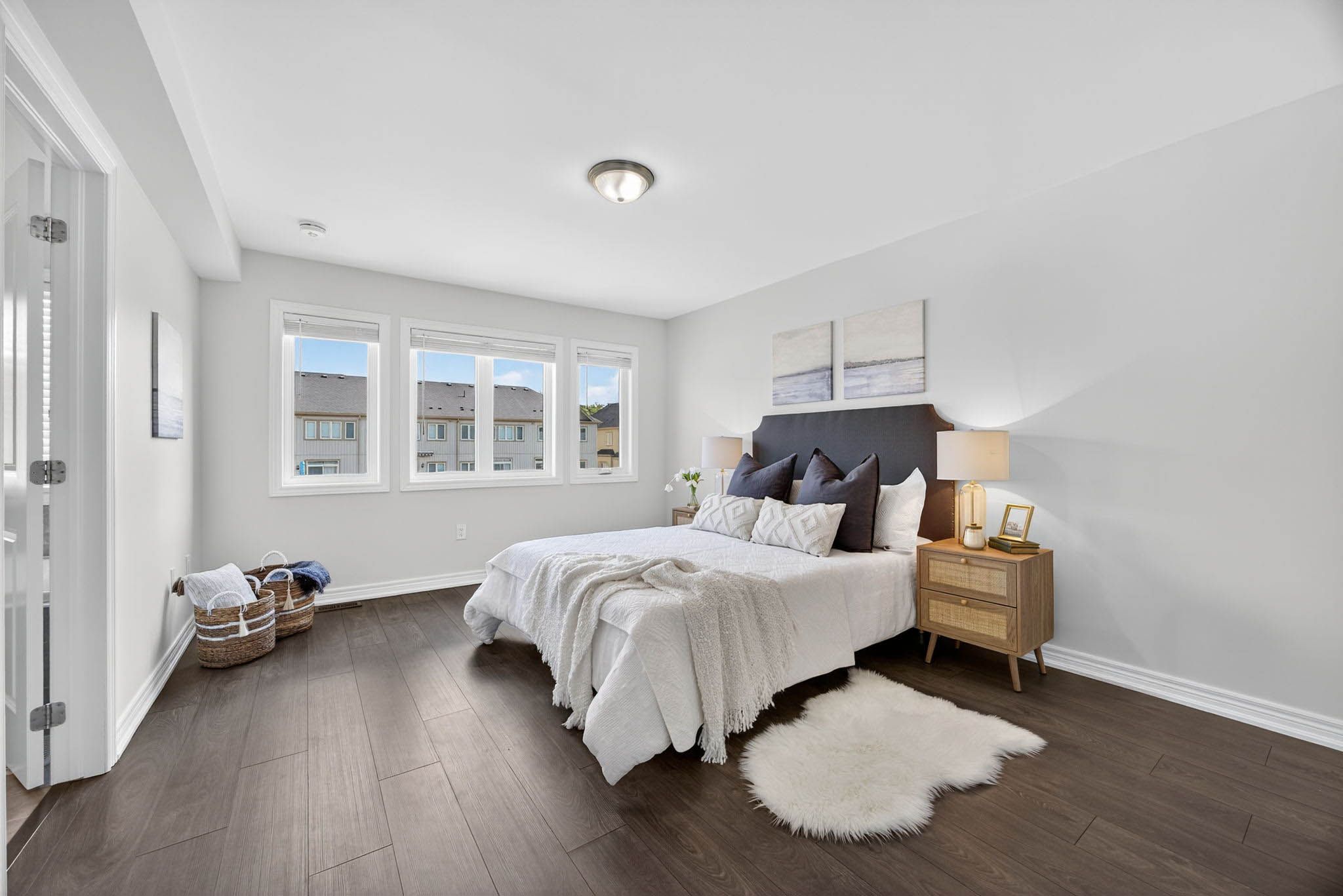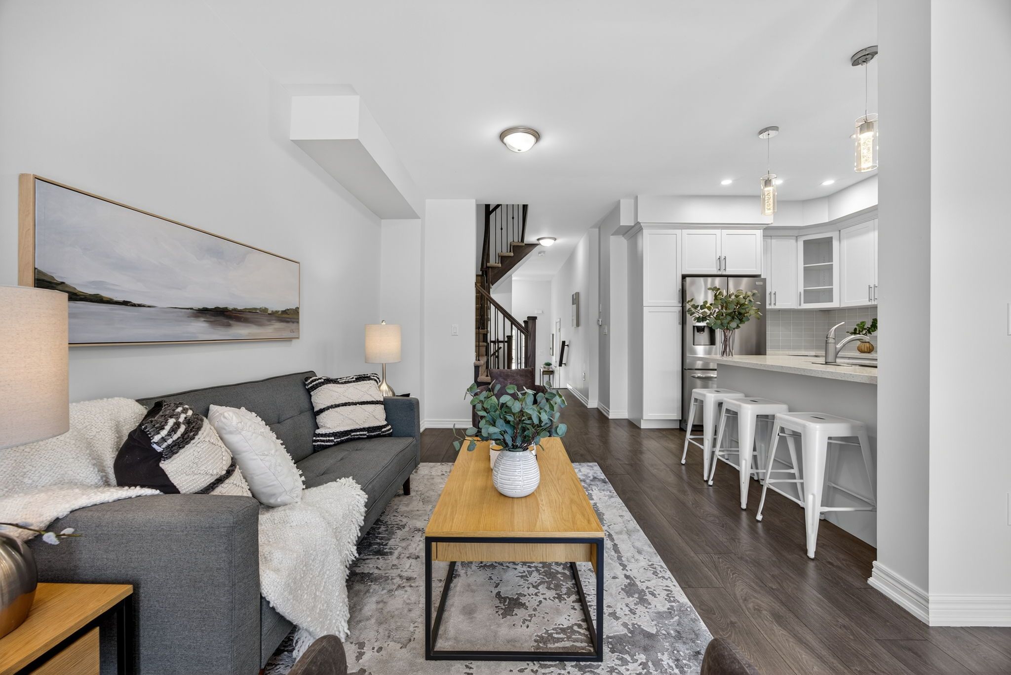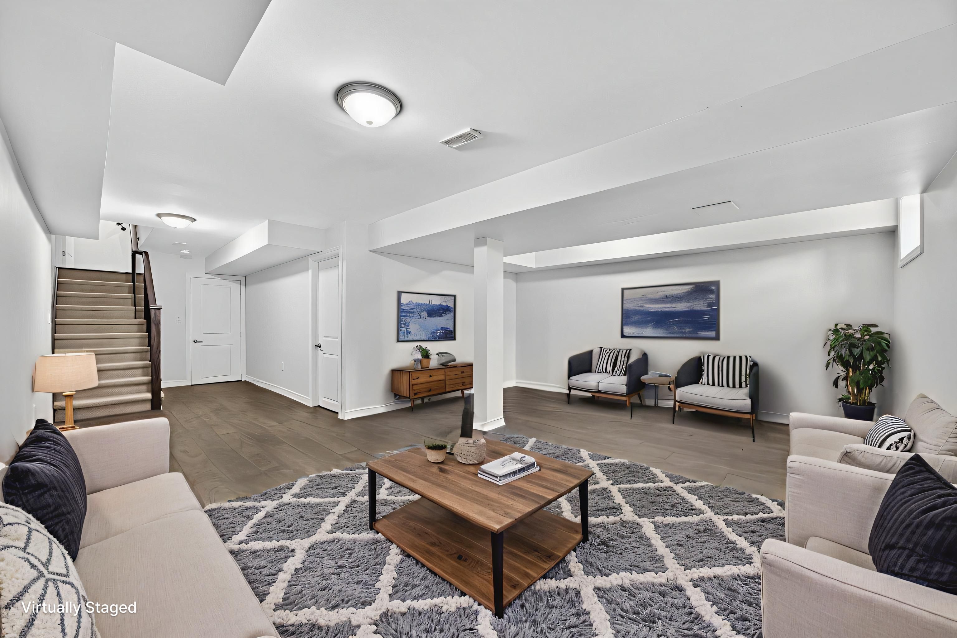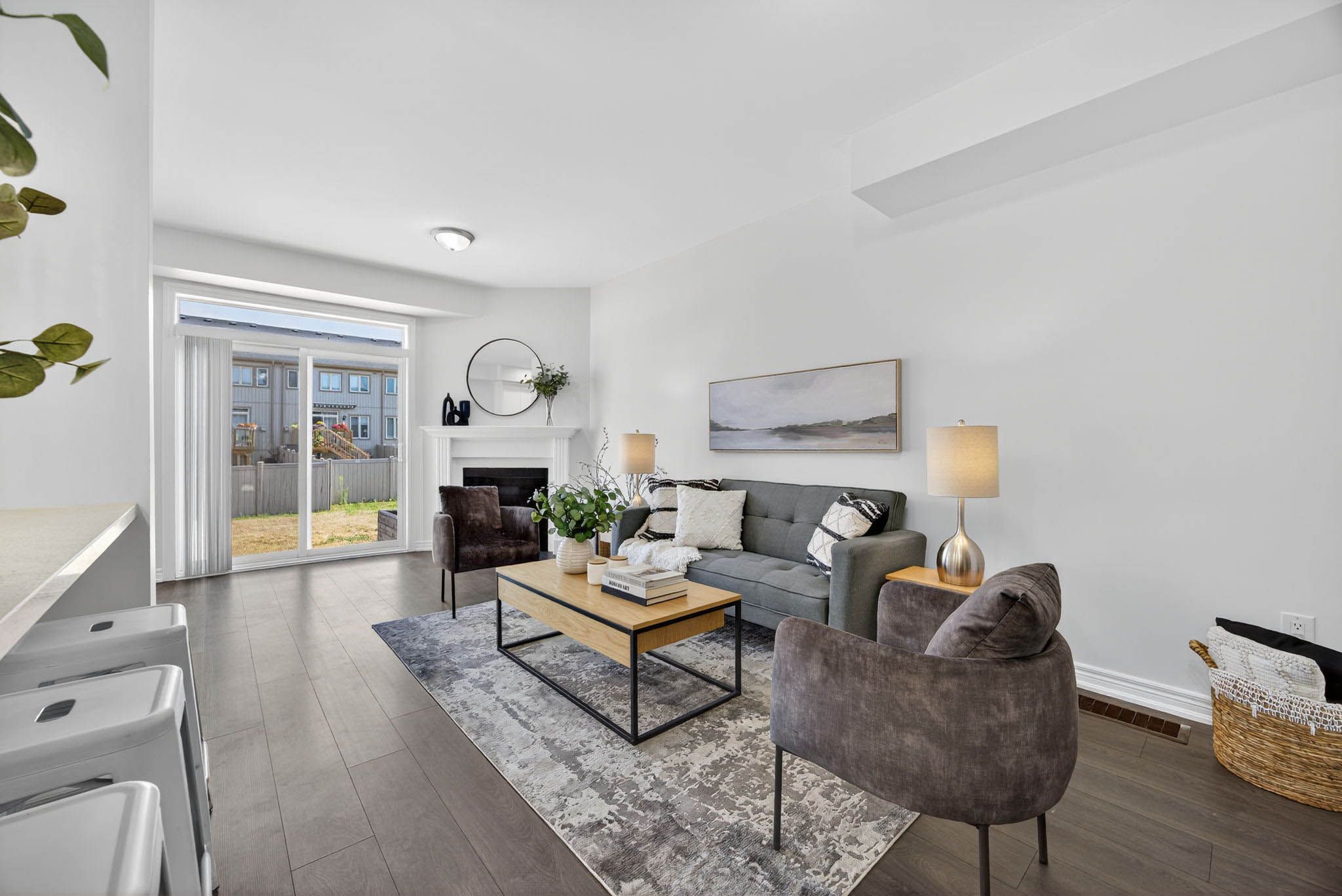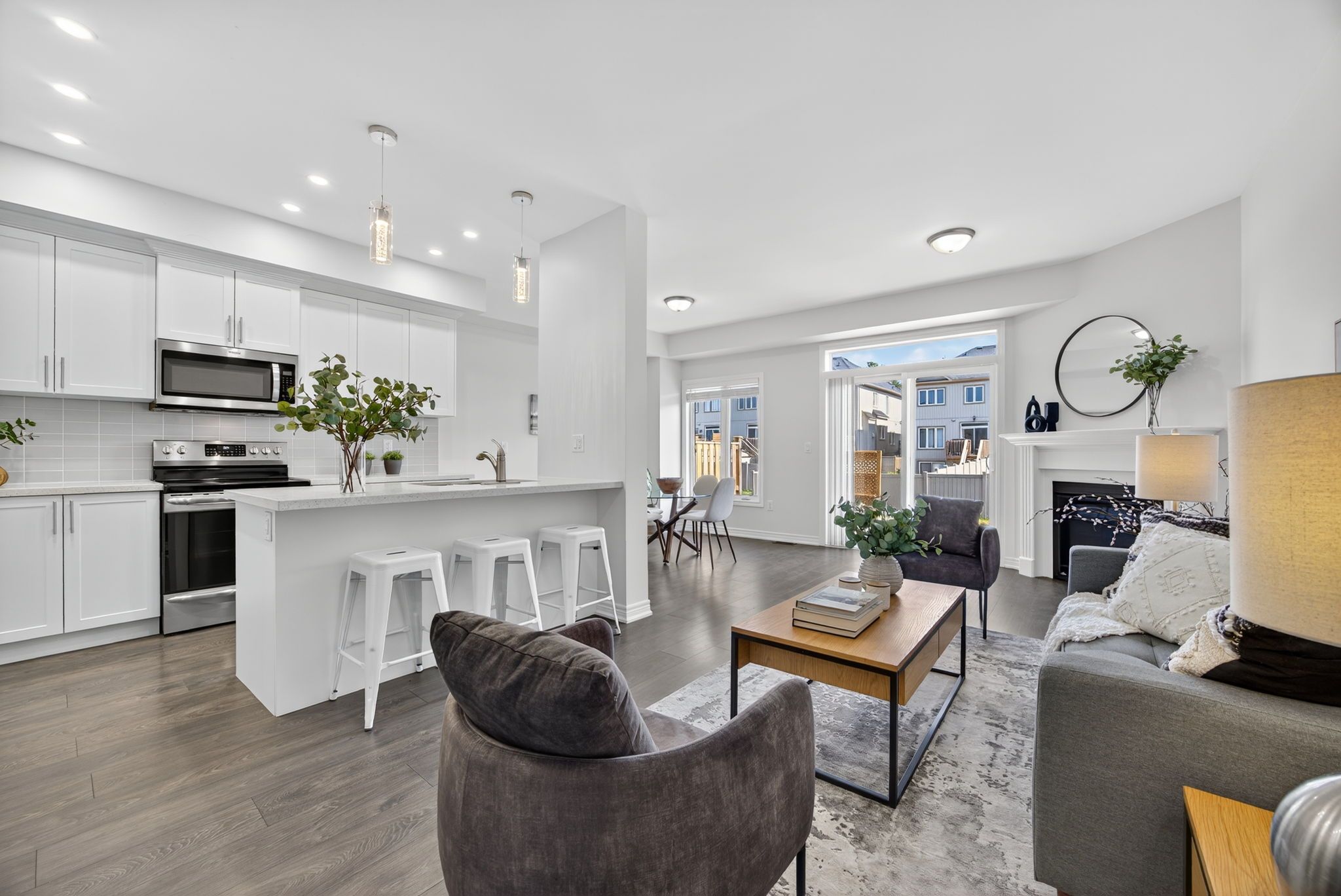Modern comfort and style in this beautifully upgraded townhouse featuring 3 bedrooms, 3 bathrooms, upstairs laundry, and a fully finished basement (with rough in!) perfectly combining function and open concept contemporary design. Situated on a quiet, secluded crescent yet just moments from atherley road, youre only a six-minute drive to downtown orillia with exceptional restaurants, the famous mariposa market, vibrant shops, cafés, and cultural attractions. The main floor impresses with 9-foot ceilings, abundant natural light, and a cozy gas fireplace that sets a welcoming tone when you first walk in. The modern kitchen offers quartz countertops, stainless steel appliances, pot-lights, a sleek subway tile backsplash, and ample cabinetry for storage, meal preparation, or entertaining friends and family! Freshly painted neutral tones and durable dark grey flooring flow throughout, offering carpet-free maintenance, while the upgraded bathrooms feature quartz countertops and thoughtfully selected fixtures throughout the entire home. The primary bedroom includes a large walk-in closet and a luxurious 5-piece ensuite with a tub, glass-enclosed shower, and dual sinks. Inside access to the garage ensures winter convenience, and the rare upstairs laundry adds exceptional practicality. The additional fully finished basement provides ample space for recreation, a home theatre setup, games room, or additional living space. Step outside to enjoy morning walks with your coffee in hand, a 15-minute stroll to moose beach and tudhope park where you can then enjoy the scenic waterfront trails. The location also offers quick access to the orillia waterfront, connecting you to both lake simcoe and lake couchiching for year-round recreation. Nearby grocery stores make daily errands effortless meticulously maintained by the current owner, this upgraded residence combines thoughtful design, premium finishes, and an unbeatable location, making it move-in ready!