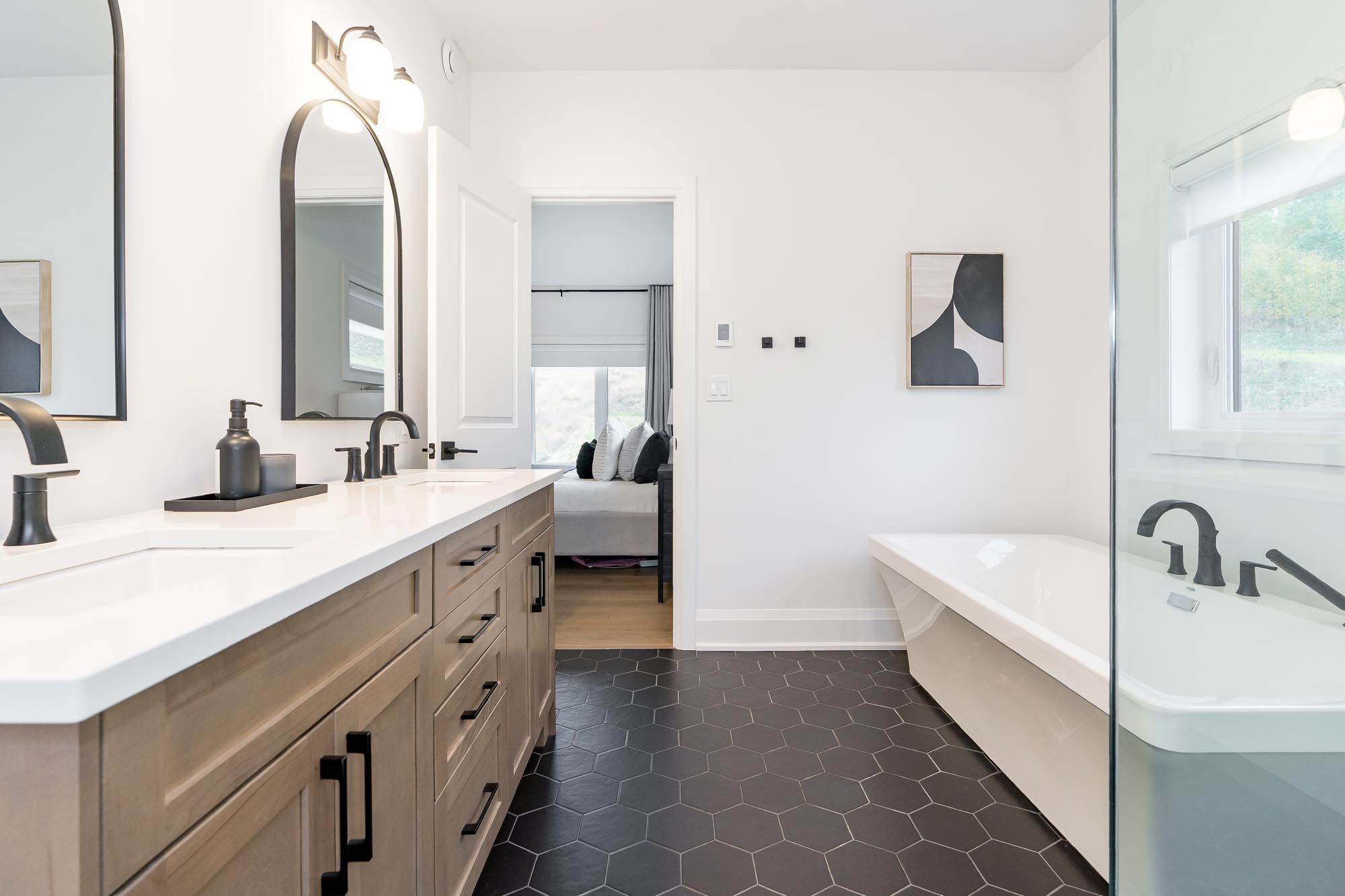 • Upgraded features include heated flooring and high-end KitchenAid appliances.