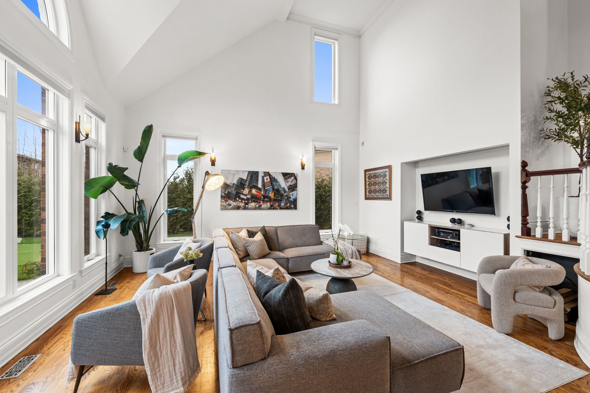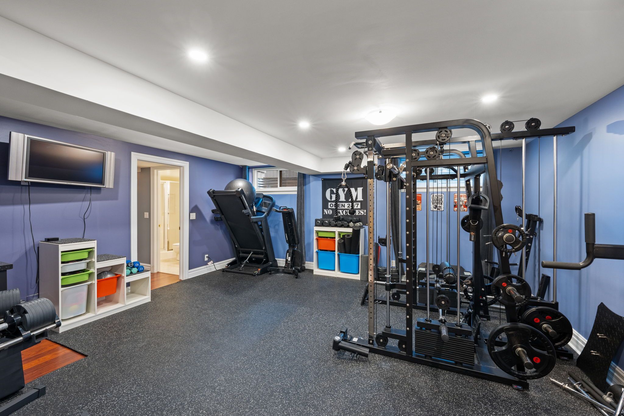 • Lower level features a home gym, recreation space, and a cinema room.