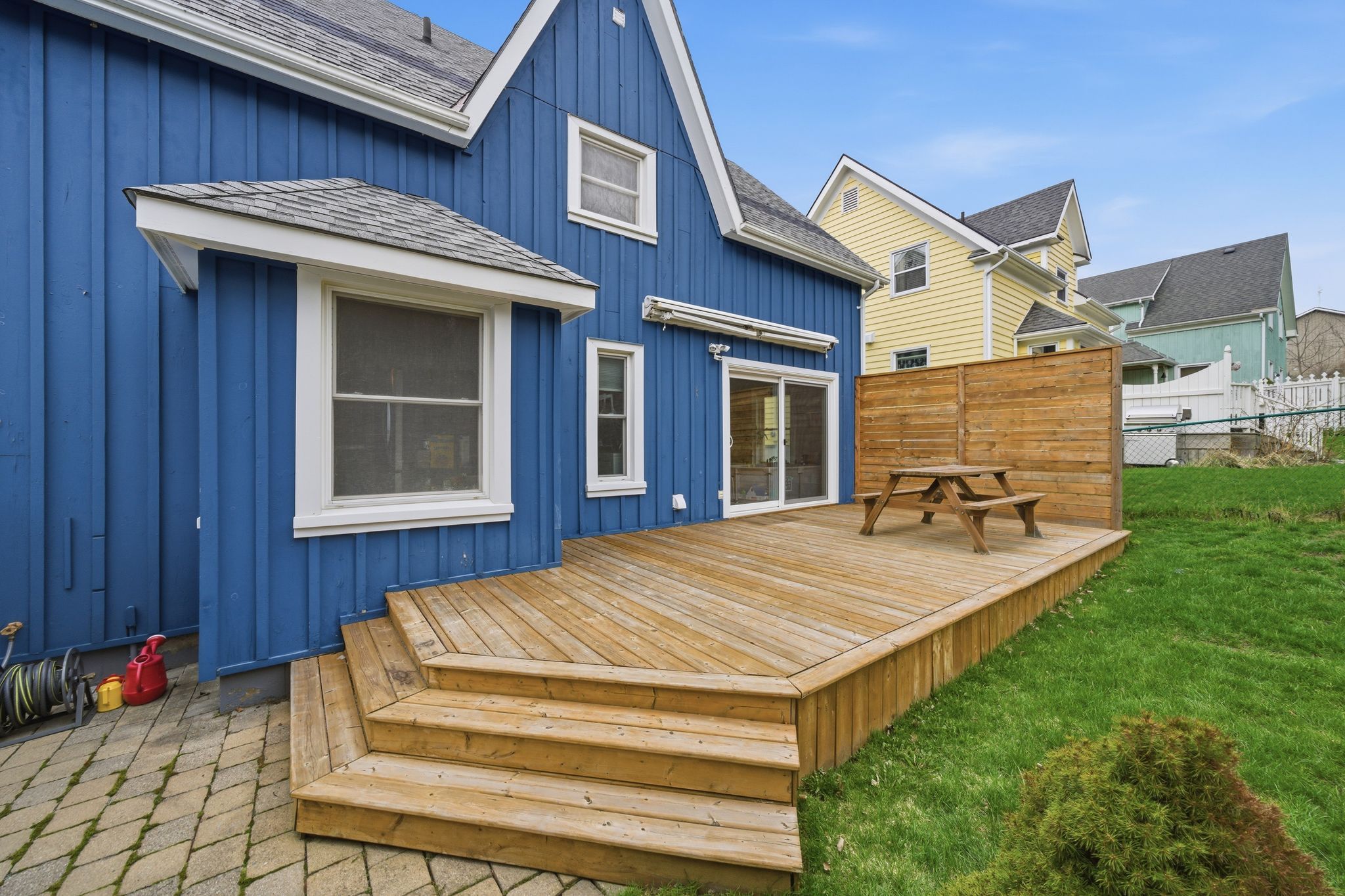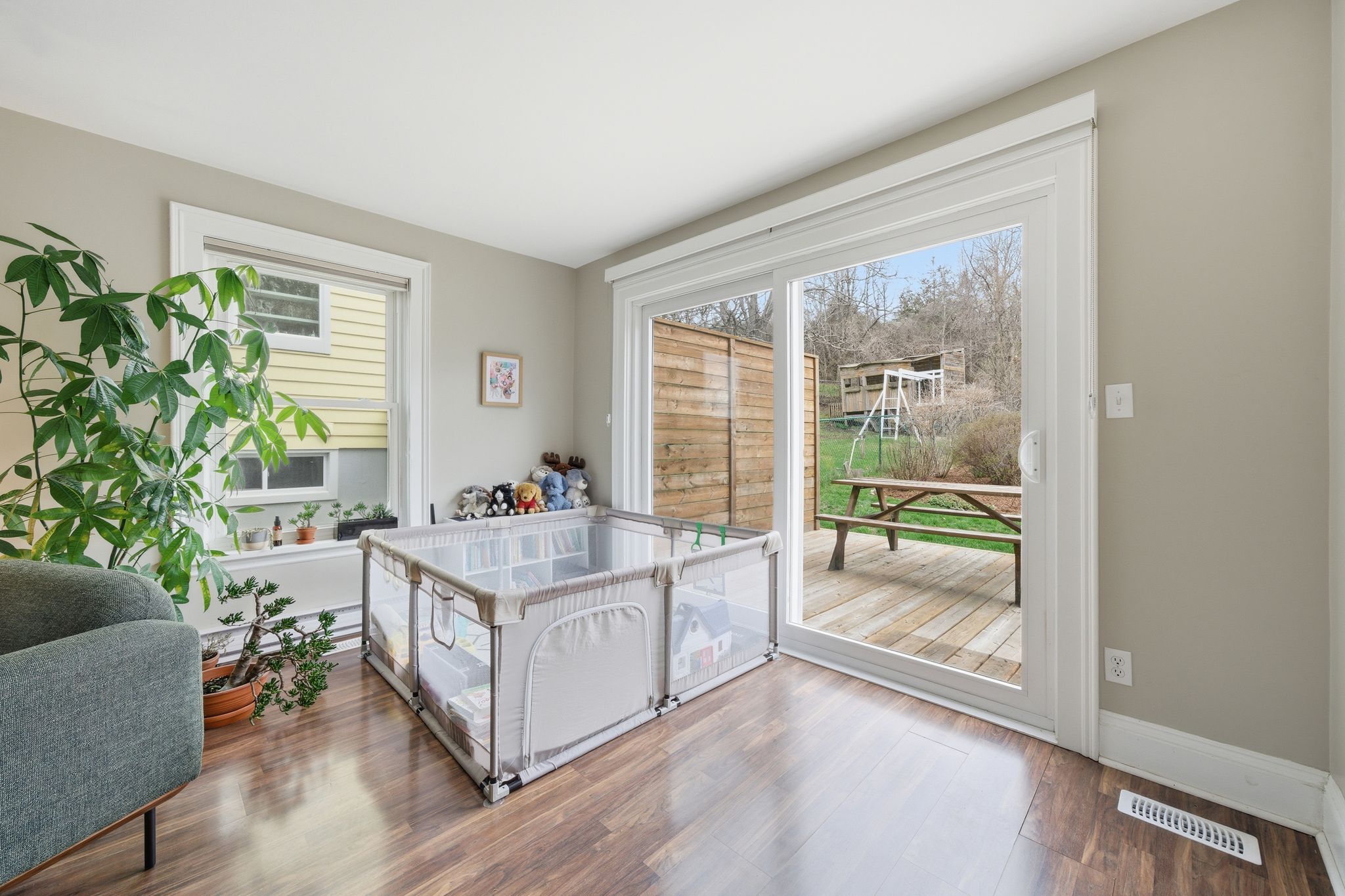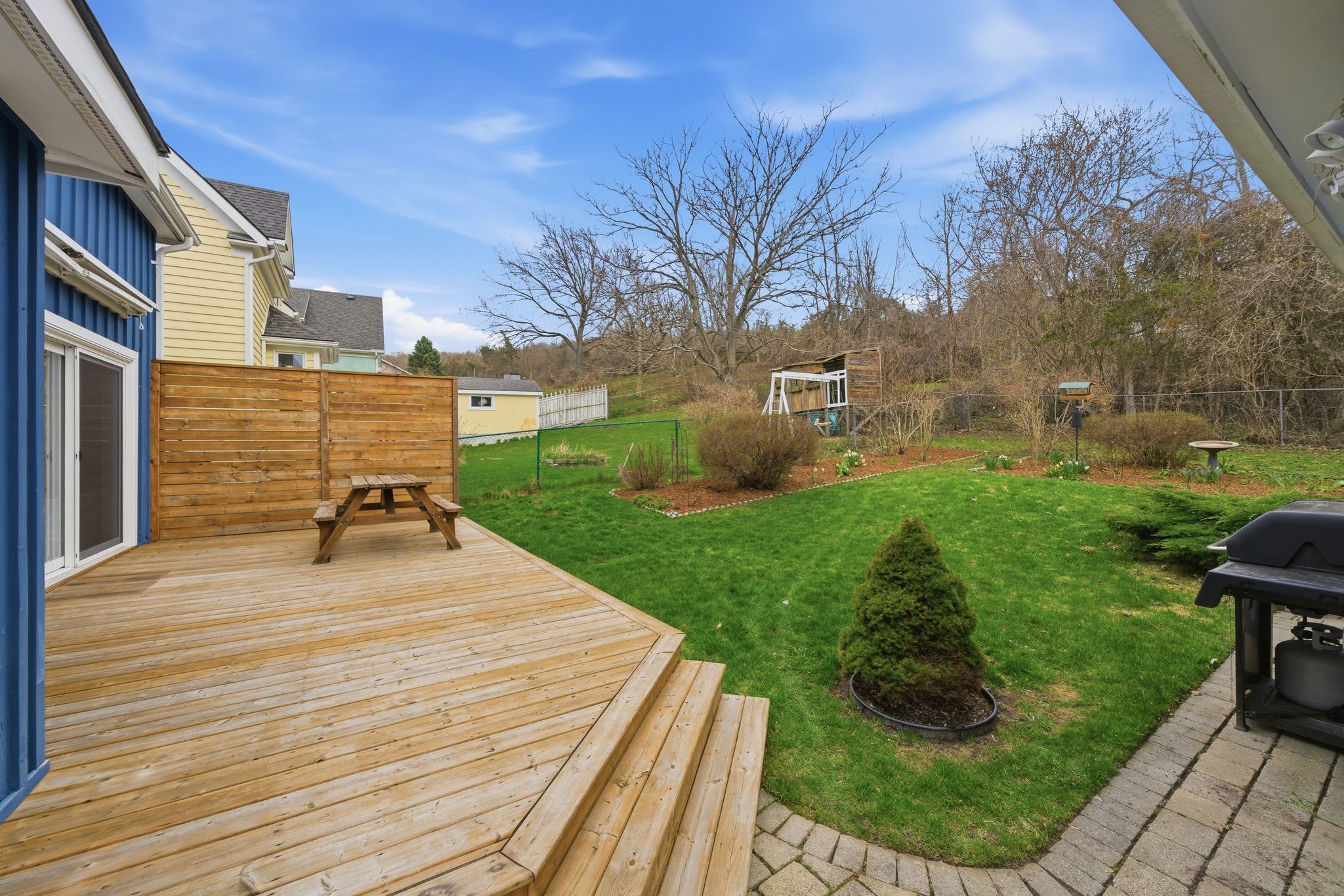 • Large fenced yard backing onto green space for kids and pets.