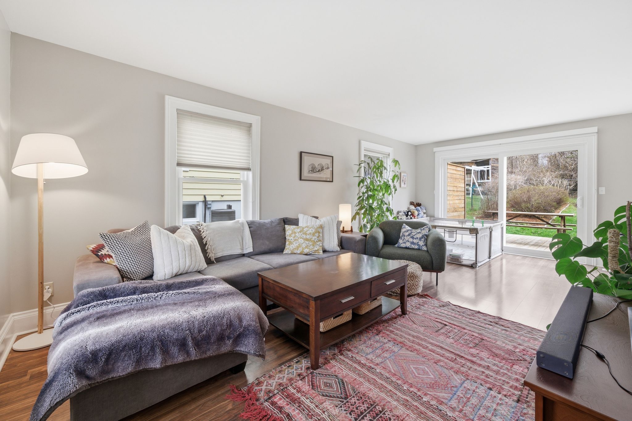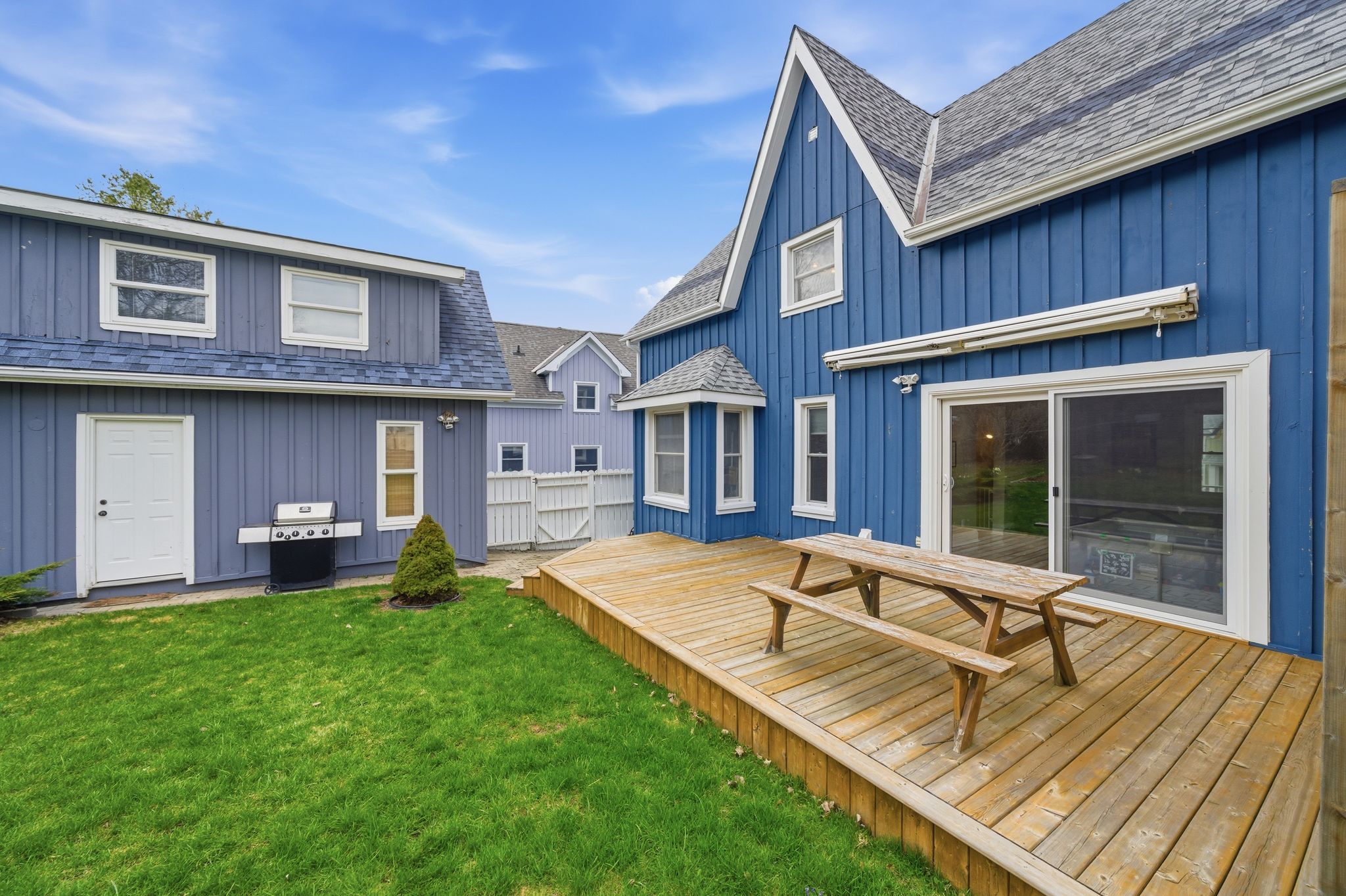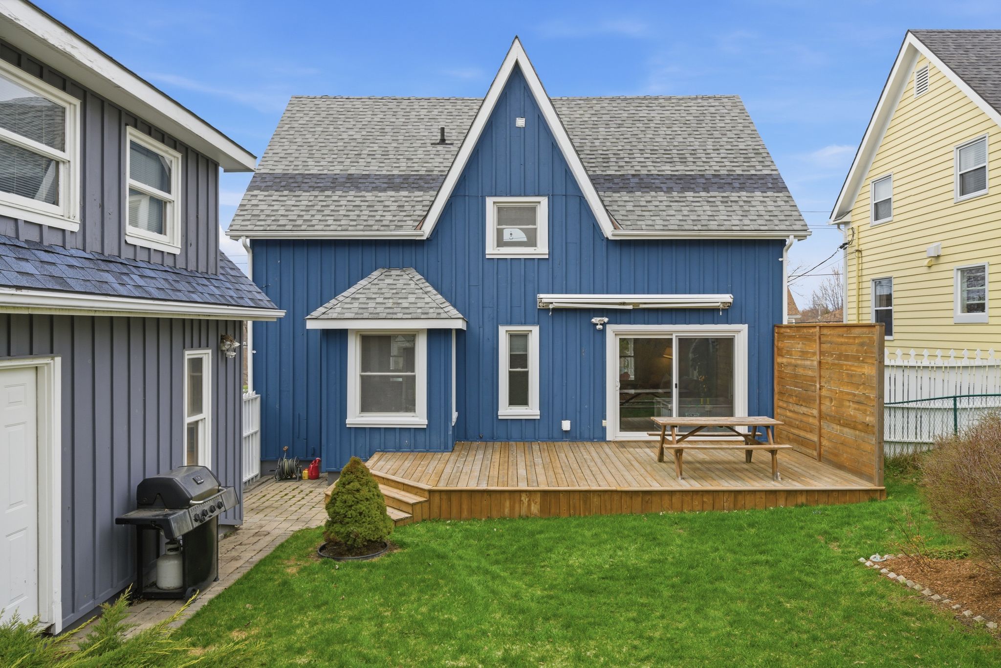 • Large fenced yard backing onto green space for kids and pets.