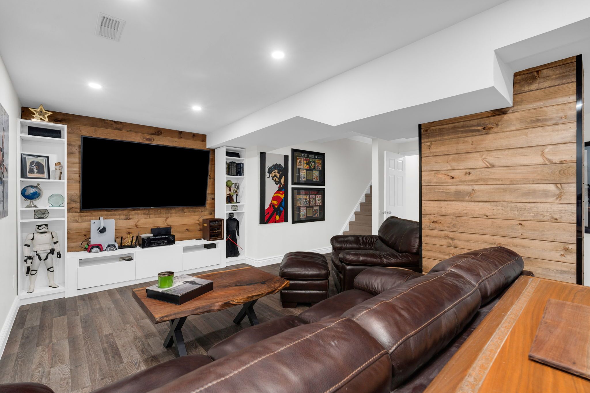 • Finished lower level with extra bedroom, wet bar, and large rec room.