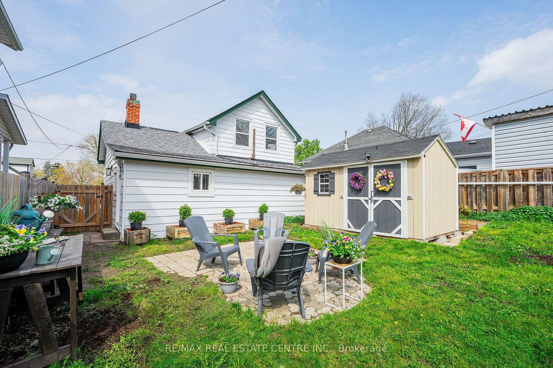 • Fully fenced backyard with stone patio and storage shed for outdoor living.